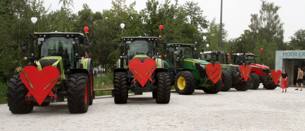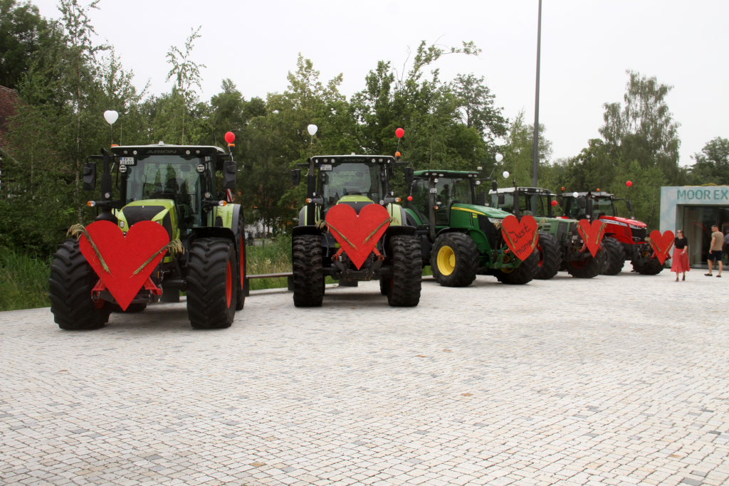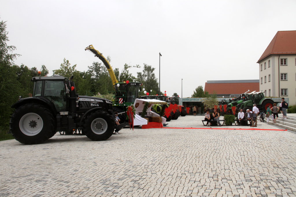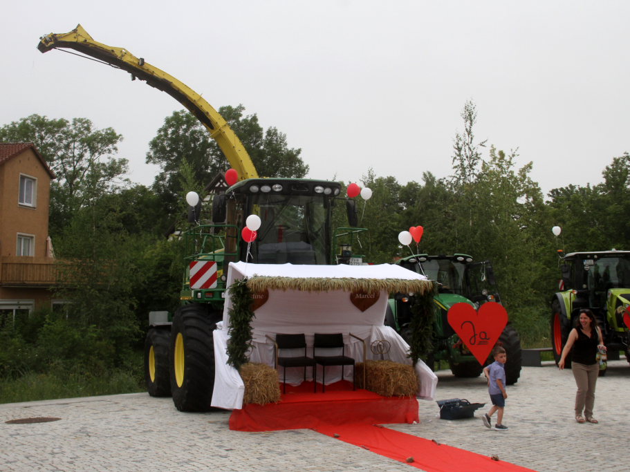 Weniger selbstverständlich waren die elf Riesengefährte, die vor der Kirche auf dem Klosterplatz und an der Achseite parkten. Zehn Traktoren, frisch geputzt und chromglänzend mit einem roten Herz versehen sowie ein Mähdrescher mit einem einer Hollywoodschaukel nicht unähnlichen Vorsatz mit zwei Polstersitzen über denen die Namen der beiden Brautleute prangten, zogen die Blicke der Schaulustigen auf sich und stahlen sogar dem Brautauto, einem vor der Kirchentreppe geparkten Porsche, die Show.