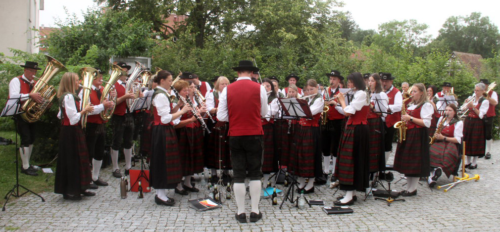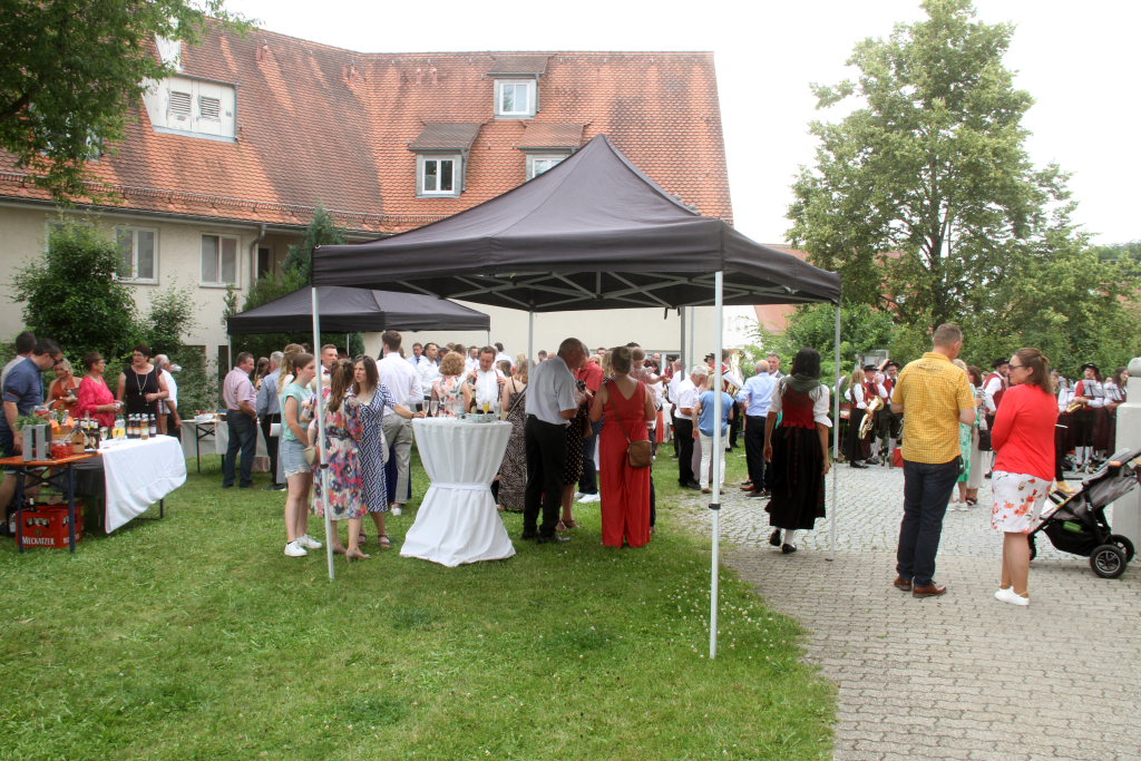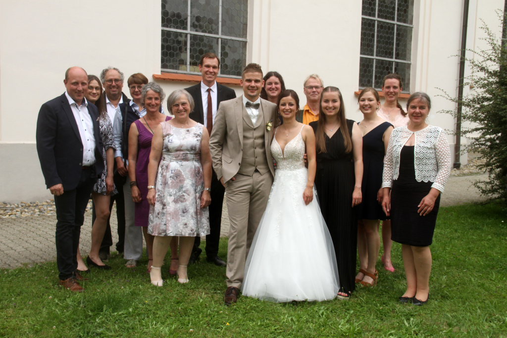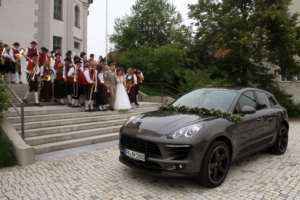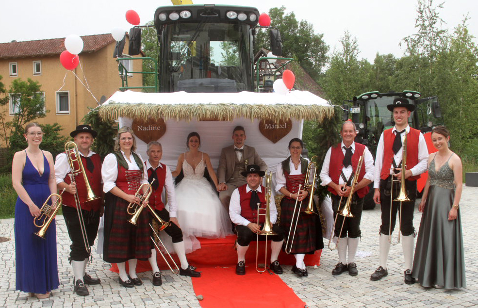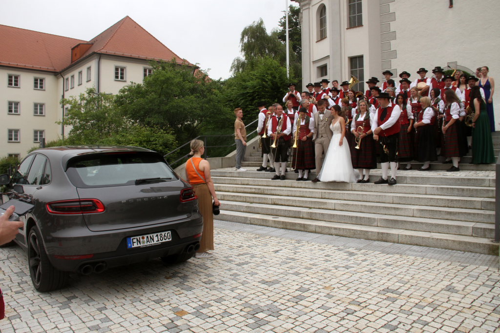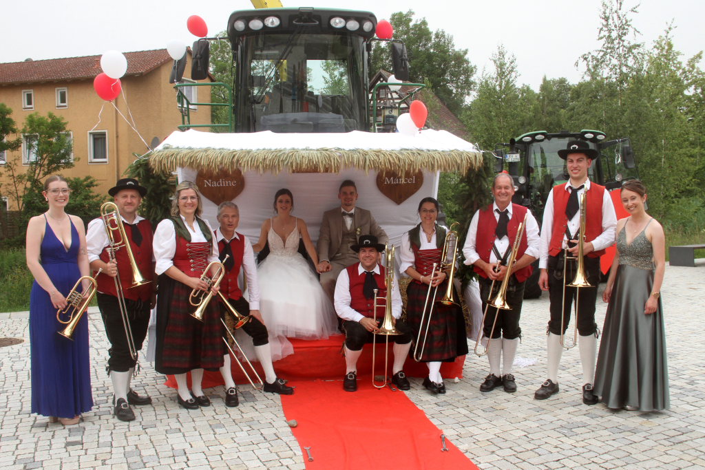 Bad Wurzach – Es war eine richtige Musikantenhochzeit, die da an diesem extrem heißen Samstagnachmittag in und danach vor St. Verena stattfand. Aber nicht nur das: Zu Ehren der Brautleute Nadine Riss und Marcel Jäger fuhren auf dem Klosterplatz ganz große Gefährte auf.