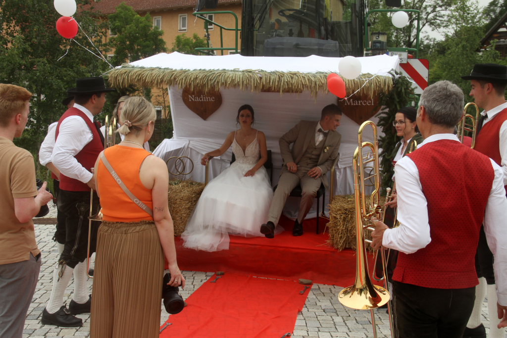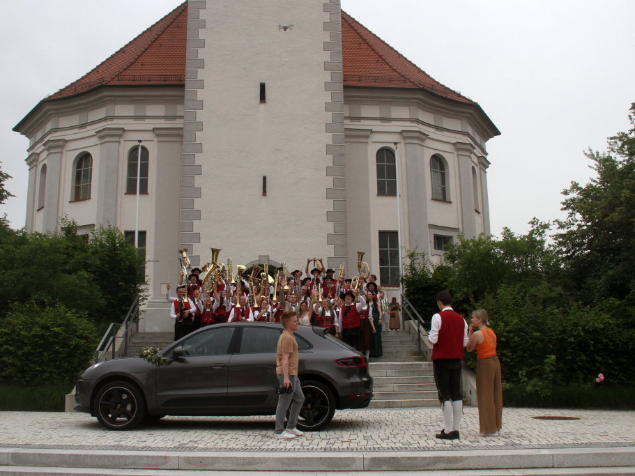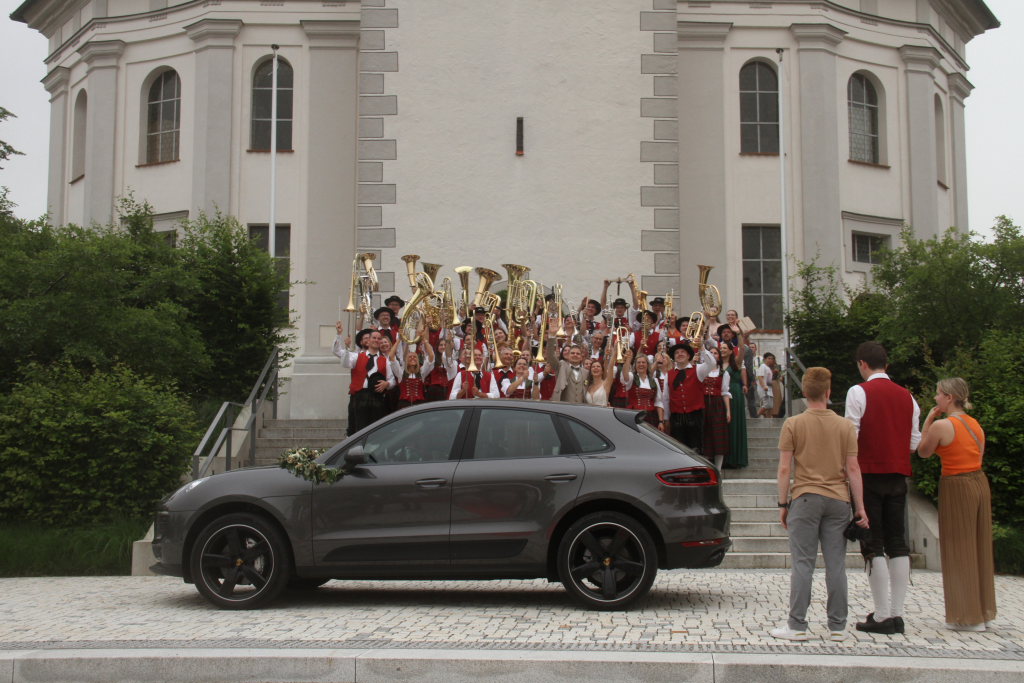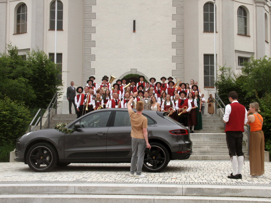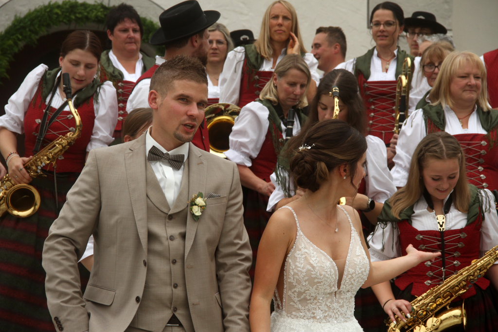 Nachdem einem Musikanten-Gruppenbild auf der Kirchentreppe, für das auch noch zusätzlich eine Fotodrohne zum Einsatz kam, schritt das Brautpaar über den ausgelegten roten Teppich zu einer überdimensionalen Hollywoodschaukel, wo die Fotografen noch ganz spezielle Registerfotos anfertigten.