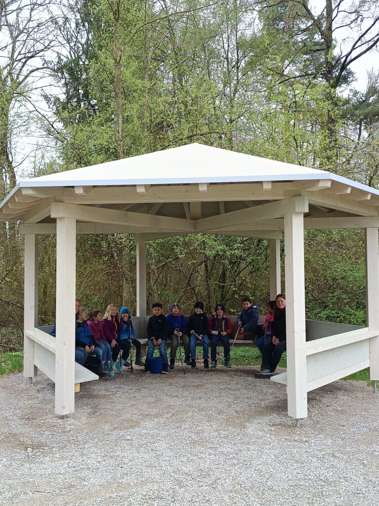 Der großzügig gestaltete Pavillon ist an fünf Seiten mit Sitzbänken ausgestattet und bietet so ausreichend Platz für Besucherinnen und Besucher. Zudem schützt er vor Sonne und Regen und wird deshalb zu einem wichtigen Ort für Lern- und Freizeitangebote des Naturschutzzentrums: Schulklassen, Kindergärten und die Kinder des Kinder-Naturschutz-Treffs können den Pavillon für spannende Umweltbildungsmaßnahmen nutzen. Gleichzeitig dient er als Rastplatz für Spaziergängerinnen und Spaziergänger im Kurpark.