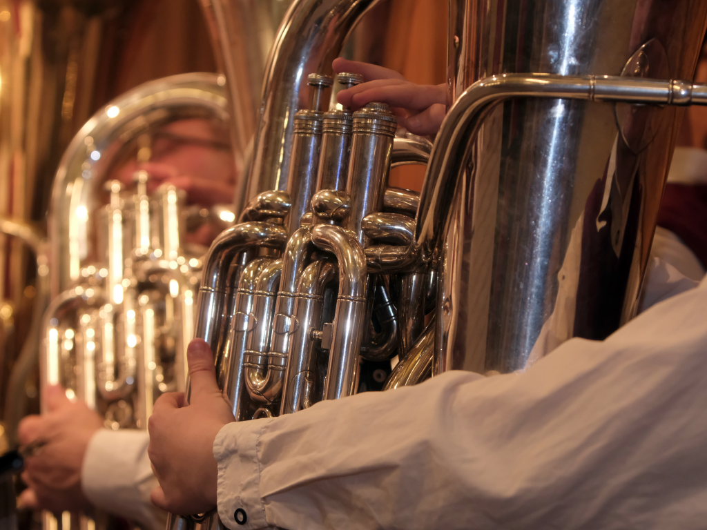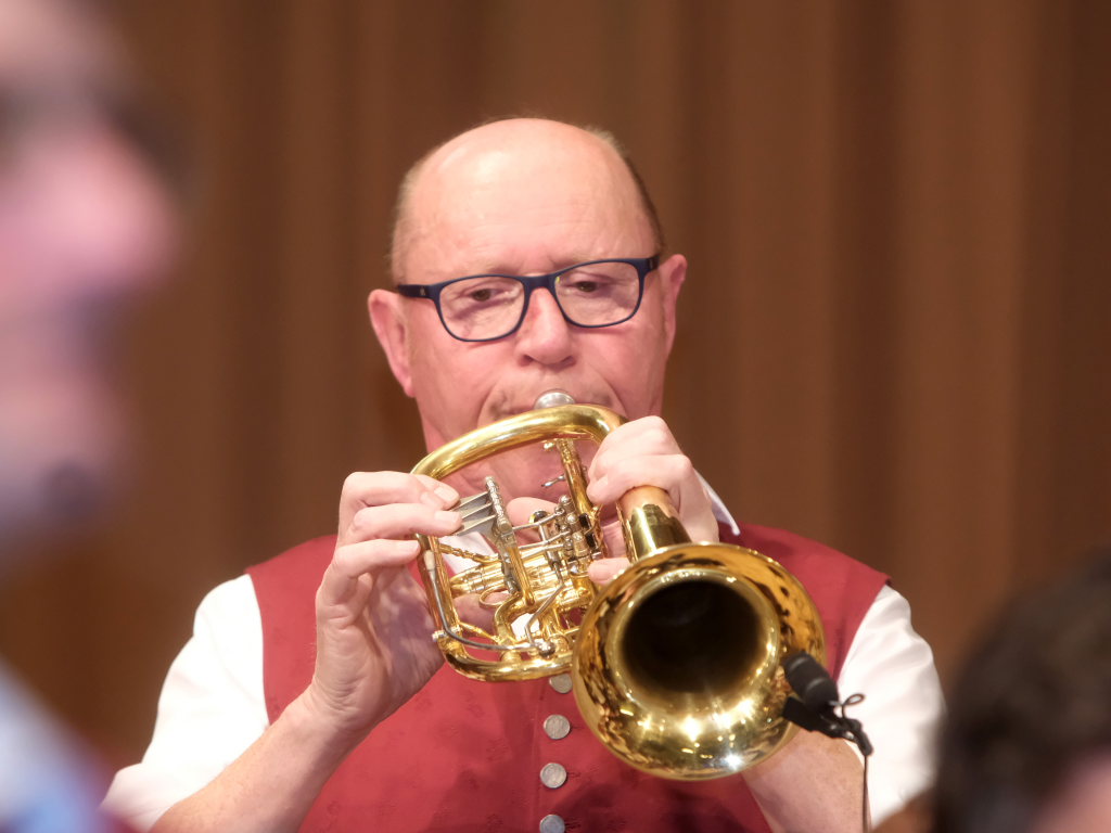 Kurz vor dem Umbau auf die kleine Besetzung konnte sich Gebhard Kuhn mit seinem Flügelhorn bei Gabriellas Song als Solist auszeichnen. Denn für das folgende Showprogramm wurde auf der Bühne jeder Quadratzentimeter Platz gebraucht.