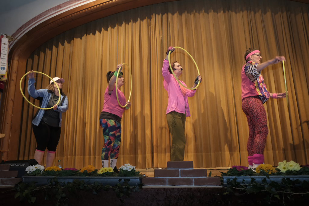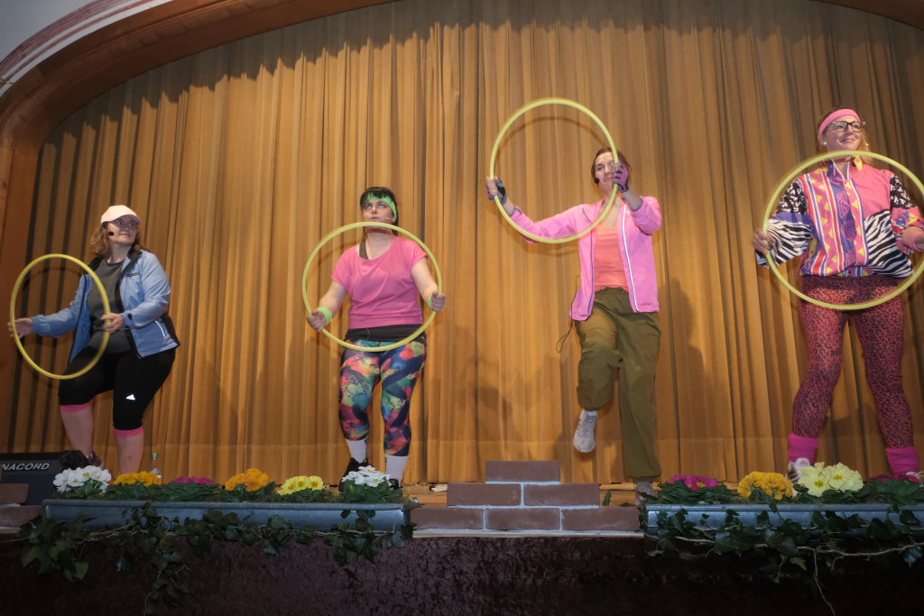 Nach ein paar Blasmusikklassikern, wie dem Bayrischen Defiliermarsch oder der Weinkellerpolka, war die Bühne frei für Anthony und seine Mädels, die ebenfalls schon seit vielen Jahren zum „Inventar“ des Bockbierfestsamstagabends gehören. Thema in diesem Jahr: „Fitness“, um im Sommer im Bikini wieder eine gute Figur zu machen. Anstelle des schwer zubändigenden Hula-Hoop-Reifens fanden die Mädels eine viel pragmatischere Lösung…
