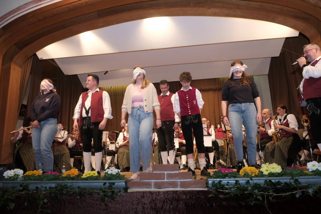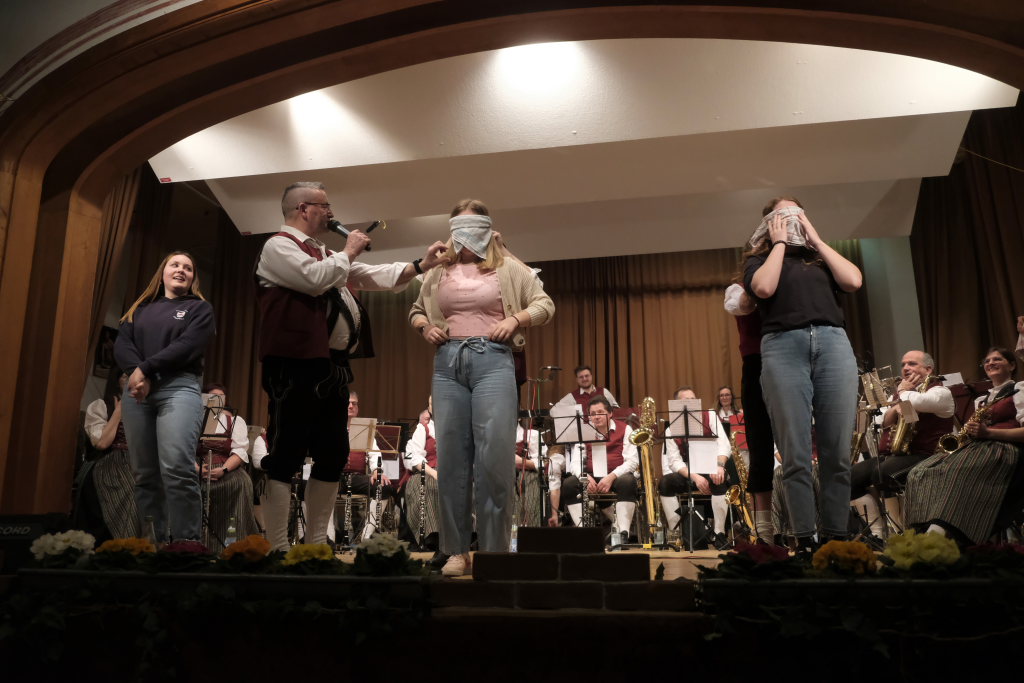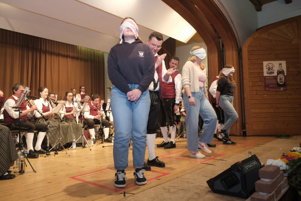 Was eine gute Marschausbildung wert ist, zeigte sich beim diesjährigen Publikumsspiel: Zwei Damen des Musikvereines Arnach schafften es problemlos, mit verbundenen Augen sich innerhalb des winzigen Quadrates zum Marsch dem Land Tirol die Treue auf der Stelle zu marschieren, ohne es zu verlassen. Die Dritte im Bunde legte dagegen sich im Kreis drehend „eine kleine Weltreise“ zurück: O-Ton Freddy Holzmüller. Einen klaren Sieger und einen ebenso klaren Verlierer sah man dagegen bei den männlichen Gegenstücken.