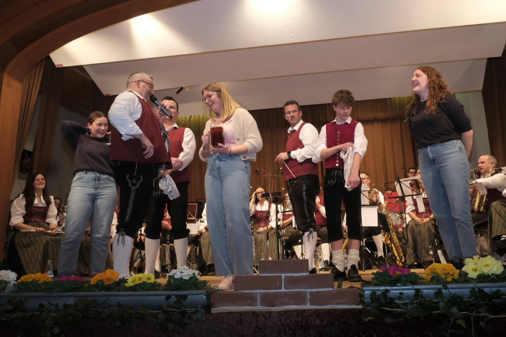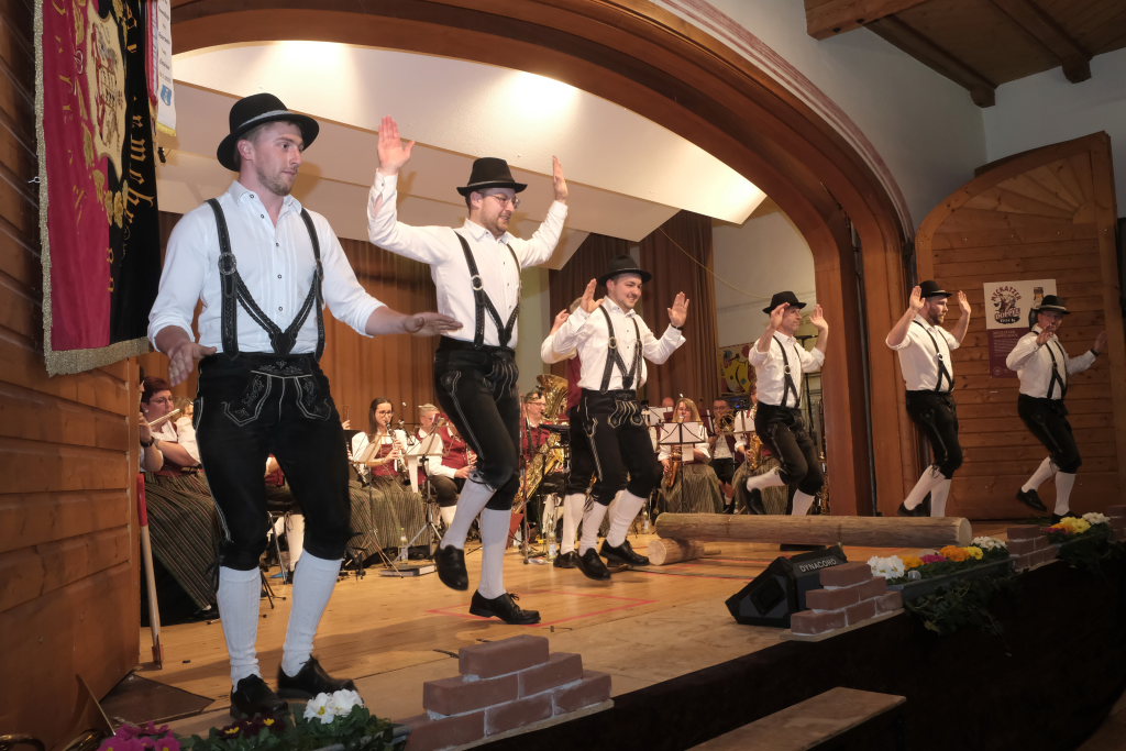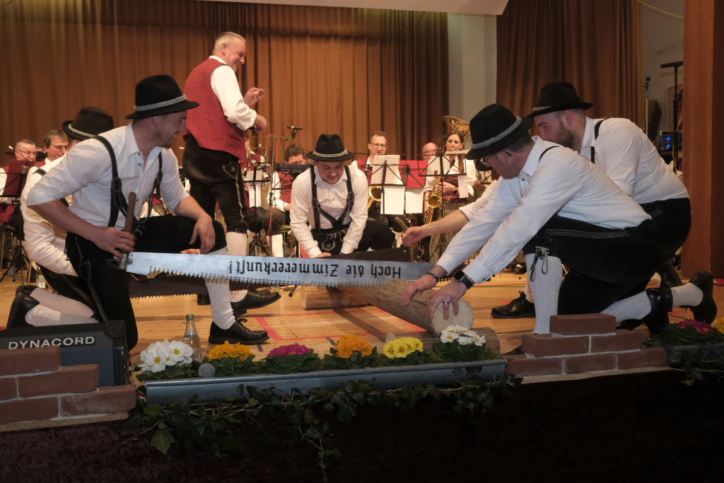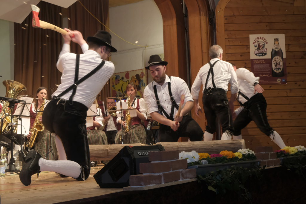 Beim letzten Programmpunkt des Showteiles flogen buchstäblich die Fetzen: Die Tiroler Holzhackerbuam sägten und hackten zwischen ihren gekonnten Schuhplattler-Einlagen an einem echten Holzbalken, dass die Hackschnitzel und Sägespäne nur so flogen. Und welcher Musiker träumt nicht ab und zu davon, mit seinem Dirigenten einfach mal Schubkarren zu fahren und ihm den Hintern zu versohlen: Diese Gelegenheit bot sich tatsächlich einem von ihnen bei einer Schuhplattler-Figur, als Bernd Schosser sein Partner war.