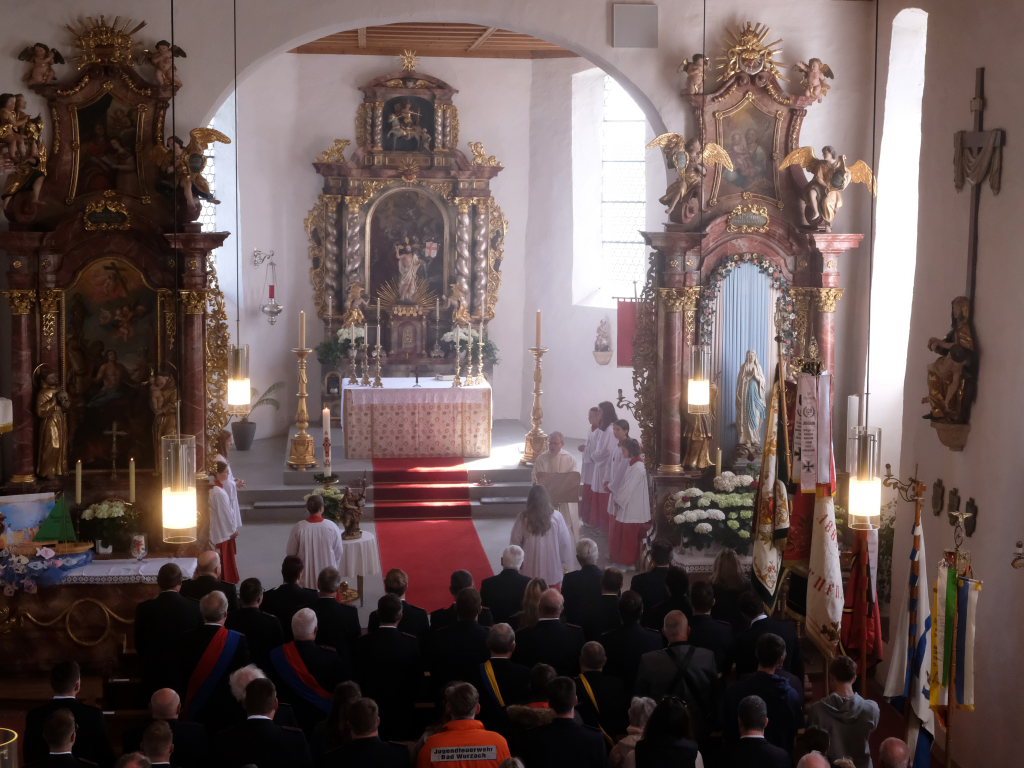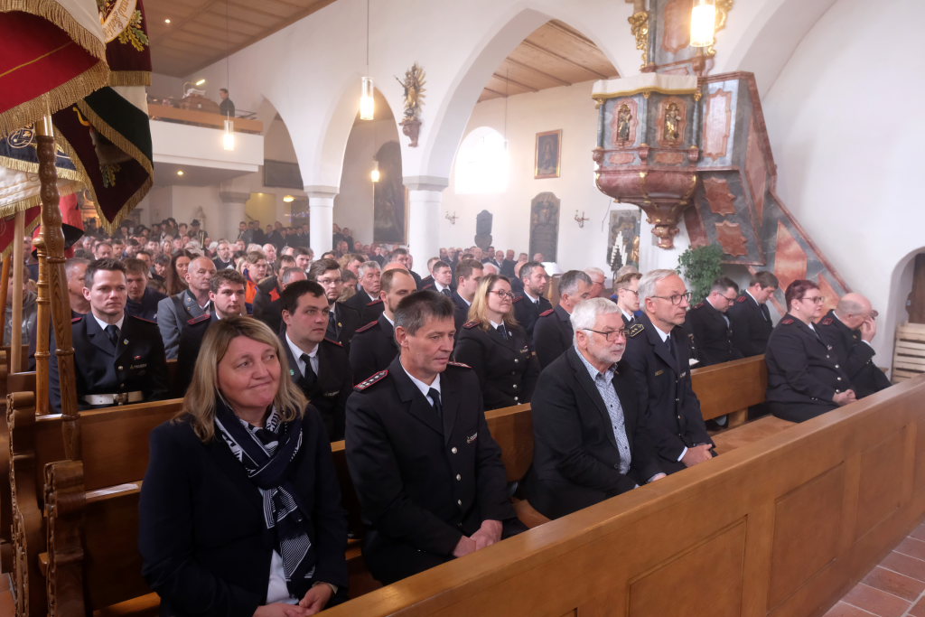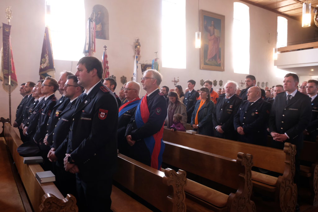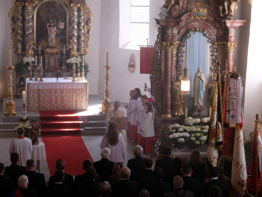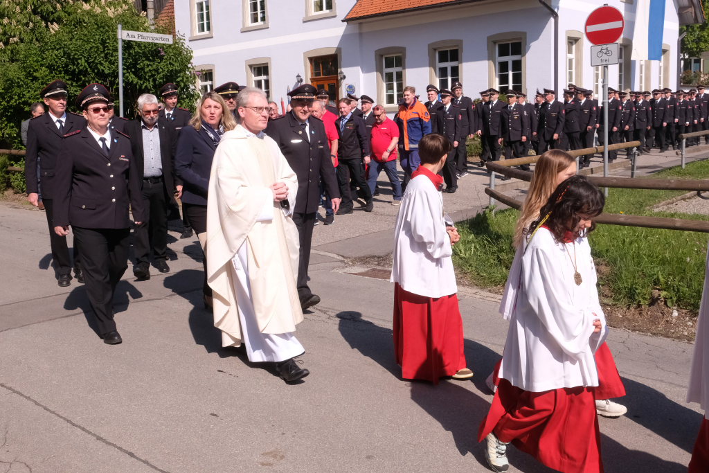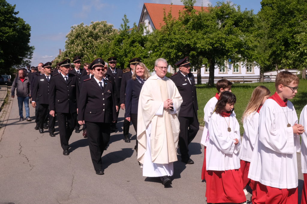 Mit einem Böllerschuss wurde das Fest vor dem Kirchgang lautstark eingeleitet, als sich die 16 Fahnen und Abordnungen der verschiedenen Feuerwehrabteilungen und Vereine samt Pfarrer und Ministranten unter den Klängen der Musikkapelle vom Gemeindehaus St. Martin auf den Weg zur Kirche machten. Dort empfing die zahlreichen Feuerwehr-Uniformträger und die anderen Gottesdienstbesucher der Kirchenchor unter der Leitung von Alexander Dreher musikalisch.