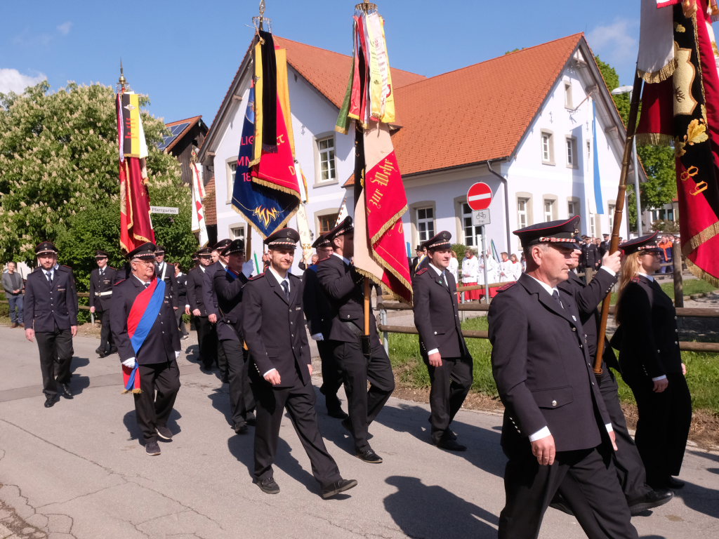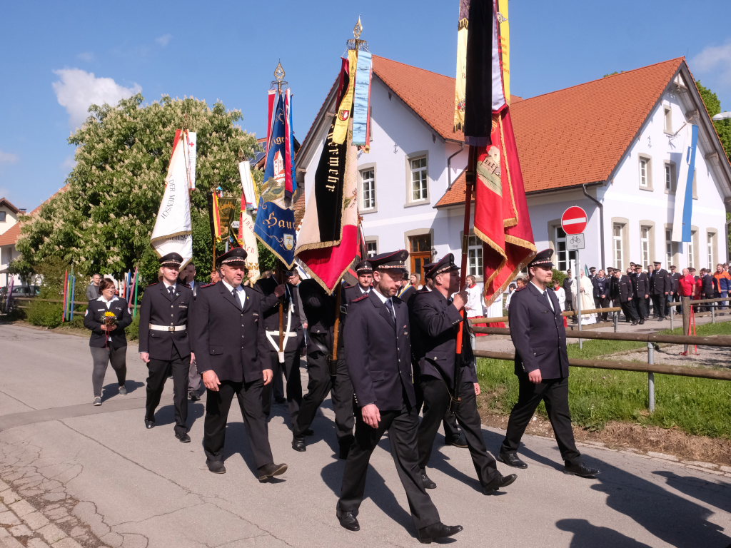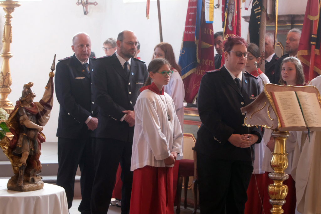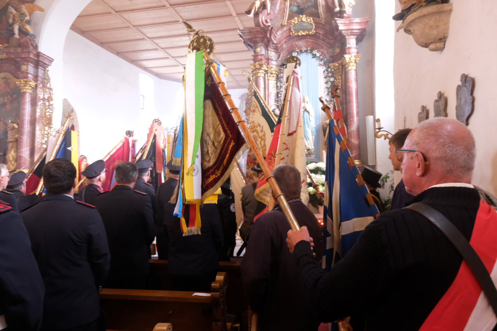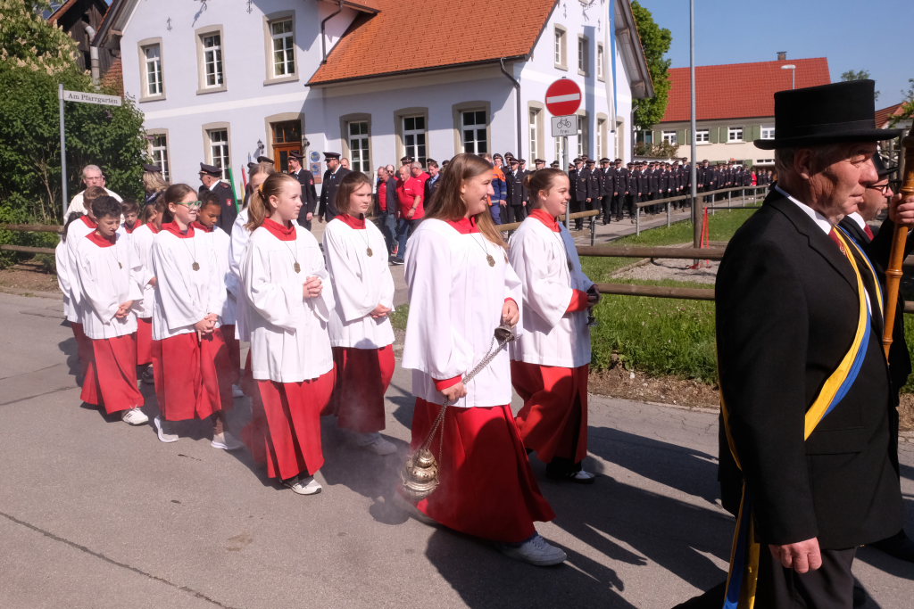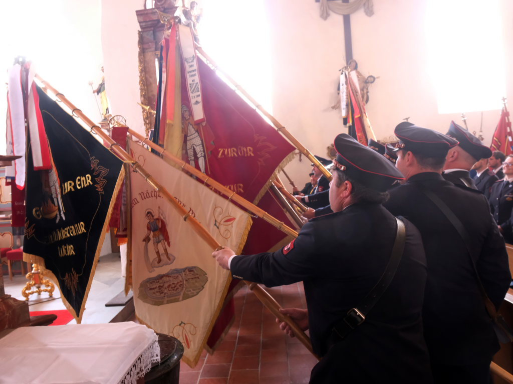 Mit einem Böllerschuss wurde das Fest vor dem Kirchgang lautstark eingeleitet, als sich die 16 Fahnen und Abordnungen der verschiedenen Feuerwehrabteilungen und Vereine samt Pfarrer und Ministranten unter den Klängen der Musikkapelle vom Gemeindehaus St. Martin auf den Weg zur Kirche machten. Dort empfing die zahlreichen Feuerwehr-Uniformträger und die anderen Gottesdienstbesucher der Kirchenchor unter der Leitung von Alexander Dreher musikalisch.
