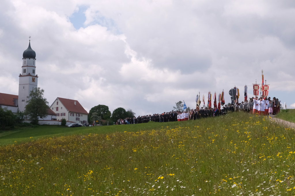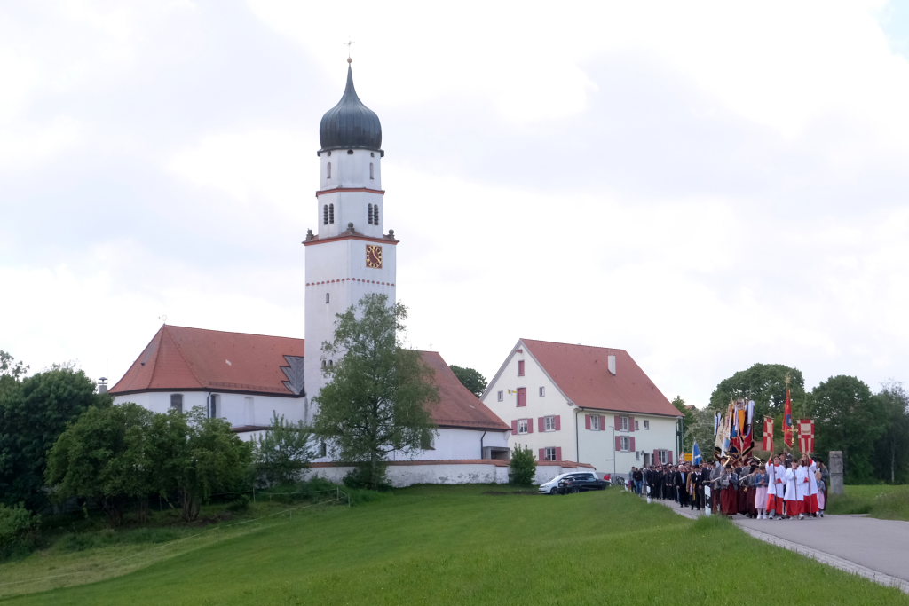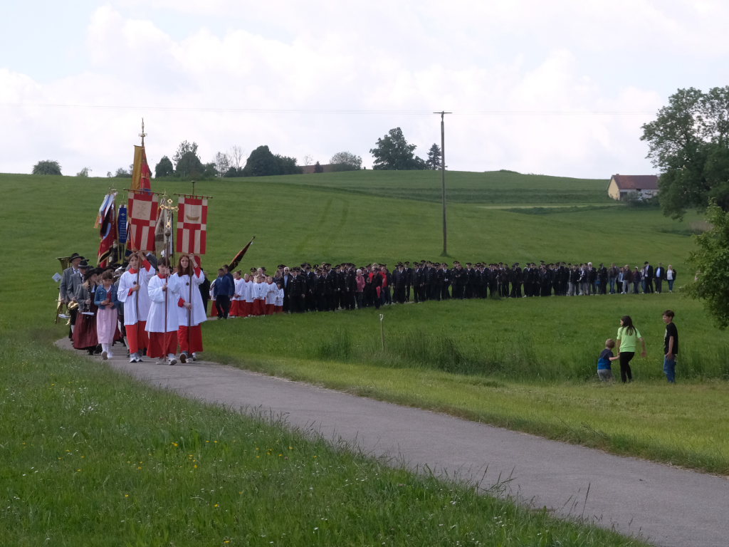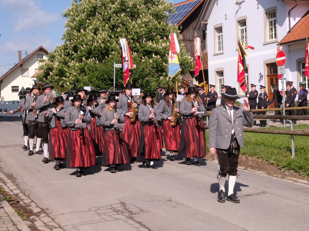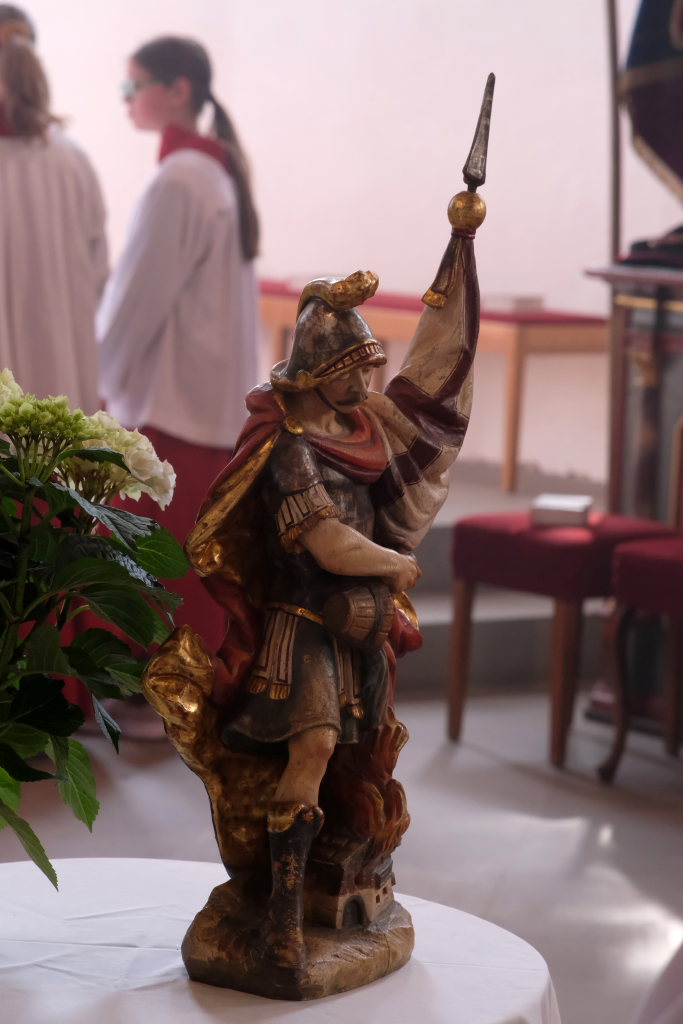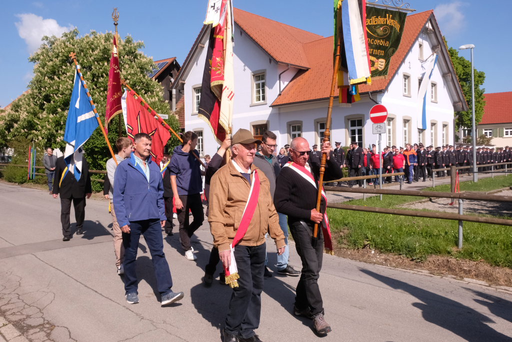 Mit einem Böllerschuss wurde das Fest vor dem Kirchgang lautstark eingeleitet, als sich die 16 Fahnen und Abordnungen der verschiedenen Feuerwehrabteilungen und Vereine samt Pfarrer und Ministranten unter den Klängen der Musikkapelle vom Gemeindehaus St. Martin auf den Weg zur Kirche machten. Dort empfing die zahlreichen Feuerwehr-Uniformträger und die anderen Gottesdienstbesucher der Kirchenchor unter der Leitung von Alexander Dreher musikalisch.