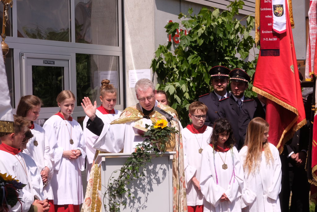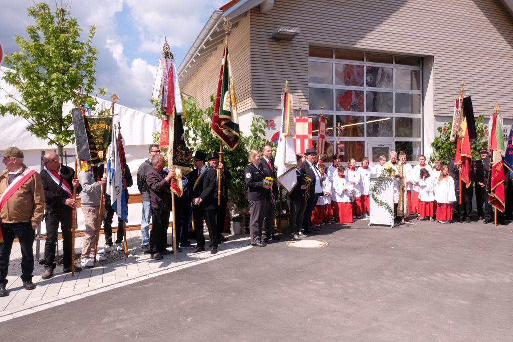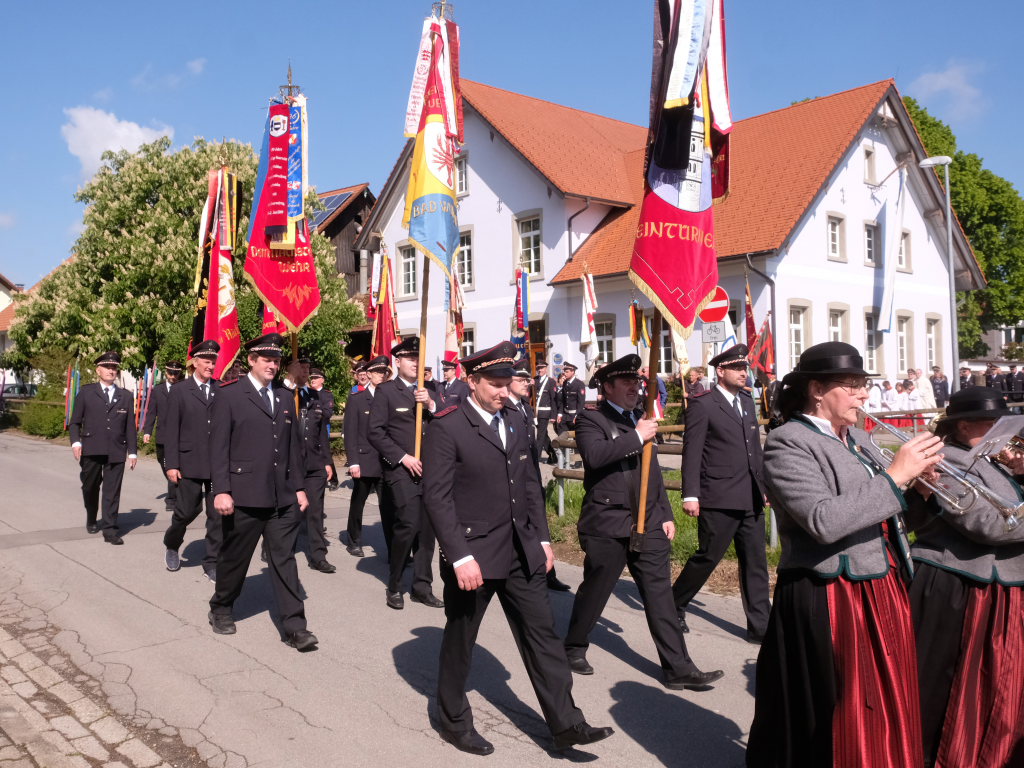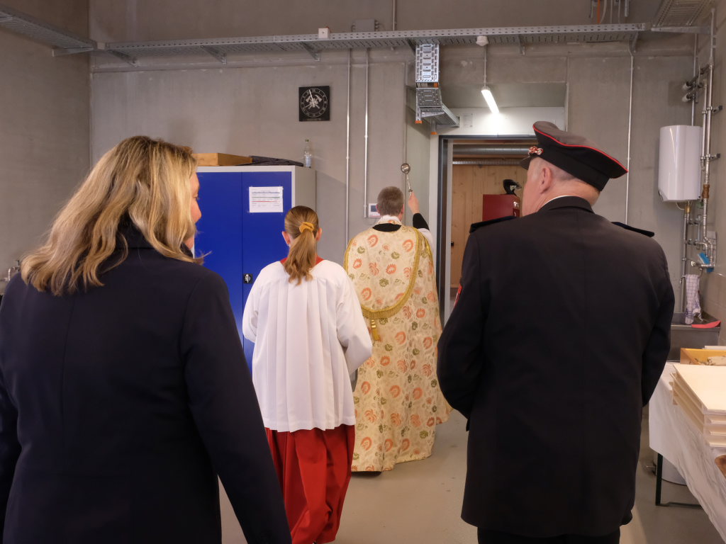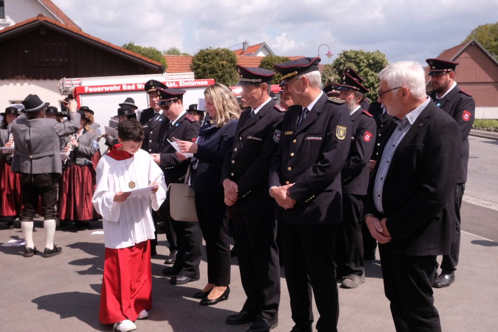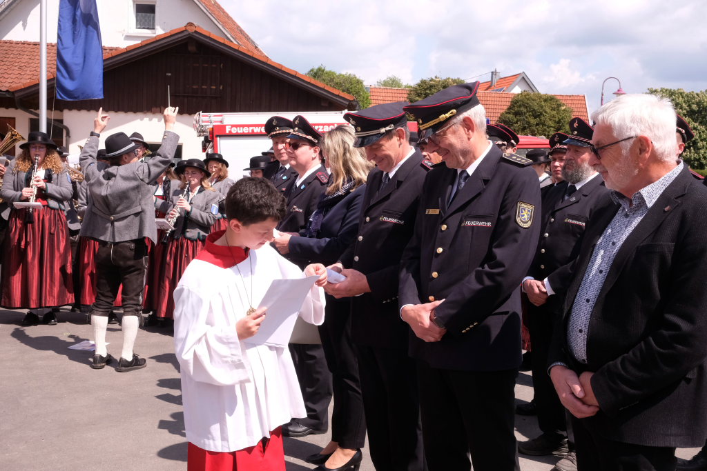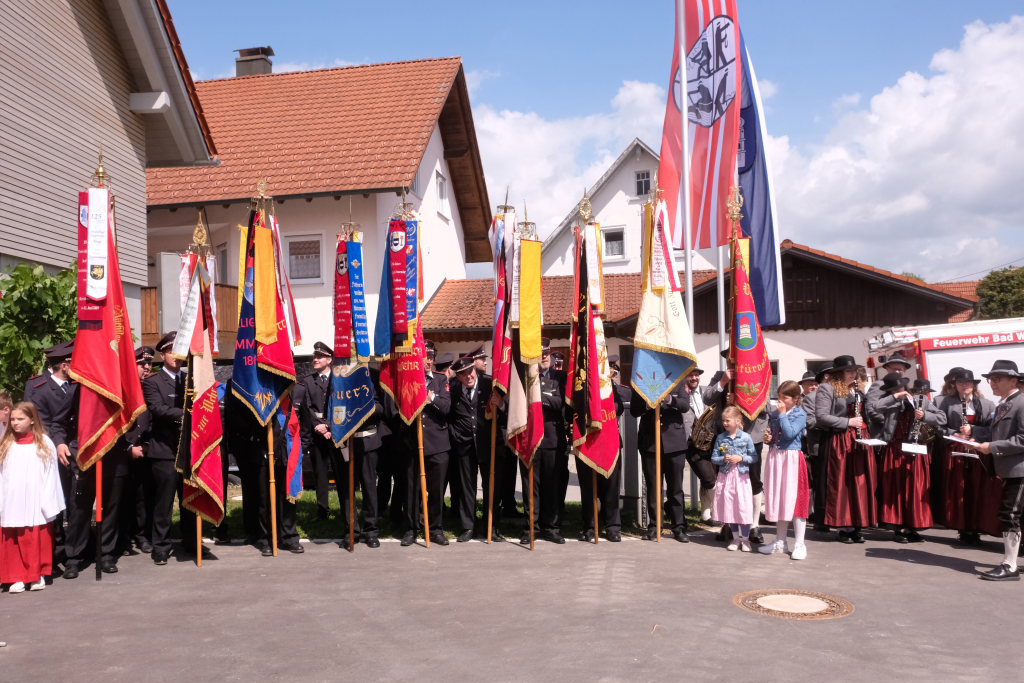 Nachdem die Musikkapelle mit „Großer Gott wir loben Dich“ die Messe beendet hatte, formierte sich vor der Kirche die beeindruckende Prozession hinunter zum neuerbauten Feuerwehrhaus, um es mit der christlichen Weihe zu versehen. Nach einem gemeinsam gebeteten Vater Unser machte sich Pfarrer Meschenmoser in Begleitung von Abteilungskommandant Alfons Riether, Gesamtkommandant Rolf Butscher und Bürgermeisterin Alexandra Scherer auf den Weg durch die Räume, die zu besichtigen am Nachmittag alle Gäste die Gelegenheit hatten. Nach einer Stärkung im daneben aufgebauten Festzelt war es Zeit für Grußworte und Danksagungen.