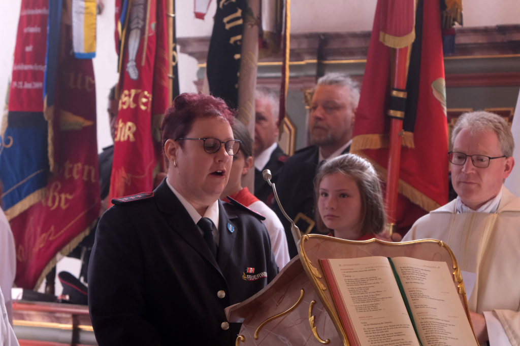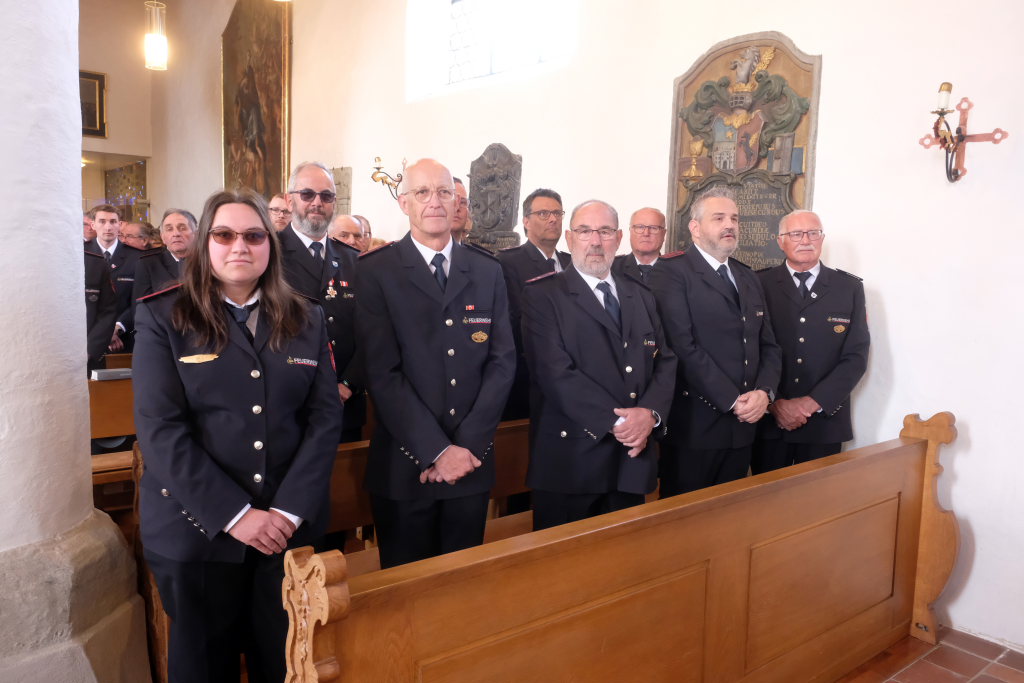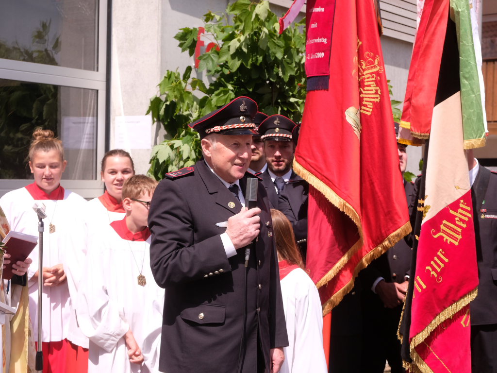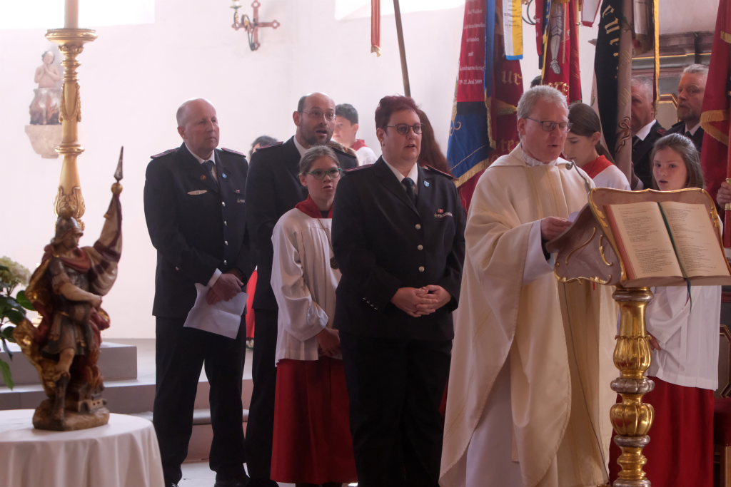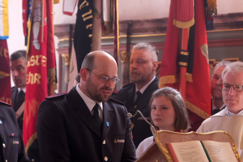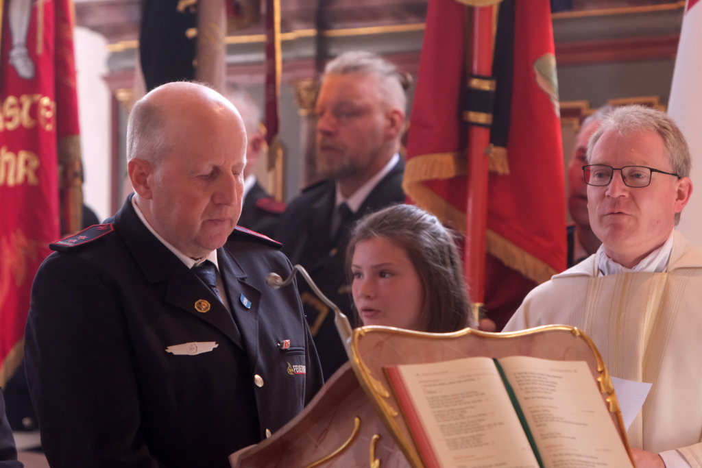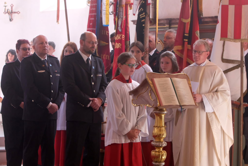 Ein besonderes Highlight lieferte Berthold Leupolz – Ortsvorsteher, Kirchengemeinderat und Sänger des Kirchenchores und Liederkranzes – als er zu seiner Dankesrede ansetzte. Denn bevor er allen dankte, die zum Gelingen des Gottesdienstes beigetragen hatten, stimmte er einen Geburtstagsgruß für Patrick Meschenmoser an, der in der letzten Woche seinen fünfzigsten Geburtstag gefeiert hatte, in den die Feuerwehrleute und weitere Mitglieder der Blaulichtfamilie begeistert mit einstimmten.