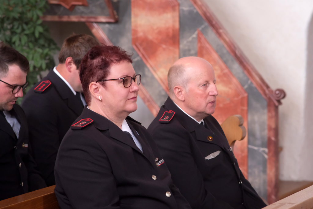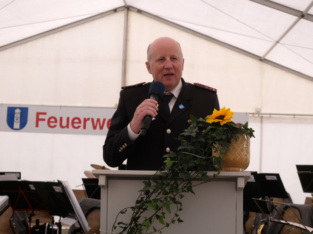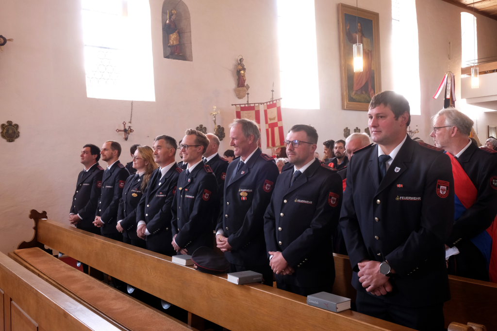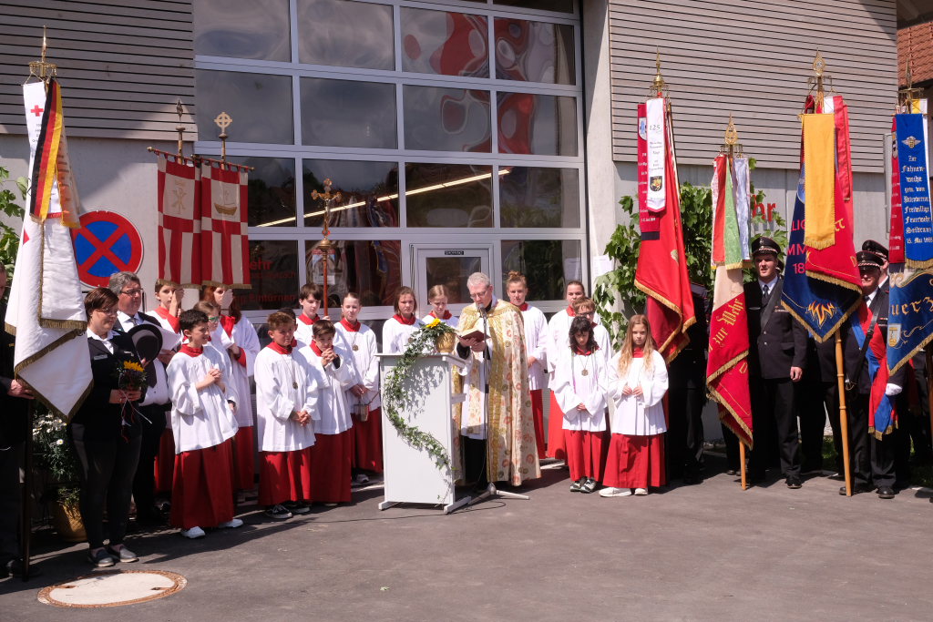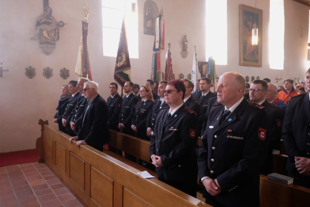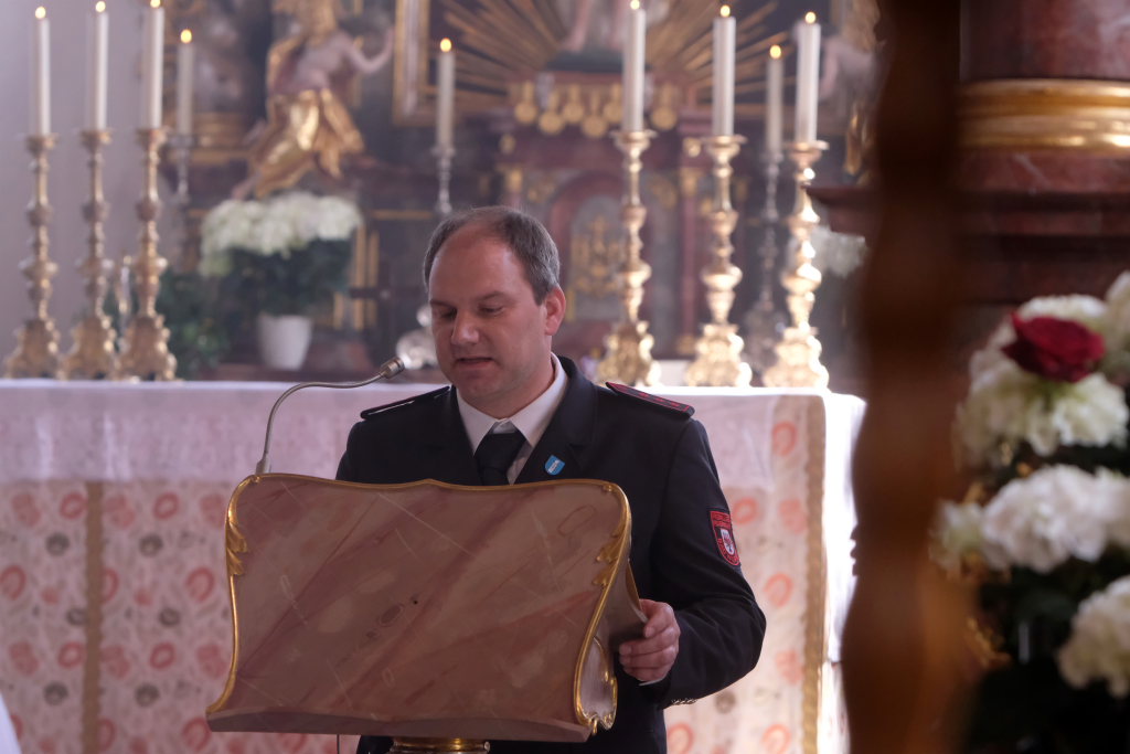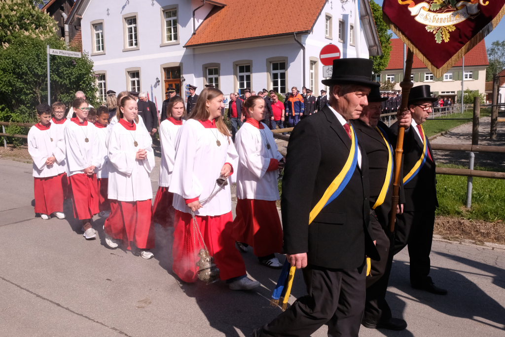 Ein besonderes Highlight lieferte Berthold Leupolz – Ortsvorsteher, Kirchengemeinderat und Sänger des Kirchenchores und Liederkranzes – als er zu seiner Dankesrede ansetzte. Denn bevor er allen dankte, die zum Gelingen des Gottesdienstes beigetragen hatten, stimmte er einen Geburtstagsgruß für Patrick Meschenmoser an, der in der letzten Woche seinen fünfzigsten Geburtstag gefeiert hatte, in den die Feuerwehrleute und weitere Mitglieder der Blaulichtfamilie begeistert mit einstimmten.