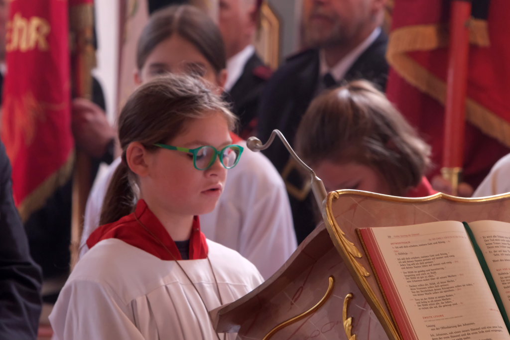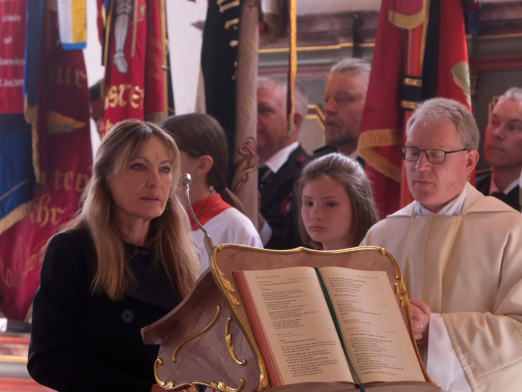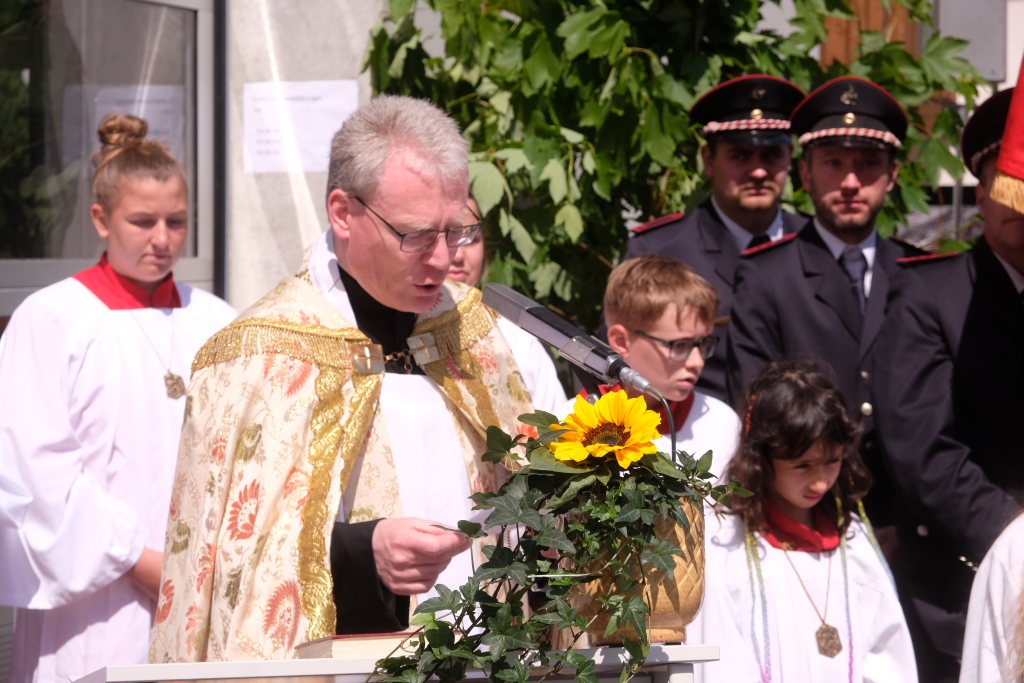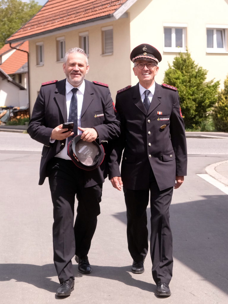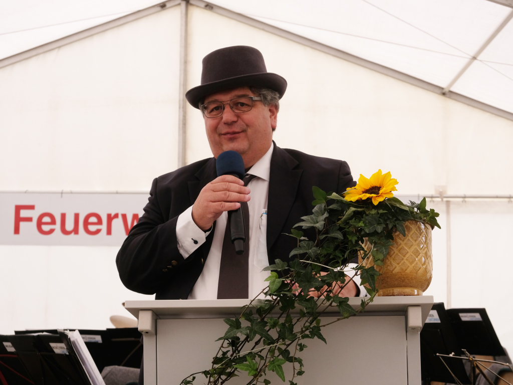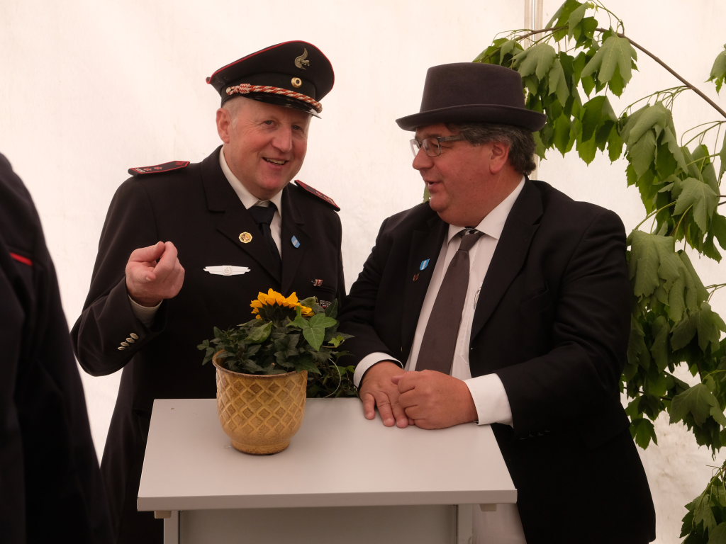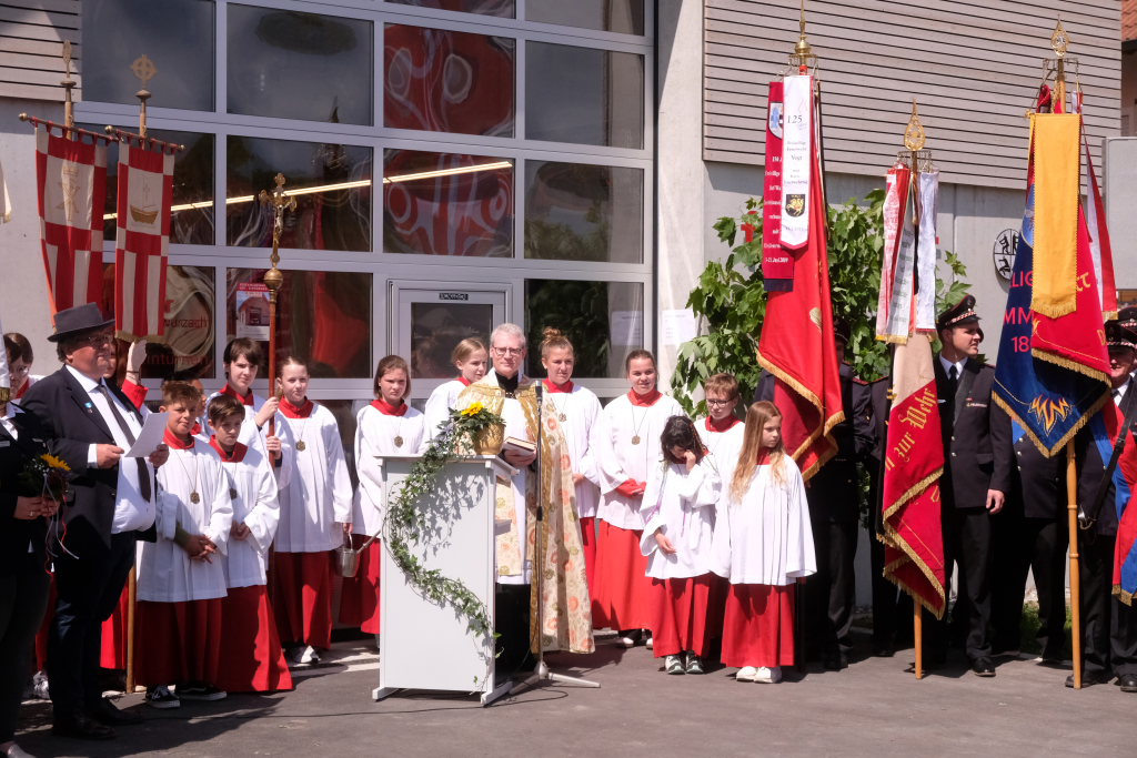 Ein besonderes Highlight lieferte Berthold Leupolz – Ortsvorsteher, Kirchengemeinderat und Sänger des Kirchenchores und Liederkranzes – als er zu seiner Dankesrede ansetzte. Denn bevor er allen dankte, die zum Gelingen des Gottesdienstes beigetragen hatten, stimmte er einen Geburtstagsgruß für Patrick Meschenmoser an, der in der letzten Woche seinen fünfzigsten Geburtstag gefeiert hatte, in den die Feuerwehrleute und weitere Mitglieder der Blaulichtfamilie begeistert mit einstimmten.