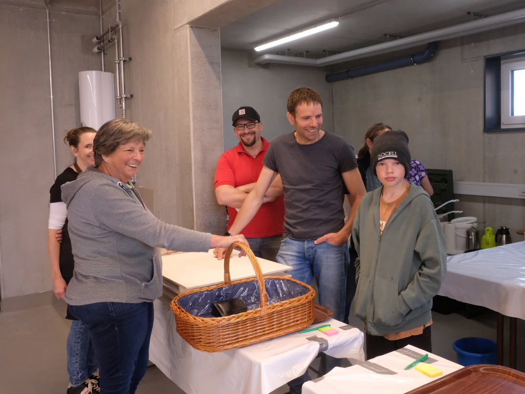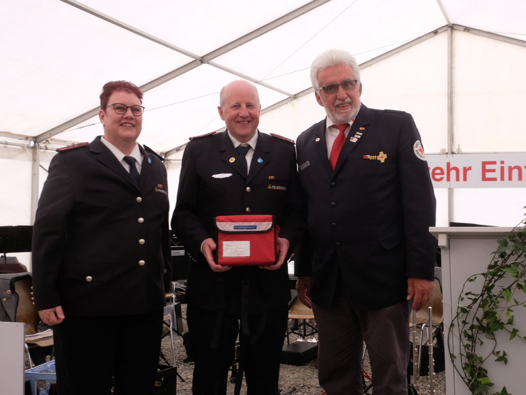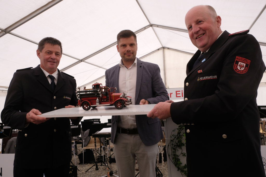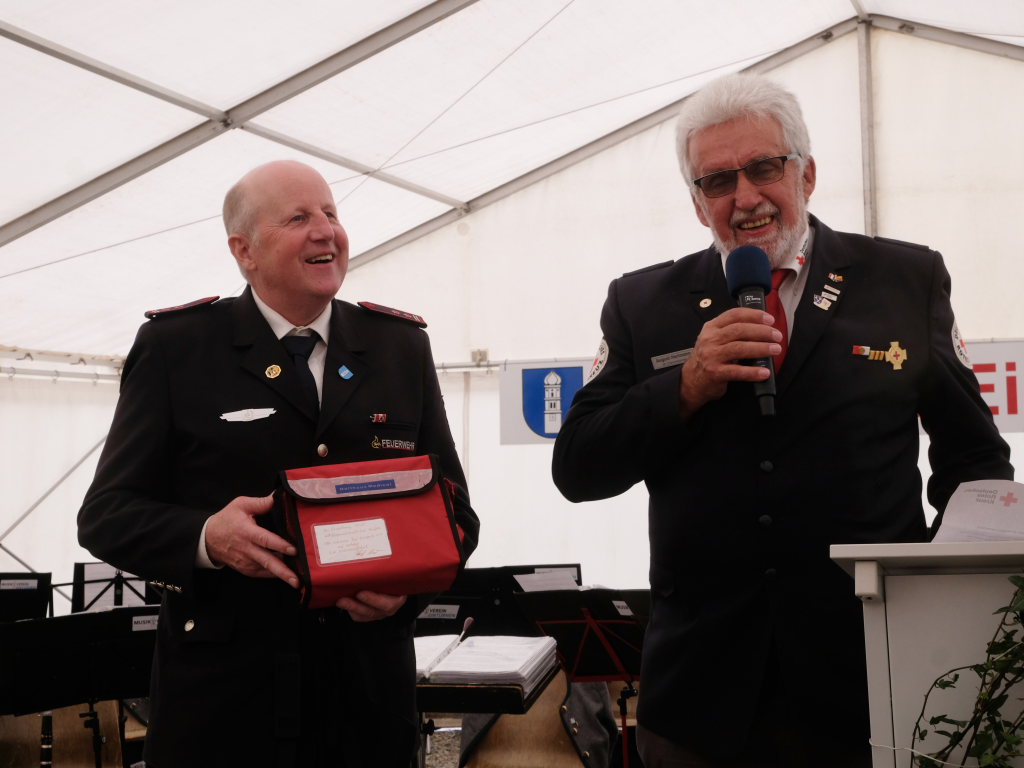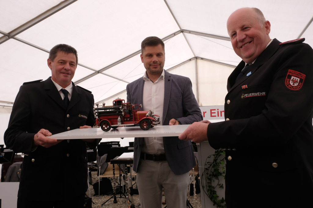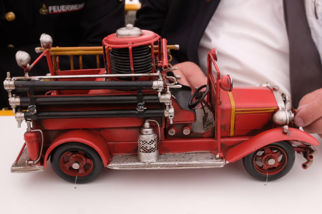 Der Architekt Michael Schwarz, vom ausführenden Architekturbüro PSP Architekten hatte als Geschenk zur Einweihung ein historisches Modell eines Feuerwehrautos aus den 30er oder 40er Jahren mitgebracht. August Hartmann, stellvertretender Vorsitzender des DRK-Ortsvereines Bad Wurzach, hatte als Mitglied der Blaulichtfamilie ein ganz pragmatisches Geschenk dabei: Eine kleine erste Hilfetasche. Die Kameraden aus Grenchen hatten da ein schwergewichtigeres Geschenk dabei: einen echten Baustein, verziert mit einer Gedenktafel den beiden Wappen der Wehren, mit einem Seil mit fachmännischem Freundschaftsknoten verknüpft.