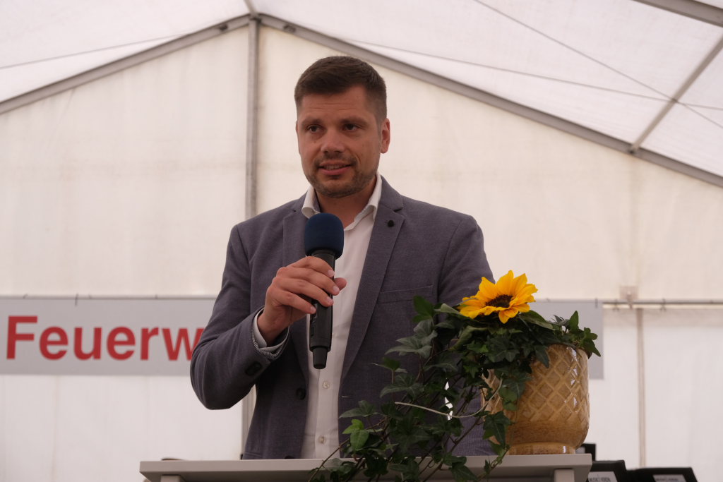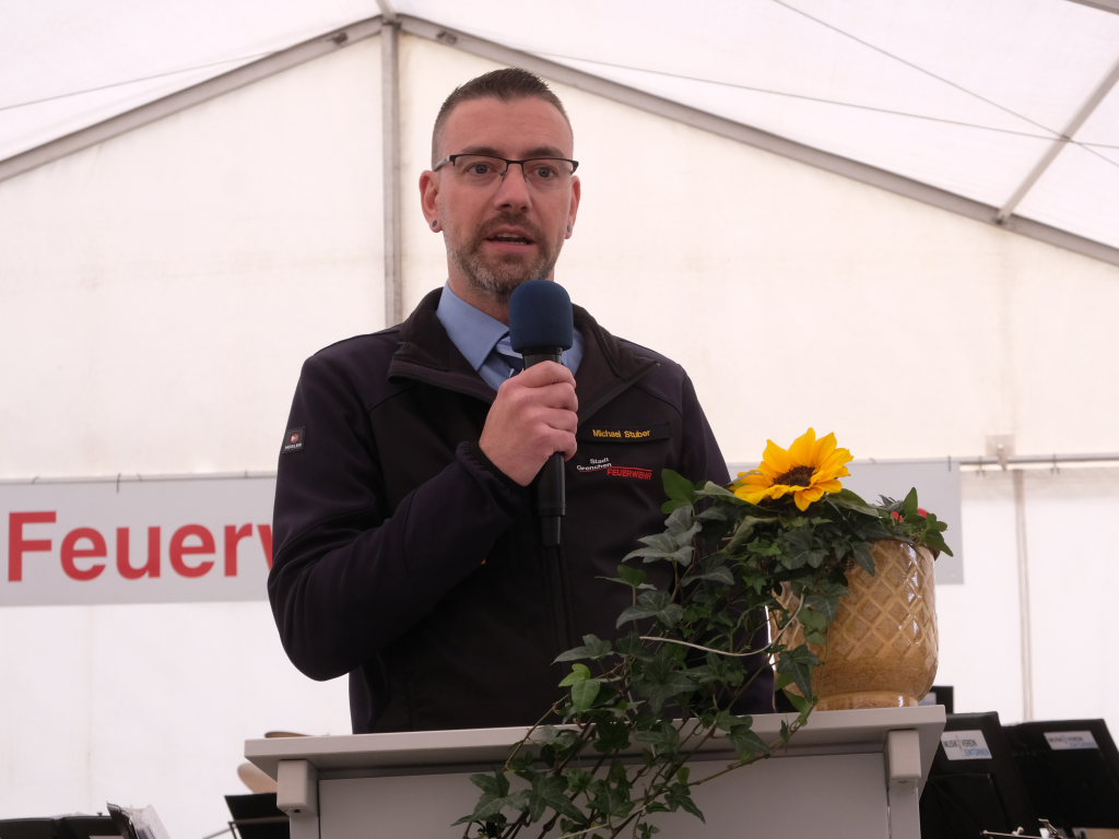 „Wir als Stadt sind sehr dankbar, dass wir in allen Ortsteilen eine leistungsfähige Freiwillige Feuerwehr haben.“ Diese bräuchten eine gute Ausrüstung und Unterbringung. „Deshalb hat der Gemeinderat am 6. März 2023 einen Neubau für das bisherige Feuerehrhaus beschlossen.“ Am 2. November 2023 war Spatenstich, am 12. April 2024 Richtfest und nun am 18. Mai 2025 – zwei Jahre nach Baubeschluss –konnte die Einweihung des Hauses gefeiert werden. Der vorgegebene gesetzliche Kostenrahmen von 1,885 Millionen Euro sei eingehalten worden und das sogar inklusive der PV-Anlage auf dem Dach. „Entstanden ist ein funktionales Haus, das allen Ansprüchen der Feuerwehr gerecht wird. Und trotzdem: stattlich, ansprechend und es fügt sich sehr gut ins Ortsbild ein.“ Nicht weniger als 10 Planungs– und Beratungsbüros und 22 Firmen seien an der Bauausführung beteiligt gewesen, denen ihr großen Dank gelte. Diese Koordinationsaufgabe zu meistern, dafür gebühre Christian Harscher als verantwortlichem Planer vom Stadtbauamt großer Dank.