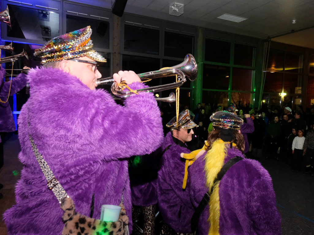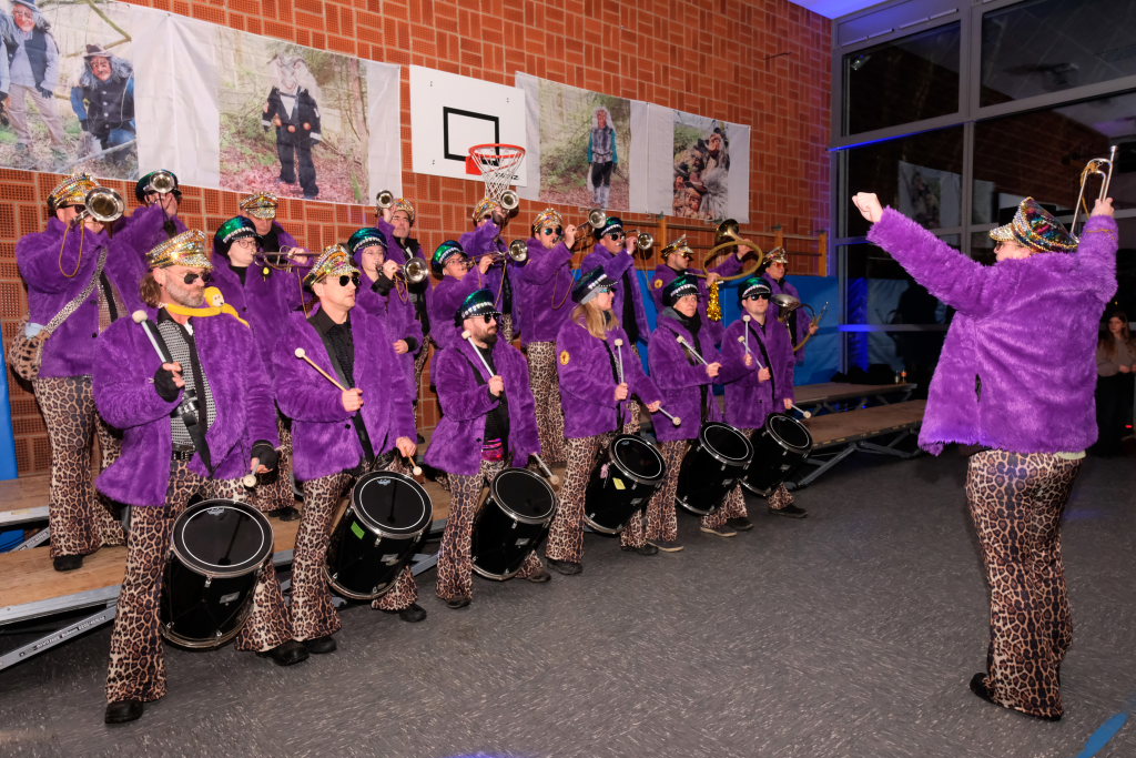 Den Live-Musik machte dabei die Musikkapelle Eintürnen mit diversen Fasnets-Krachern, ihnen folgten dann der Fanfarenzug Bad Wurzach, der sich für die Jubiläumssaison der Bad Wurzacher Narren mit Leo-Hose und lila Pelzjacke extra in Schale geworfen hatte. Den Abschluss der Live-Darbietungen bildete die Lumpenkapelle aus Leupolz, die die Halle endgültig zum Kochen brachte. Aber auch dazwischen wurde fleißig „Wintersport“ betrieben: Vor allem die jugendlichen Partygäste hatten Riesenspaß an Fasnetskrachern wie dem von Tim Toupet „Wir fahren mit dem Bob“.