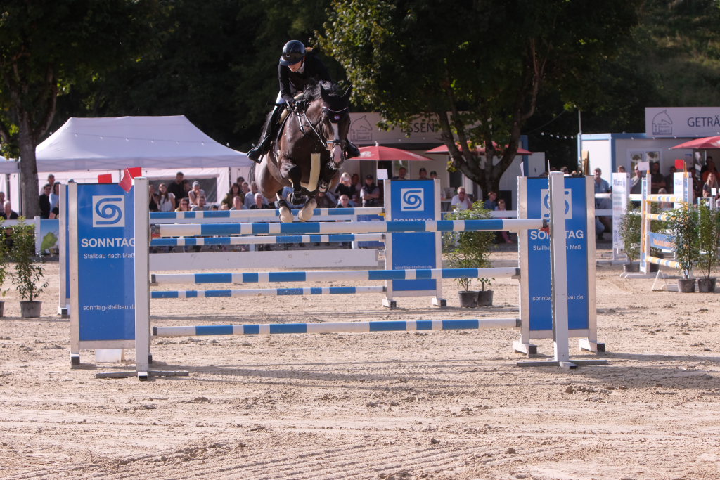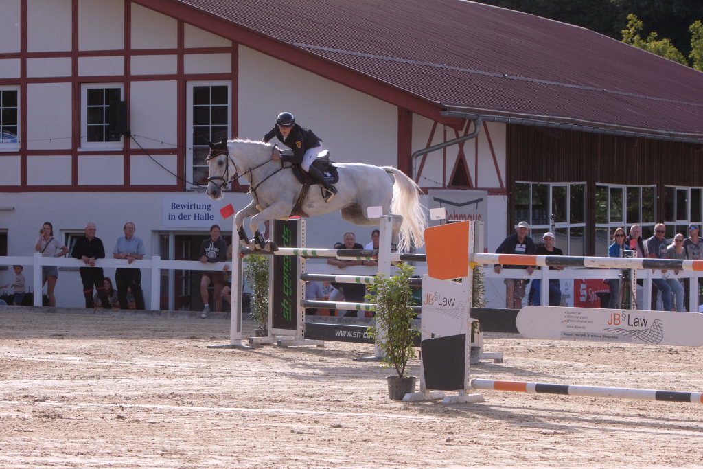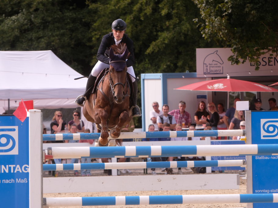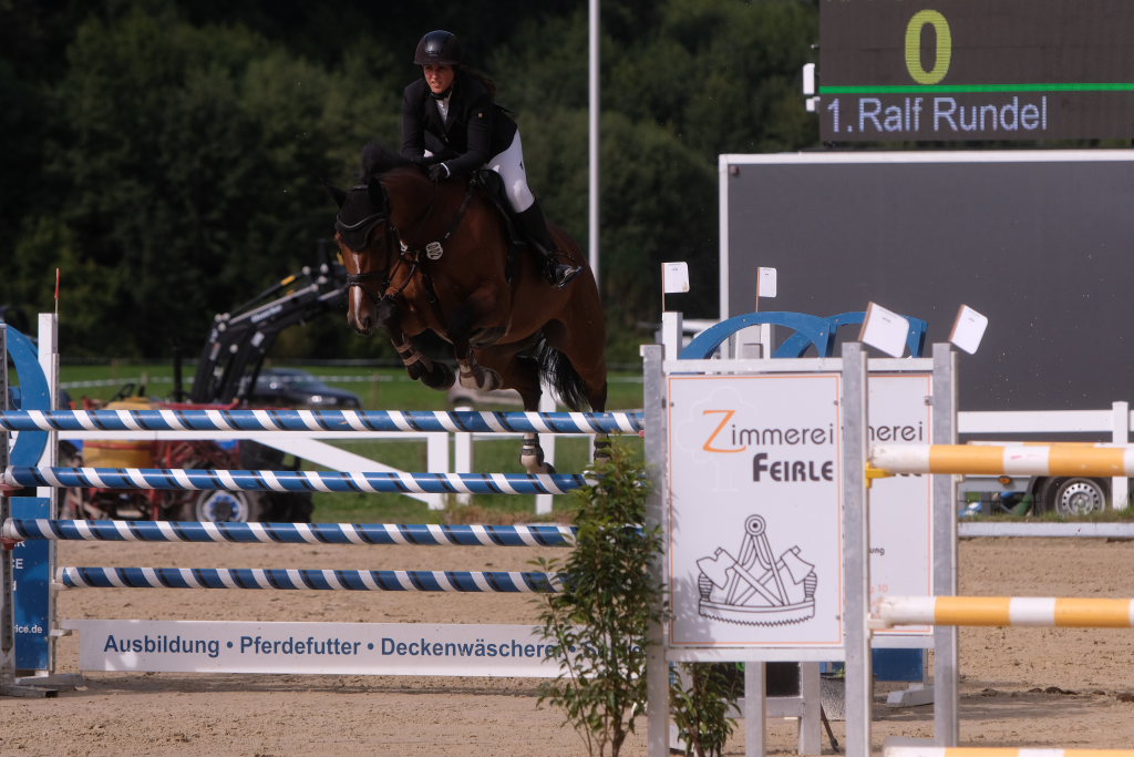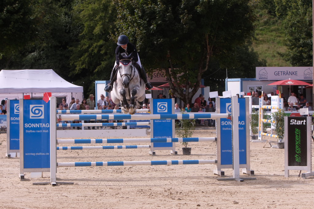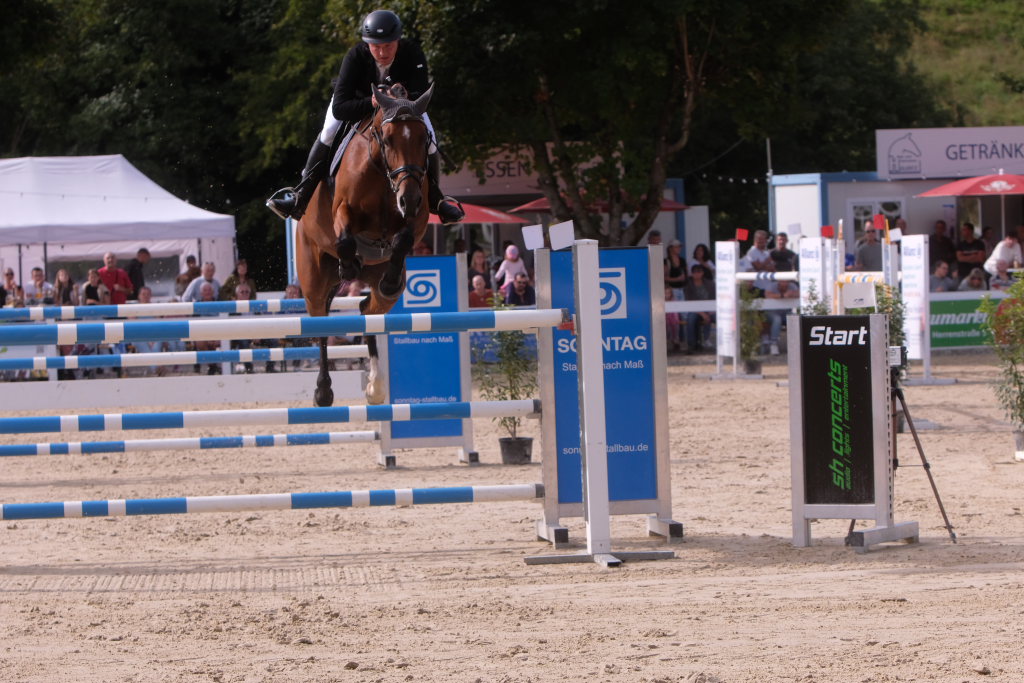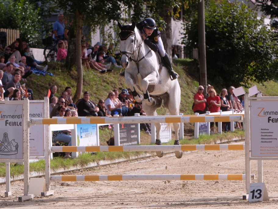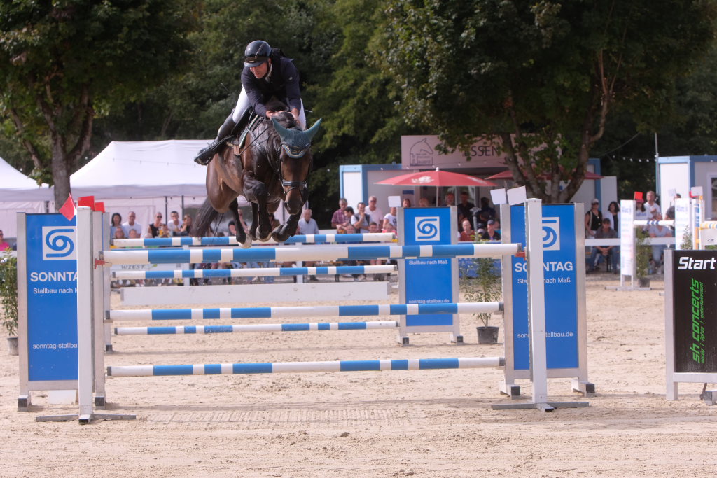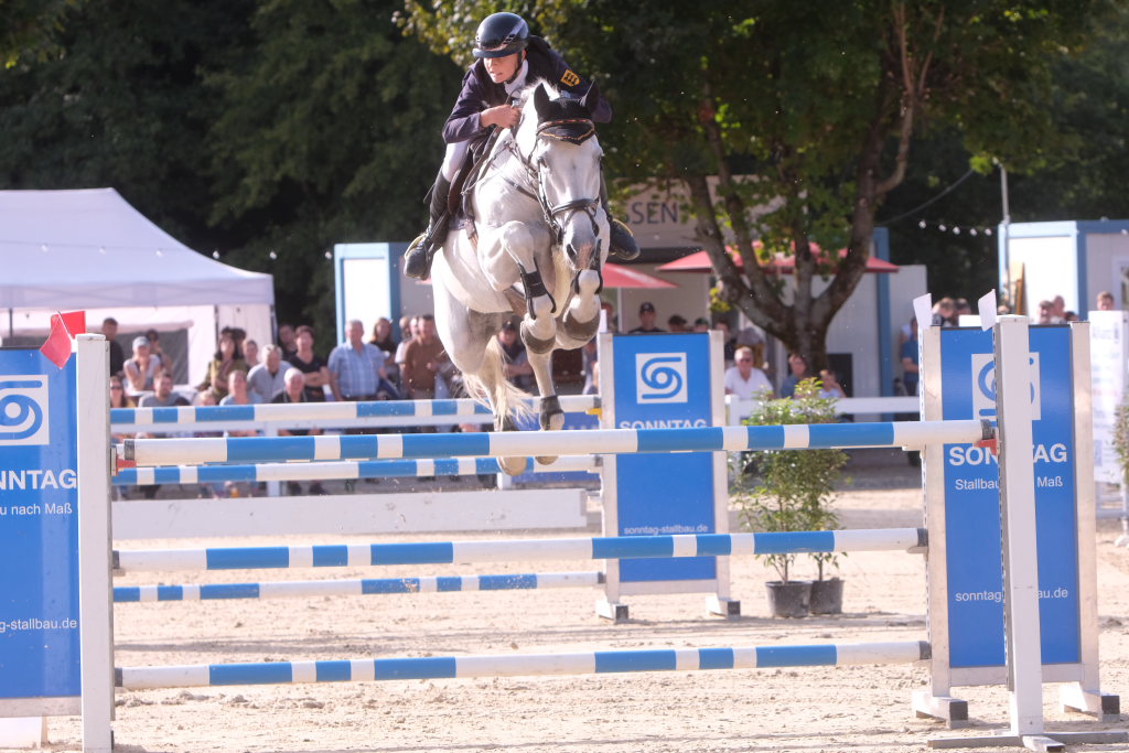 Bei der Hatz auf dem verkürzten Parcours – aber dabei mit noch einmal höheren Hindernissen Stechen – chancenlos blieben Leonie Assmann mit acht Fehlerpunkten und India Letizia Fux mit deren vier gegen die beiden Schnellsten. Schließlich trennten Colin Sorg (einer der jüngsten, wenn nicht sogar der jüngste Reiter im Feld) am Ende exakt 1,5 Sekunden vom Sieg. Mit 41,69 zu 40,19 Sekunden entschied die Zeit das spannende Stechen, bei dem sowohl Colin Sorg als auch Ralf Rundel fehlerlos blieben.