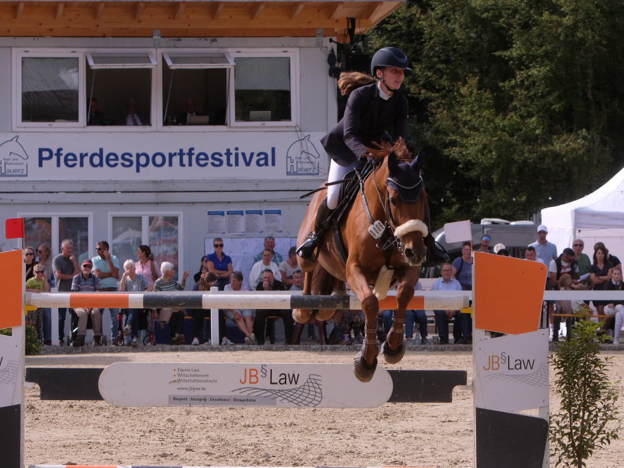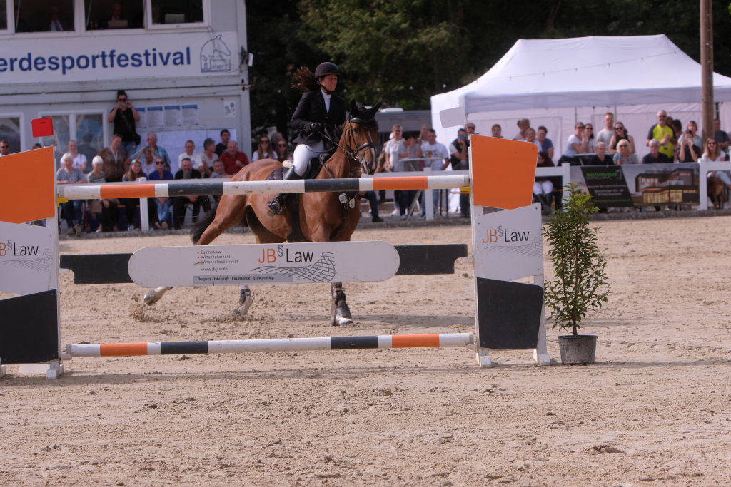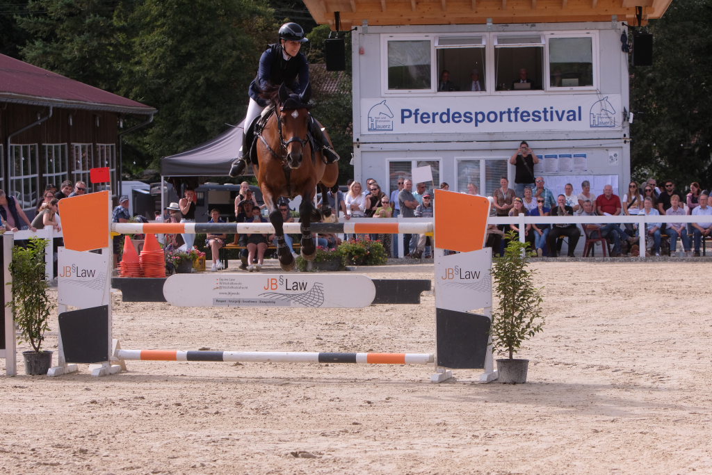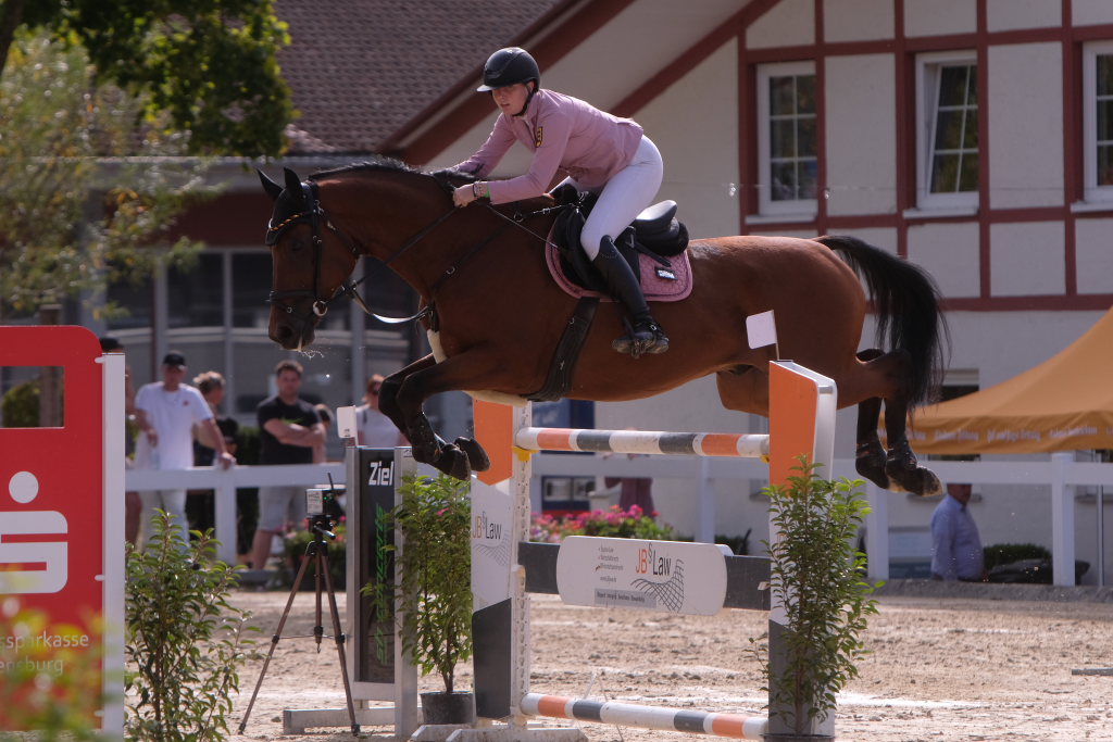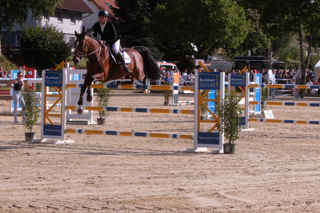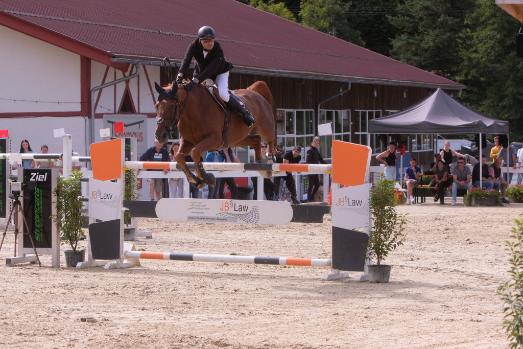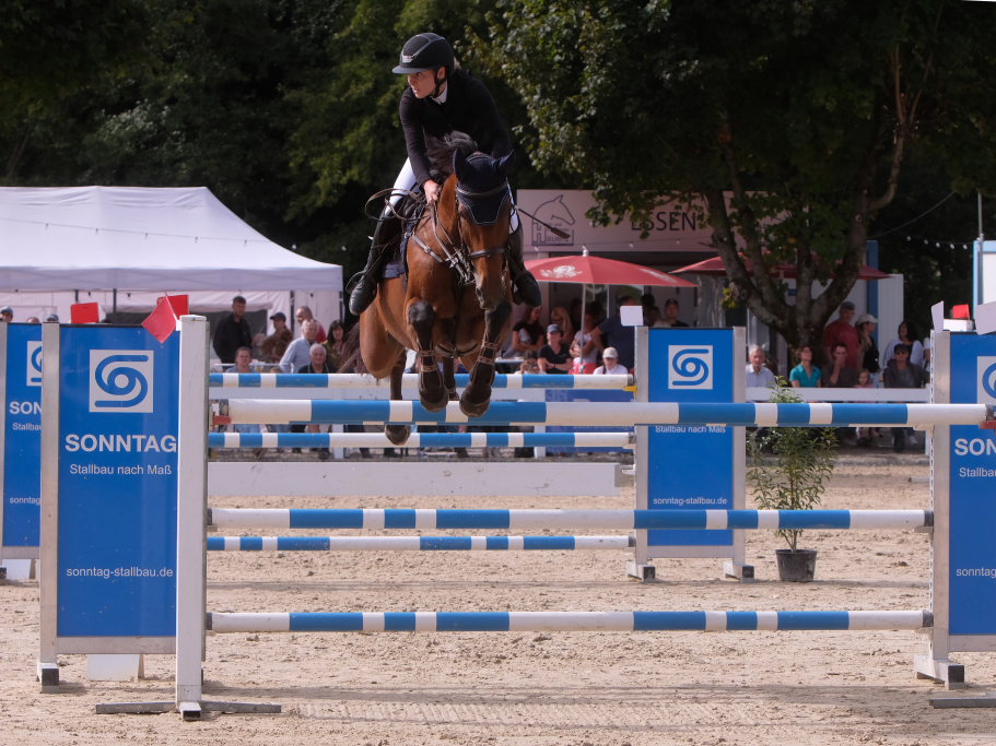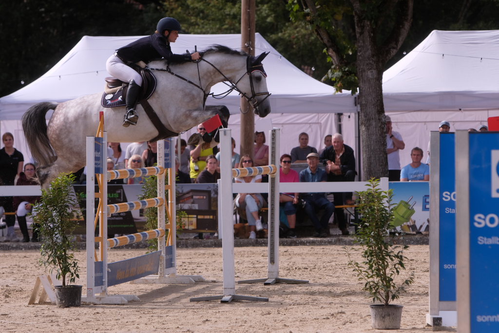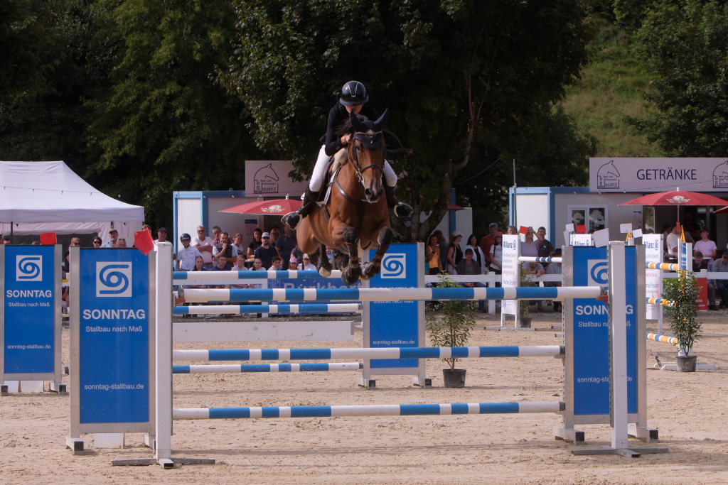 Bei der Hatz auf dem verkürzten Parcours – aber dabei mit noch einmal höheren Hindernissen Stechen – chancenlos blieben Leonie Assmann mit acht Fehlerpunkten und India Letizia Fux mit deren vier gegen die beiden Schnellsten. Schließlich trennten Colin Sorg (einer der jüngsten, wenn nicht sogar der jüngste Reiter im Feld) am Ende exakt 1,5 Sekunden vom Sieg. Mit 41,69 zu 40,19 Sekunden entschied die Zeit das spannende Stechen, bei dem sowohl Colin Sorg als auch Ralf Rundel fehlerlos blieben.