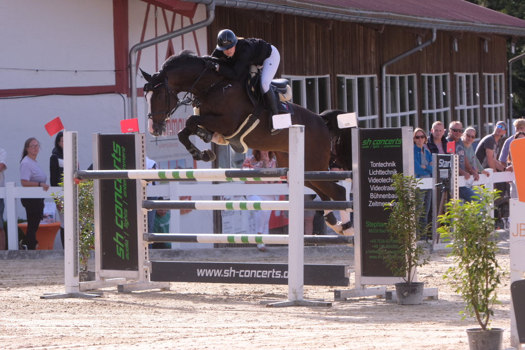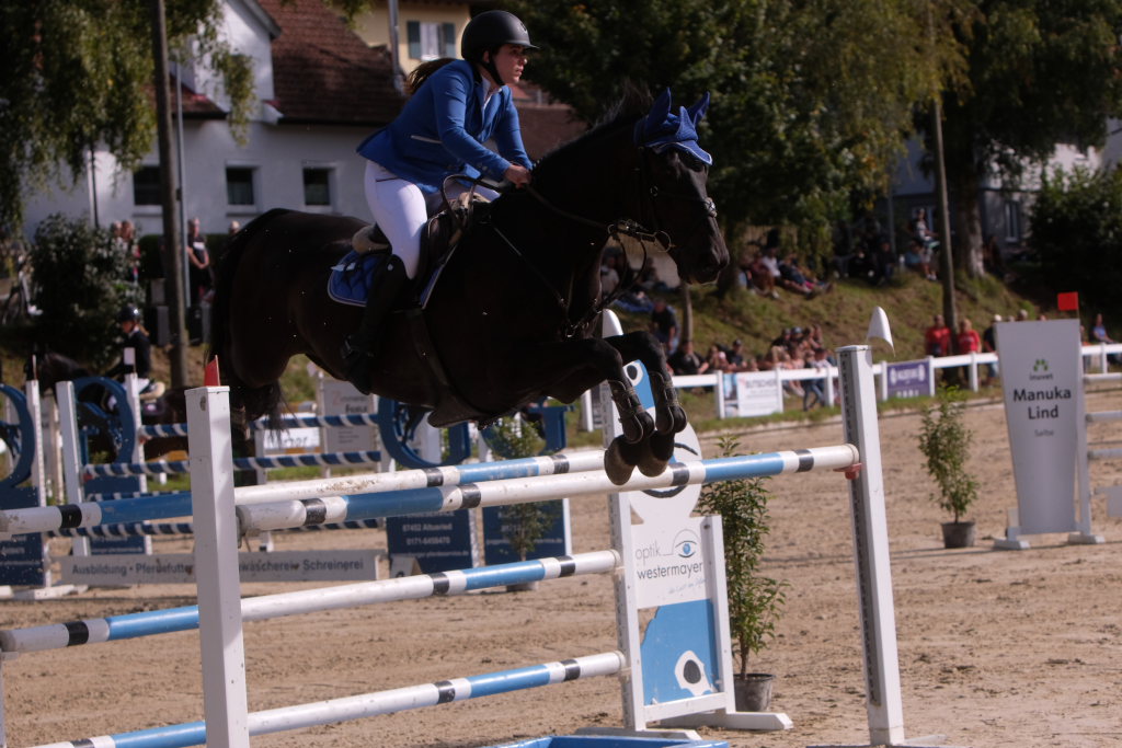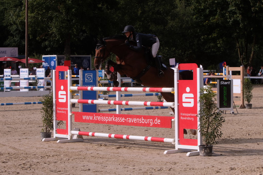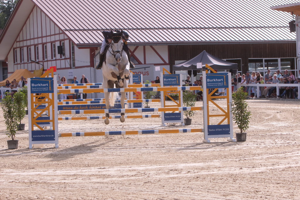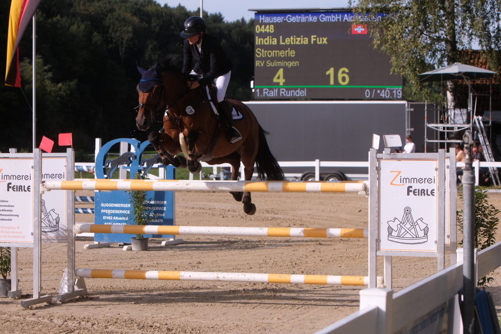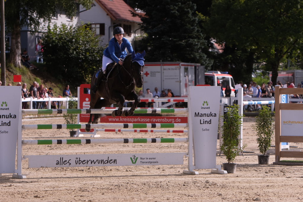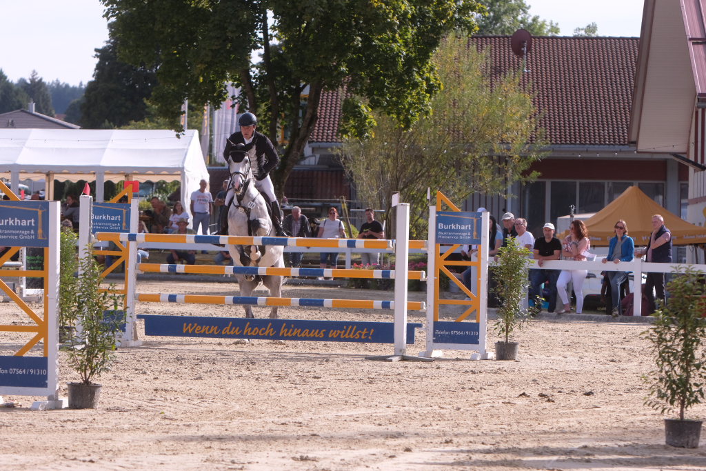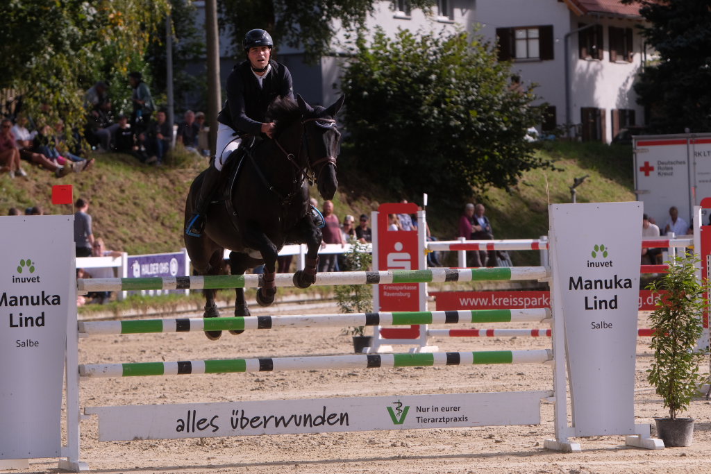 Weitere Reiterinnen und Reiter aus der Region schafften den Sprung in die Wertung mit jeweils vier Strafpunkten: Lea Sophia Gut schaffte mit Valentina Platz sechs, Lea Wiest vom RFV Kisslegg mit Cosa Cassandra Platz acht, hinter dem zweiten Pferd (Paco Blue van Breezerhof) von Ralf Rundel schaffte es Maximiliane Fimpel mit Cartagena auf den zehnten Platz. Ganz knapp den Sprung unter die Top Ten verpasste die für den RA SV Hubertus Metzingen startende Slowenin Petra Janic auf Cuyana, die gemeinsam mit India Letizia Fux dem Springen einen Hauch von internationalem Flair verlieh.