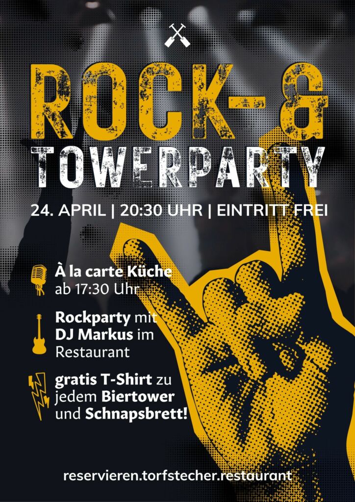 „Ab 17.30 Uhr ist das Restaurant wie gewohnt geöffnet – genießt unsere reguläre Karte und startet entspannt in den Abend. Ab 20.30 Uhr verwandelt sich der Torfstecher dann in eine echte Rockparty-Location! Zu hören sind fette Rockbeats und -Klassiker. DJ Markus sorgt für beste Stimmung. An der Bar werden Biertower und Schnapsbretter gereicht – inklusive Gratis-T-Shirt bei Bestellung. Feiert mit uns bis tief in die Nacht. Schnapp Dir Deine Freunde und erlebt eine legendäre Rocknacht im Torfstecher!“