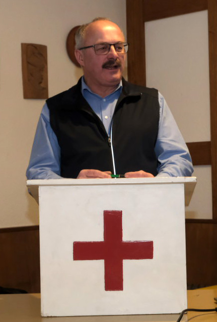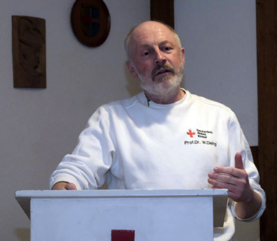 Prof. Dr. Wolfgang Dieing (Bild), der Kreisverbandsarzt, berichtete über die Neuigkeiten aus dem Kreisverband. So erklärte er für den wichtigen Bereich der Blutspende, dass die Ortsverbände für alle Anschaffungen, die in diesem Zusammenhang erfolgen, mit 75 % Förderung rechnen können. Die Anmeldung zur Blutspende erfolgt per Fragebogen. Die dadurch erhobenen Daten können auch für die weltweite Typisierung für die Stammzellenspende verwendet werde. Am besten seien Fremdspenden für die Stammzellentherapie geeignet, räumte er mit dem Vorurteil, dass Verwandte da besser geeignet seien, auf. Dieing berichtete auch darüber, dass der Kreisverband auf Fördermitglieder angewiesen sei. Die Altkleidersammlung, bei denen nur Stoffkleidung gesammelt wird, denn synthetische Kleider gehörten in den Müll, sei aufgrund der vielen Krisengebiete auf der Welt wieder aktuell. Es werden wieder Lager dafür angelegt. Der Kreisverband hat sein Engagement in der Kindertagespflege durch die Übernahme des St. Verena-Kindergartens in Bad Wurzach verstärkt. DRK-Helfer werden jetzt Feuerwehr und THW im Landeskatastrophenschutzgesetz entschädigungsmäßig gleichgestellt. Dieing hält es im Kriegsfall für problematisch, dass es in unserer Raumschaft nur noch im Bundeswehrkrankenhaus Ulm die Möglichkeit von unterirdischen Lagerräumen und Operationssälen gibt. Der Hausnotruf sei für ältere Menschen eine wichtige Einrichtung. Auch dafür seien viele Mitarbeiter im Einsatz, damit bei einem Fehlalarm nicht gleich der Rettungswagen kommt.