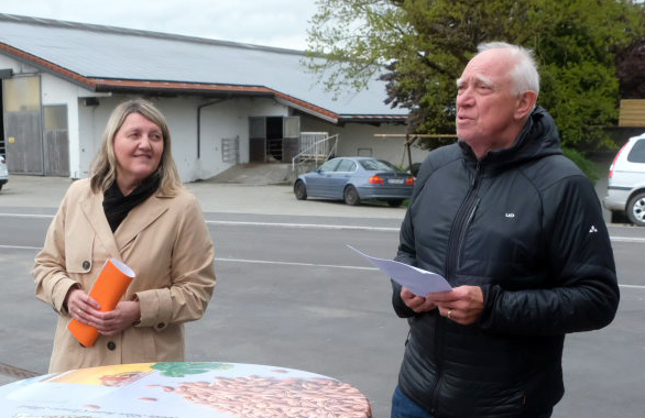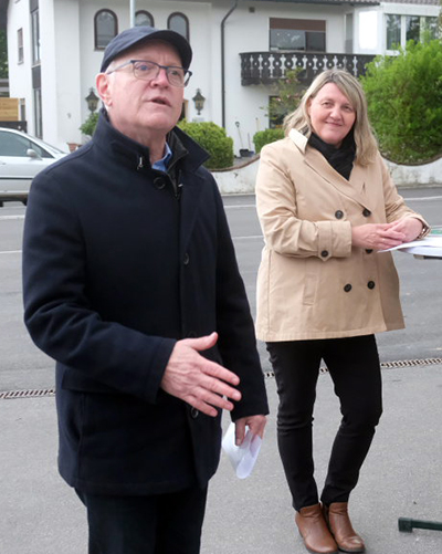 Karl-Josef Fassnacht (Bild; mit Bürgermeisterin Scherer) hatte zu der kleinen Feier mit der Bauzeichnerin Sandra Eckstein auch eine Person mitgebracht, die wichtige Arbeit leistet, aber meist im Hintergrund steht. Namentlich lobte er sie wie auch seine sonstigen Mitarbeiter und insgesamt alle am Projekt Beteiligten. Fassnacht sprach von einem für Arnach wichtigen Projekt. Beim Blick unter die Fahrbahn sei offenbar geworden, dass es nicht nur um eine neue Fahrbahndecke auf einer Länge von 445 m gehen würde. Da wurde die Hauptwasserleitung inklusive Hausanschlüsse ersetzt, die Breitband-Versorgung wurde durch die Neuverlegung der entsprechenden Rohre vorbereitet. Es wurde ein Teil des Mischwasserkanals erneuert bzw. aufdimensioniert (im Kreuzungsbereich Ratperoniusstraße/Hünlishofer Weg und beim BAG-Gebäude).