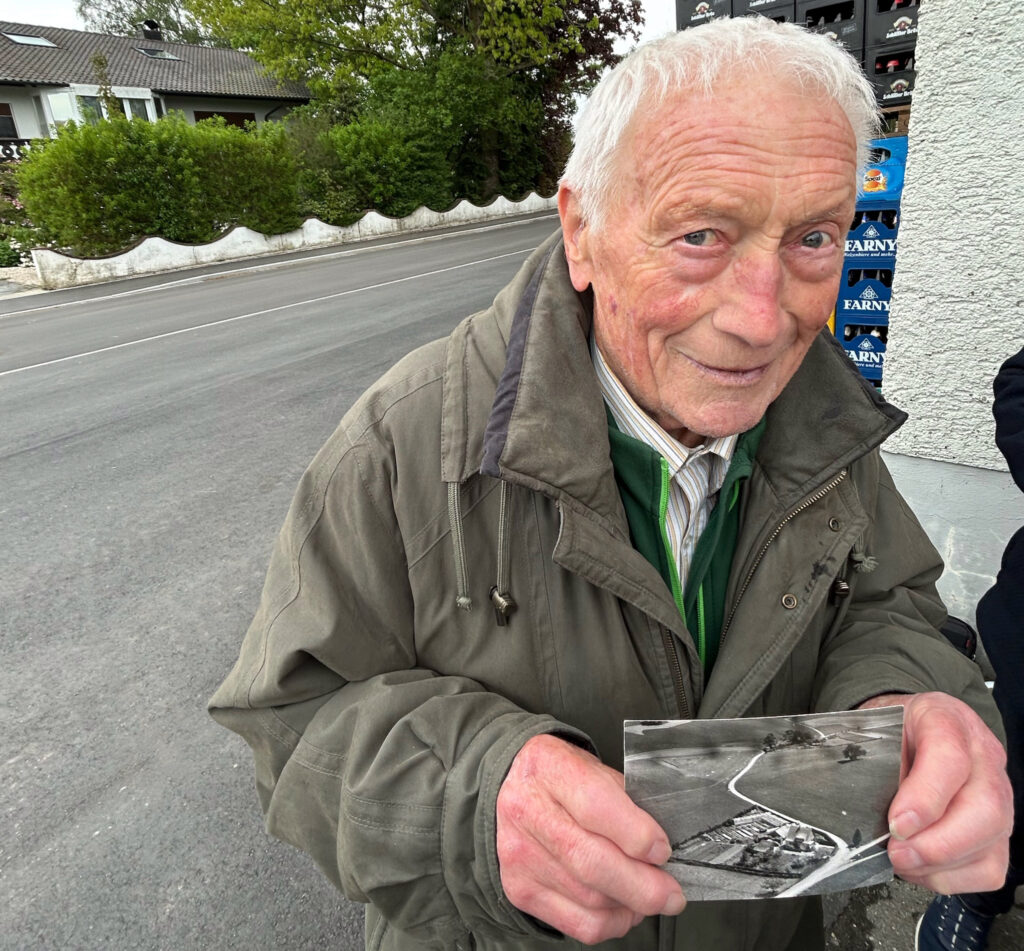Der 89-jährige Matthias Grad vor der neugemachten Ratperoniusstraße. In Händen hält er ein Foto, das die Ratperoniusstraße in den 1950ern zeigt (die damals noch namenlos war). Das Foto hat der Seniorchef der Gärtnerei Grad eigens zur Eröffnung der neuen Ratperoniusstraße mitgebracht, an der der in den 1920er-Jahren gegründete Betrieb liegt.