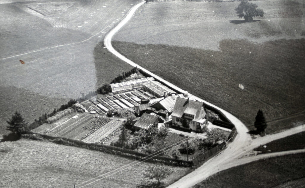 Das Luftbild aus den 1950er-Jahren zeigt die Gärtnerei Grad und die an der Wegegabelung beginnende Ratperoniusstraße (die damals noch nicht so hieß). Die drei Wege führen nach Hünlishofen (links), Übendorf (Mitte) und Rahmhaus (rechts). Die Straße Richtung Dorf (von der Gabelung nach links) – also die heutige Ratperoniusstraße – war in der Kindheit des 1935 geborenen Matthias Grad noch unbebaut. Das heutige Lagerhaus und die ganze Siedlung Arnach-Süd waren noch nicht vorhanden. Die ersten Gebäude am Ortsrand waren der Hof Müller („Dirrabauer“), heute Schöllhorn, und der Hof Blank (heute nicht mehr vorhanden) sowie Blanks Villa und das Baugeschäft Vogt. Das hier abgebildete Grad-Haus mit Treibhäusern und Beeten entstand 1928. Das Feld rechts des Grad-Hauses bis zur allein stehenden Kiefer wurde Mitte der 1960er-Jahre bebaut (Max-Müller-Weg). Schultheiß Max Müller, der gegen Ende des 19. Jahrhunderts amtierte, er wurde auch als „Menschen- und Viehdoktor“ zu Rate gezogen, begrub dort, wo die Kiefer steht, sein totes Pferd. Noch bis mindestens 1980 konnte man an einem großen Stein die Jahreszahl jener Bestattung lesen (ca. 1880). Die Kiefer wurde wohl zur Erinnerung an das geliebte Ross gepflanzt.