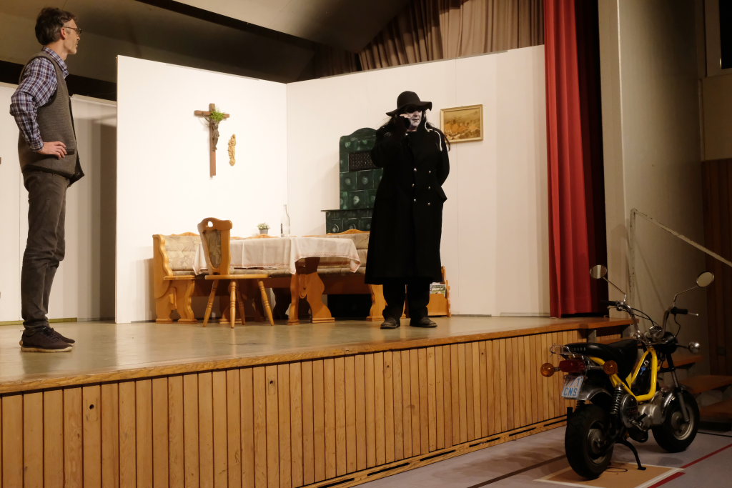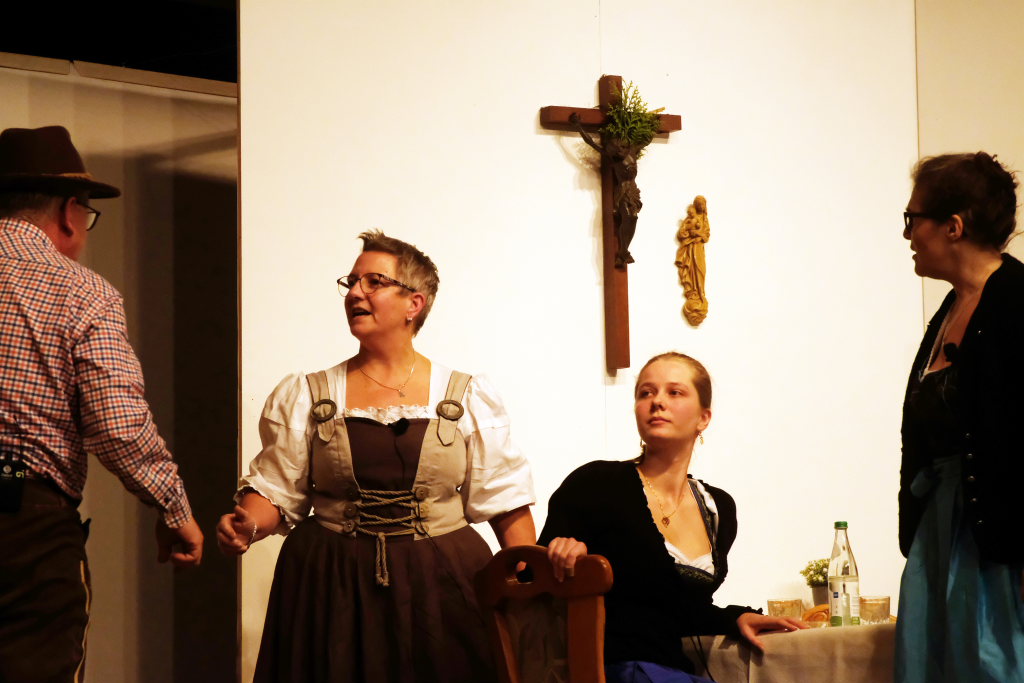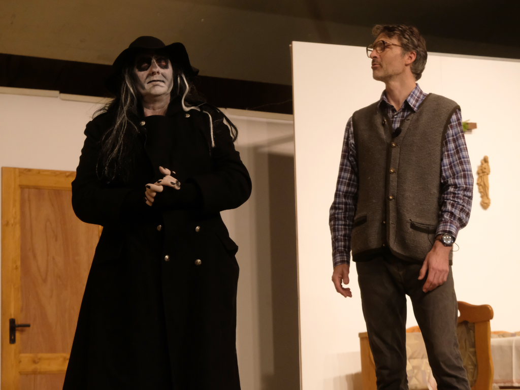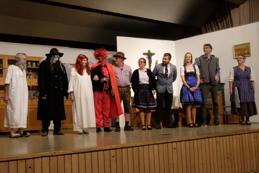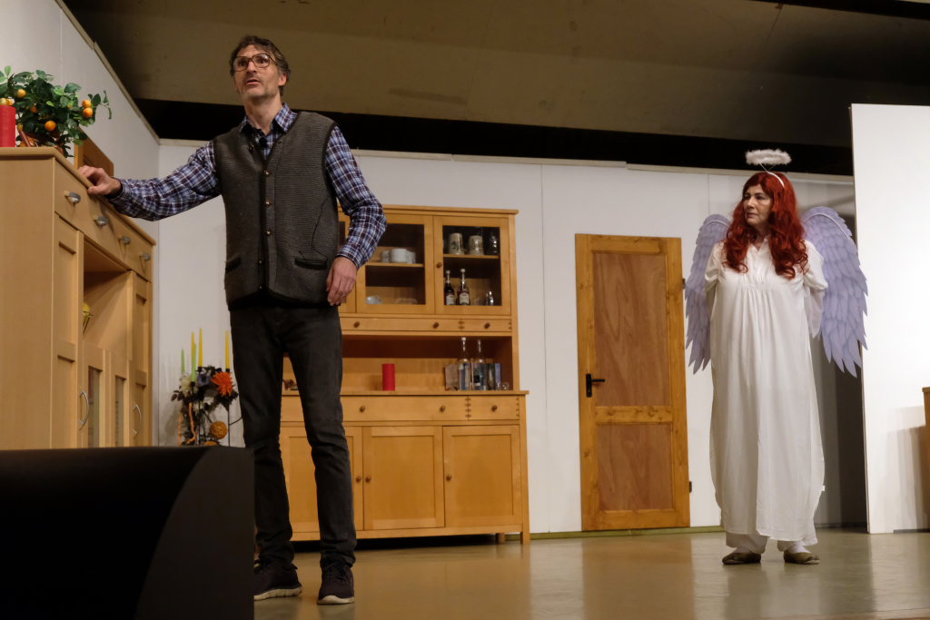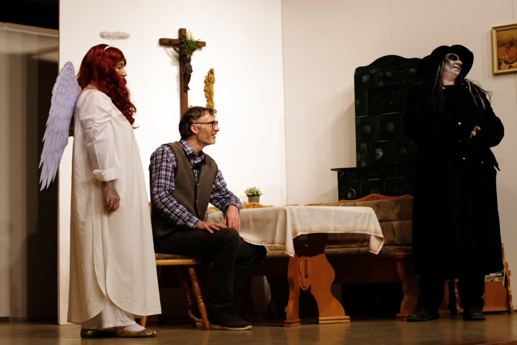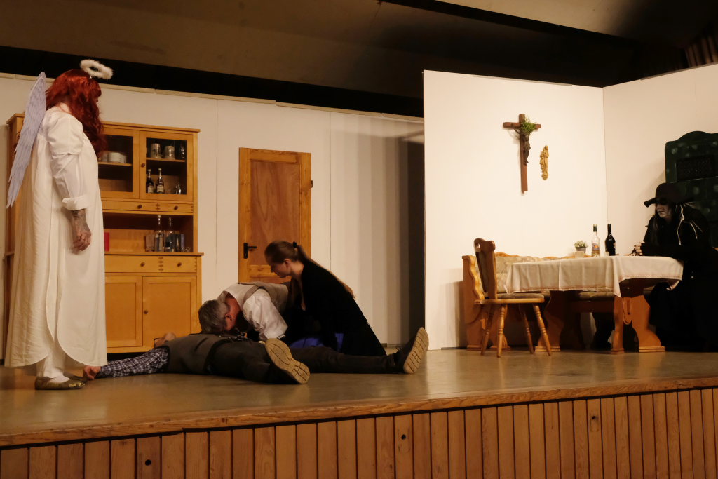 Da war etwa der Erzengel Michael, der – deutlich emanzipiert in Zeiten des Genderns – eine Michaela war, welcher Gudrun Weiss Stimme und himmlische Gestalt verlieh. Die Erzengelin Michaela war auch „Disponentin“ für den mit dem Moped zwischen den Welten herumgeisternden Boandlkramer, dessen Rolle seinem Darsteller Markus Brauchle auf den Leib geschneidert zu sein schien und in der er sich so richtig austoben durfte. Wie bei Don Camillo meldete sich auch hier hin und wieder der liebe Gott persönlich zu Wort, dem Karl Schöllhorn Stimme und göttliches Gewicht verlieh und dessen „Auftritte“ von einem Disco-ähnlichen Blinken des Kreuzes an der Stubenwand begleitet wurden.
