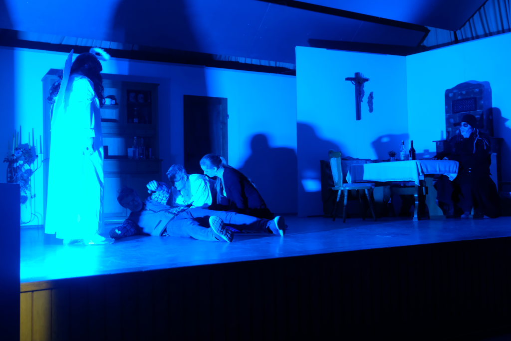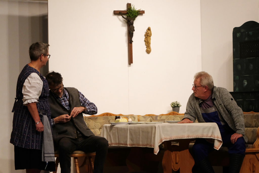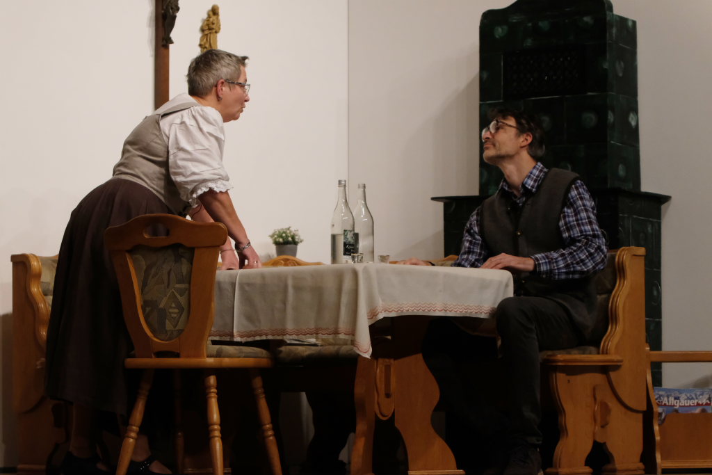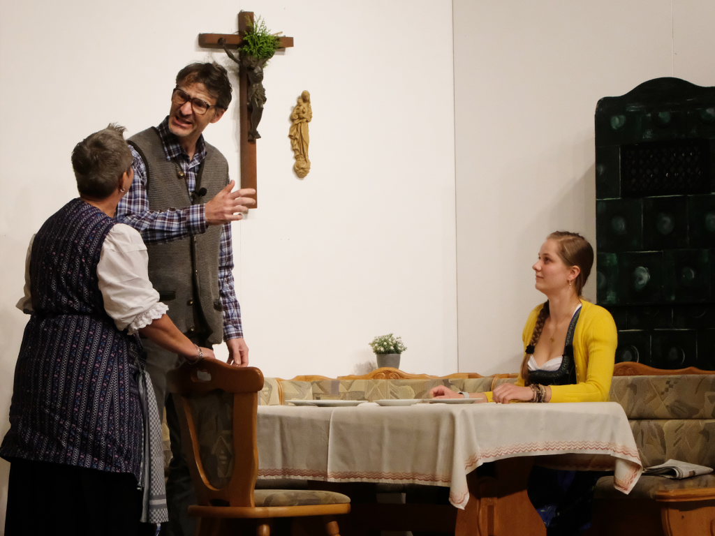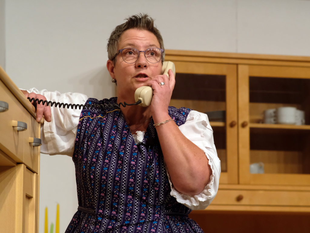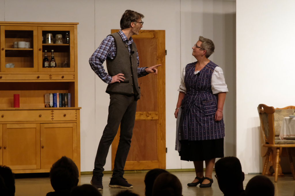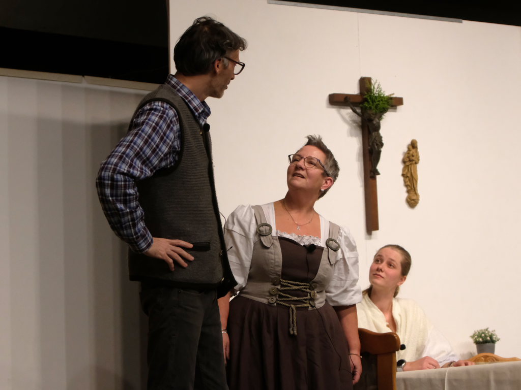 Da war etwa der Erzengel Michael, der – deutlich emanzipiert in Zeiten des Genderns – eine Michaela war, welcher Gudrun Weiss Stimme und himmlische Gestalt verlieh. Die Erzengelin Michaela war auch „Disponentin“ für den mit dem Moped zwischen den Welten herumgeisternden Boandlkramer, dessen Rolle seinem Darsteller Markus Brauchle auf den Leib geschneidert zu sein schien und in der er sich so richtig austoben durfte. Wie bei Don Camillo meldete sich auch hier hin und wieder der liebe Gott persönlich zu Wort, dem Karl Schöllhorn Stimme und göttliches Gewicht verlieh und dessen „Auftritte“ von einem Disco-ähnlichen Blinken des Kreuzes an der Stubenwand begleitet wurden.