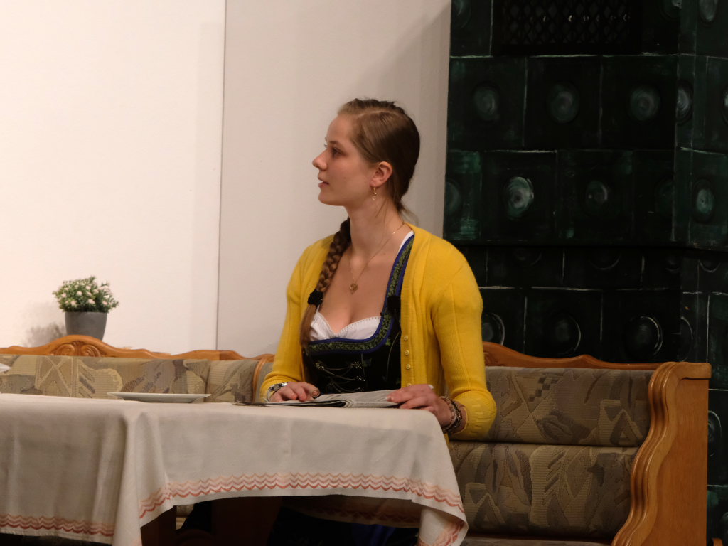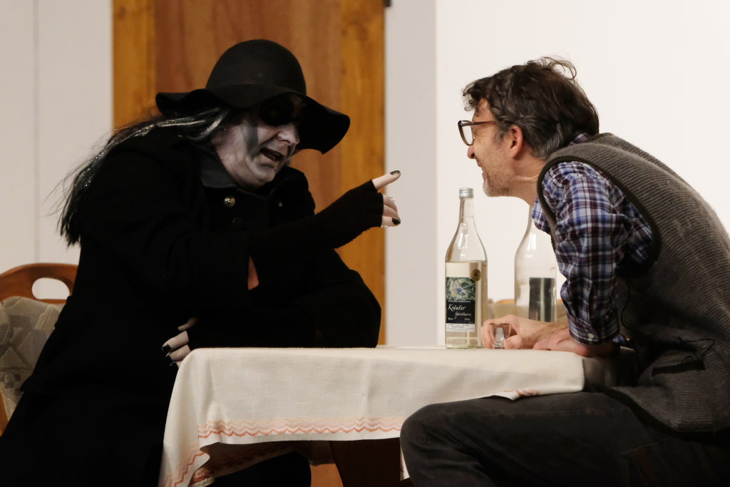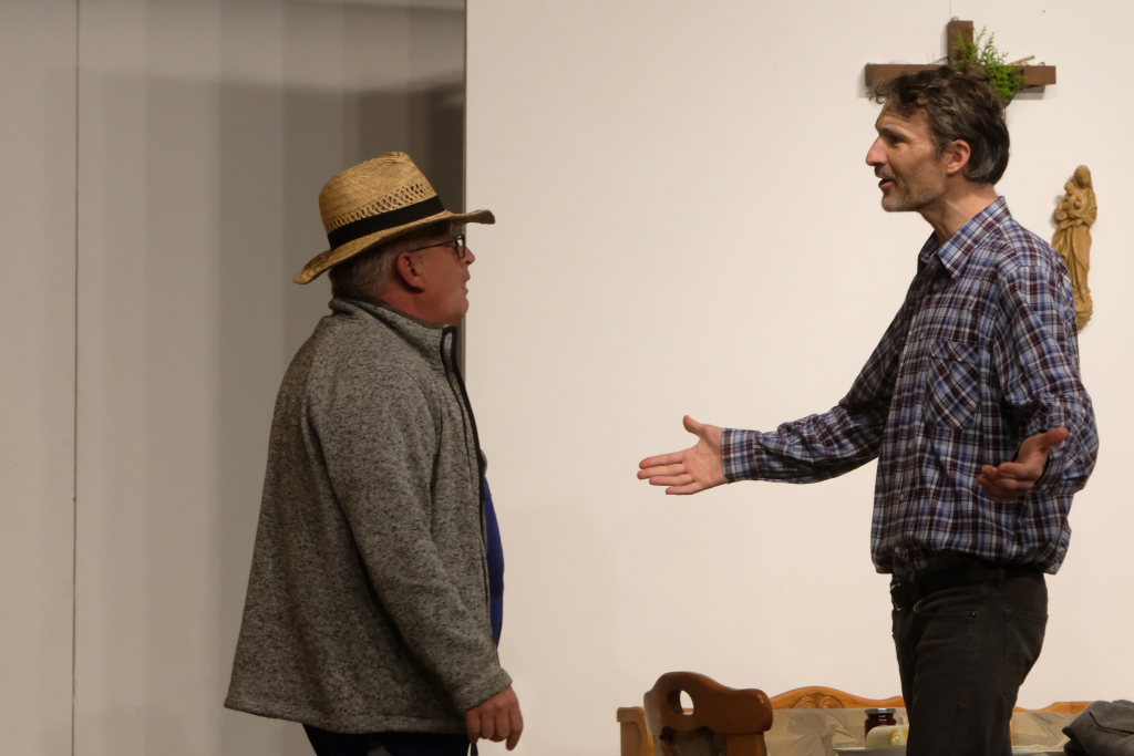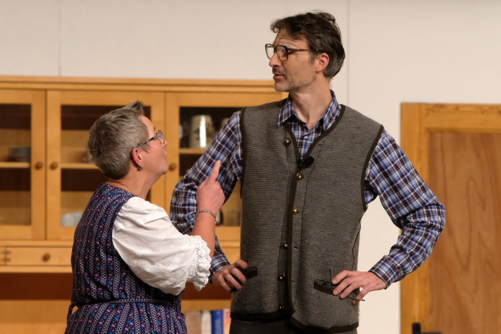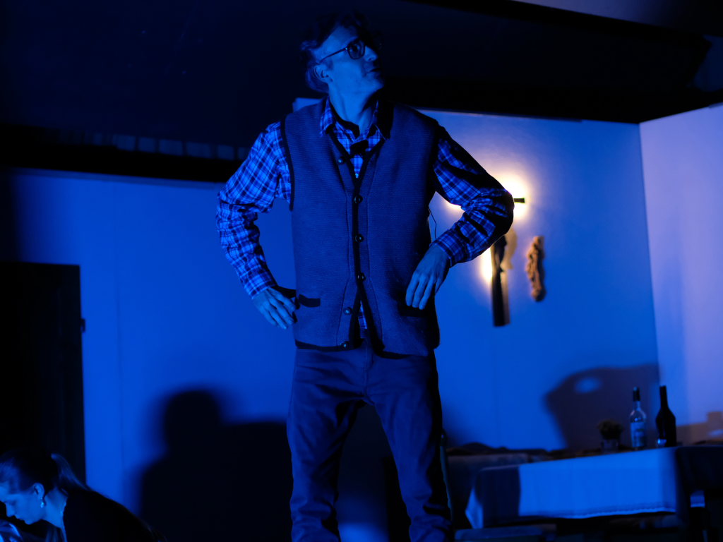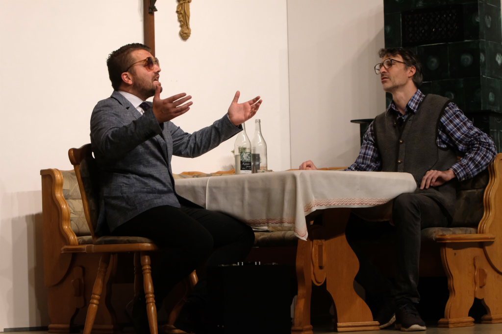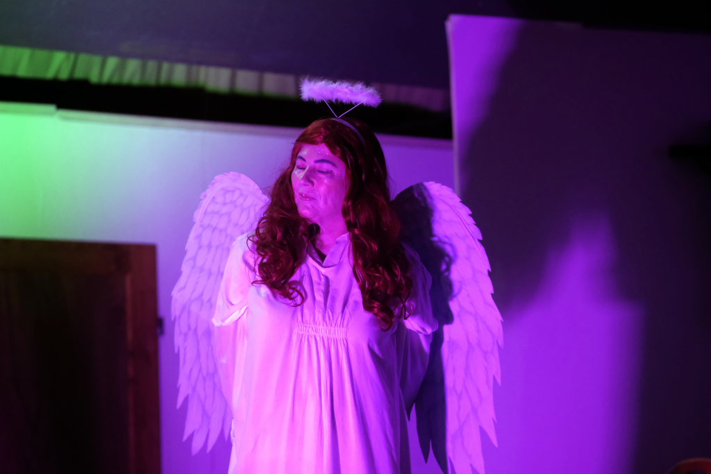 Da war etwa der Erzengel Michael, der – deutlich emanzipiert in Zeiten des Genderns – eine Michaela war, welcher Gudrun Weiss Stimme und himmlische Gestalt verlieh. Die Erzengelin Michaela war auch „Disponentin“ für den mit dem Moped zwischen den Welten herumgeisternden Boandlkramer, dessen Rolle seinem Darsteller Markus Brauchle auf den Leib geschneidert zu sein schien und in der er sich so richtig austoben durfte. Wie bei Don Camillo meldete sich auch hier hin und wieder der liebe Gott persönlich zu Wort, dem Karl Schöllhorn Stimme und göttliches Gewicht verlieh und dessen „Auftritte“ von einem Disco-ähnlichen Blinken des Kreuzes an der Stubenwand begleitet wurden.