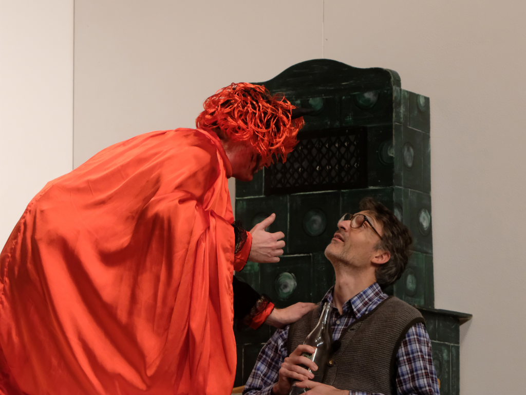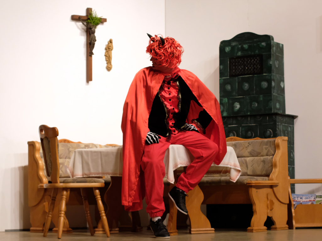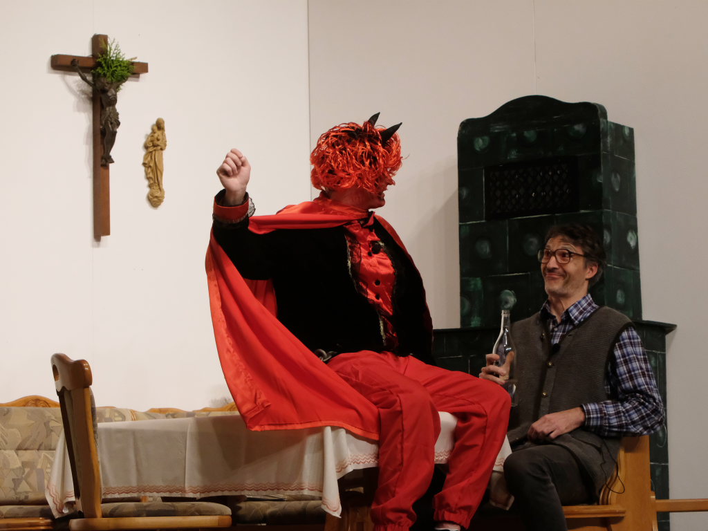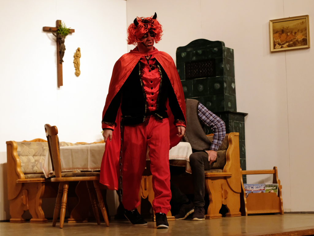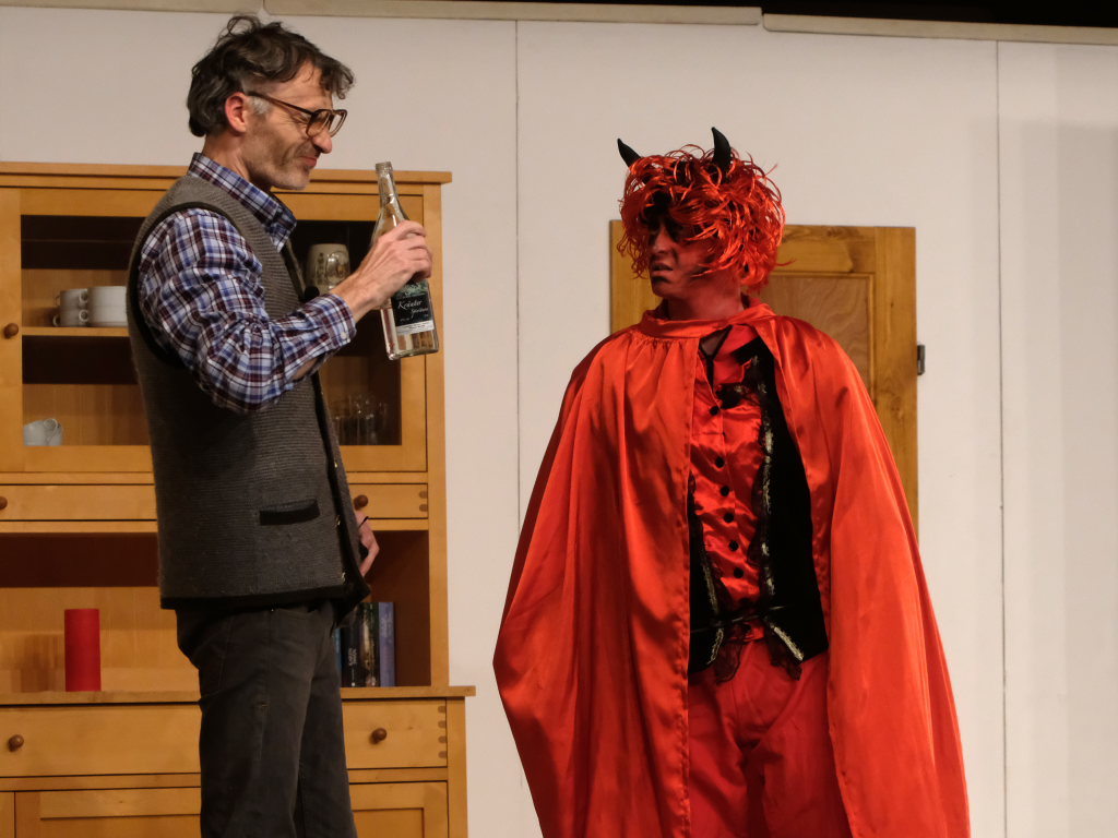 Wo Licht ist gibt es bekanntlich auch Schatten: Aufgrund des bis dato zweifelhaften Charakters von Sepp Stemmer, der sich nicht zu schade war, bei einem Grundstücksgeschäft seinen einzigen Freund und Nachbarn Toni Eppsteiner (Ulrich Rettenmaier) über den Tisch ziehen zu wollen. Eingefädelt hatte dies Raphael Kroll als Bürgermeister Herr Ehrlich, der seine Rolle nicht gerade als typischen deutschen Beamten anlegte. Wäre da nicht Eppsteiners Ehefrau Moni (Angelika Treuer) gewesen, die fest zu Rosi und Vroni Stemmer stand, auch wenn die beiden Männer sich mal miteinander kämpfend auf dem Boden wälzten, ja dann hätte es für die Seele von Sepp Stemmer schon schlecht ausgesehen. Denn der Teufel hatte schon in Gestalt von Beelzebub (Jan Gapp) seine Finger nach dem reichen und nimmersatten Bauern ausgestreckt. Diesem kam zugute, dass der Boandlkramer, dessen Gewerbe n.D. Transporte (nur Dode) heißt, ein furchtbar schlechter Kartenspieler ist und beim Trinken rein gar nichts verträgt. So dass Sepp diesen bei einem Gelage leicht auf seine Seite ziehen konnte, als ihm der Ernst seiner Lage bewusst wurde.