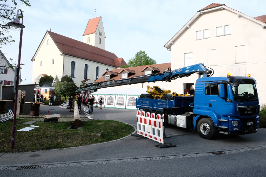 Vor zahlreichen Gästen und Schaulustigen, die bis hinauf zur Kirche stehend das Spektakel beobachteten, war es für den Lkw-Kran ein Leichtes, den geschmückten Baum anzuheben und dank der Muskelkraft einiger Feuerwehrleute und einem Radlader zur Stabilisierung ihn an den vorgesehenen Platz zu navigieren.
