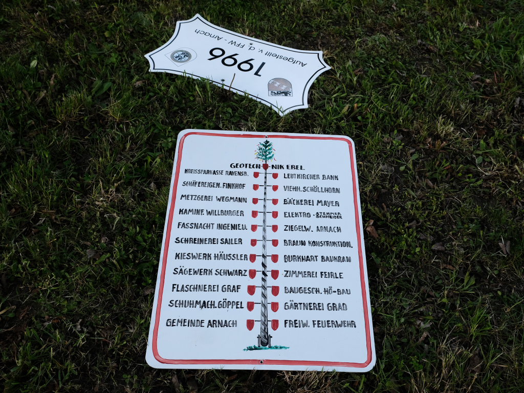Auf 23 Tafeln haben sich – neben den beiden Banken (auch die Kreissparkasse Ravensburg hatte lange Jahre in Arnach eine Filiale betrieben) – vor allem die Arnacher Geschäftswelt sowie natürlich die Gemeinde selbst und die Feuerwehr mit ihren Berufssymbolen verewigt.