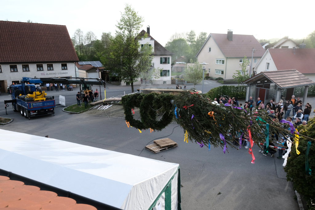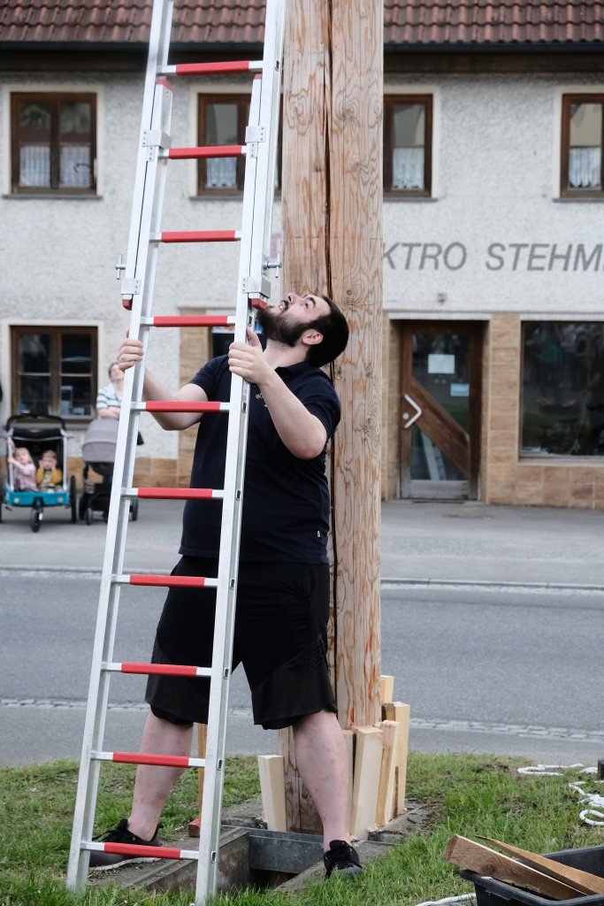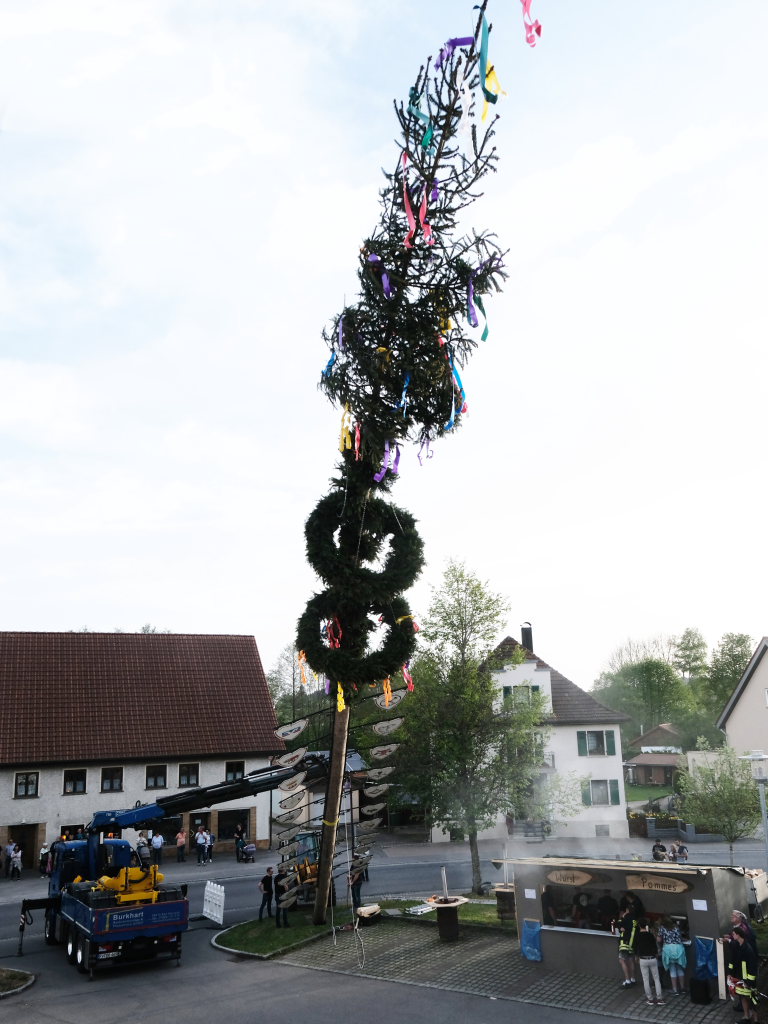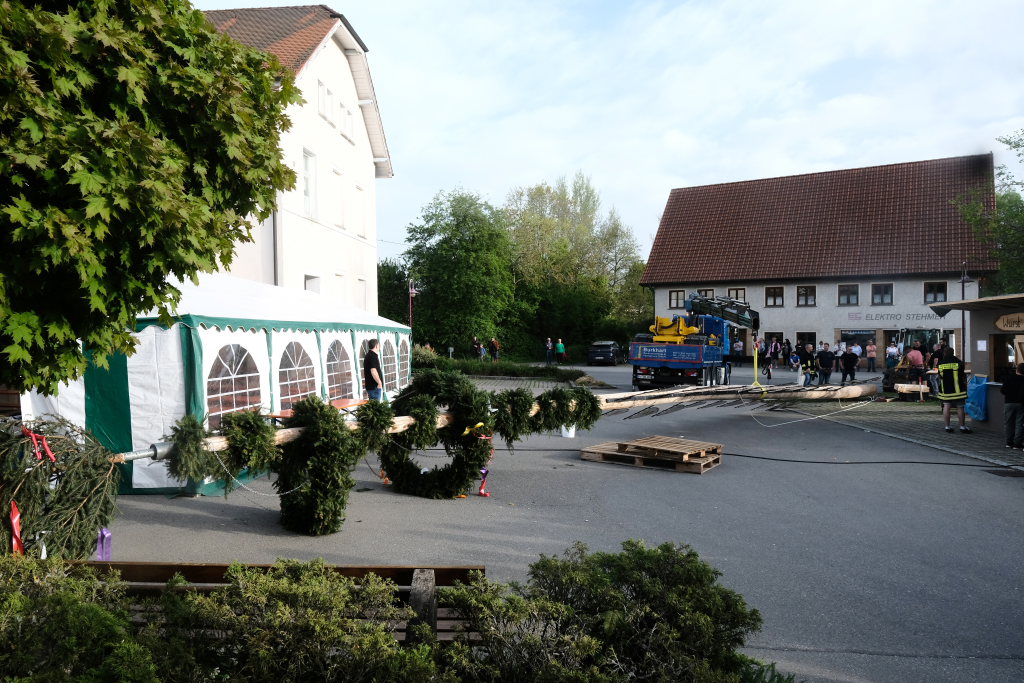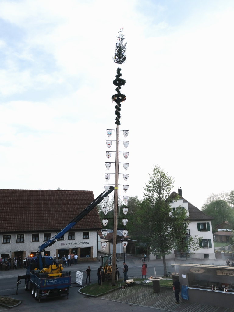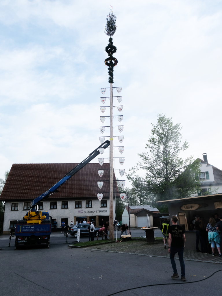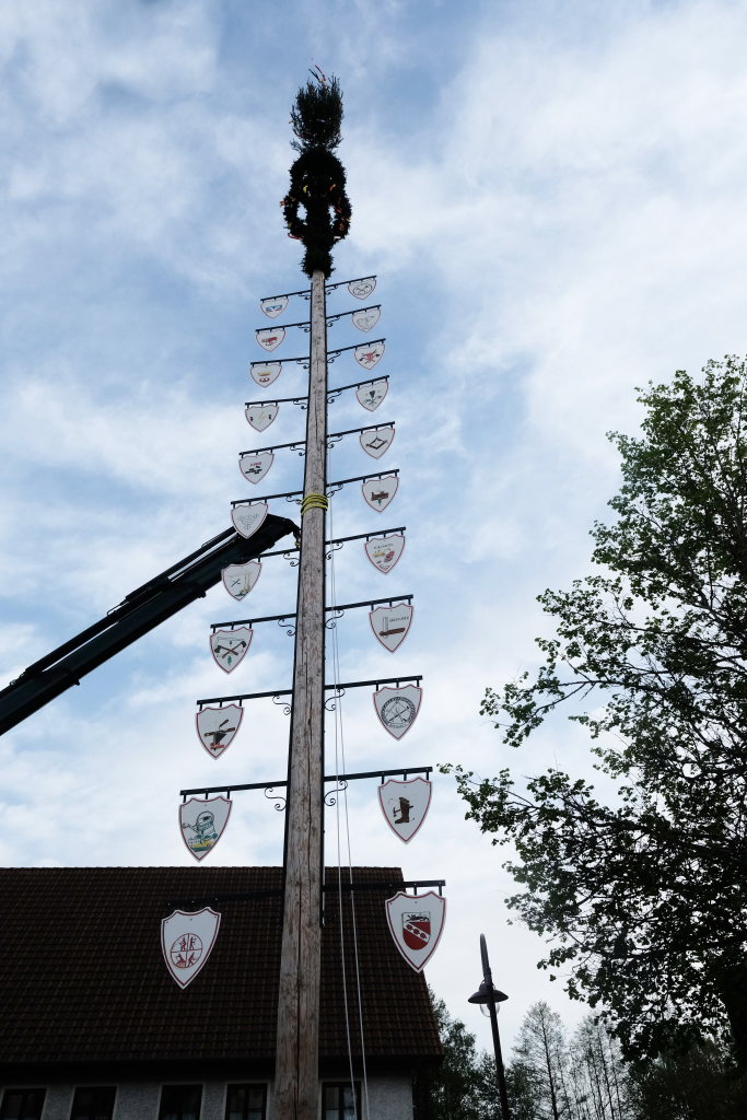 Arnach – Bereits zum 28. Mal wurde der Arnacher Maibaum von vielen fleißigen Helfern der Feuerwehr hergerichtet und Dienstag, 30. April, um 19.00 Uhr auf dem Platz beim Feuerwehrhaus aufgestellt. Musikalisch begleitete das Maibaumstellen traditionell eine kleine Besetzung der Musikkapelle Arnach.