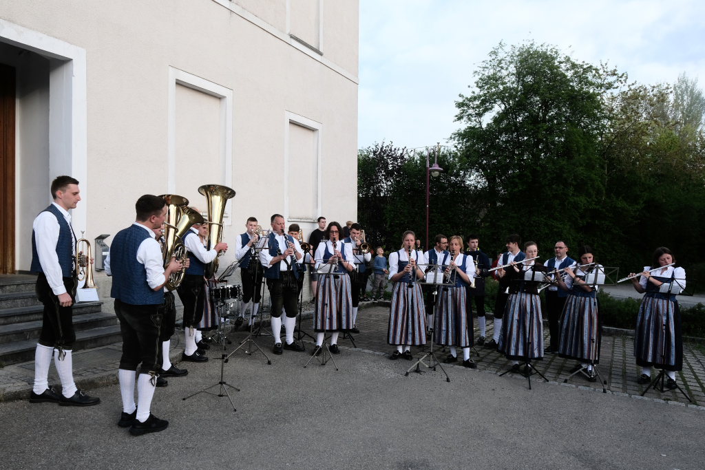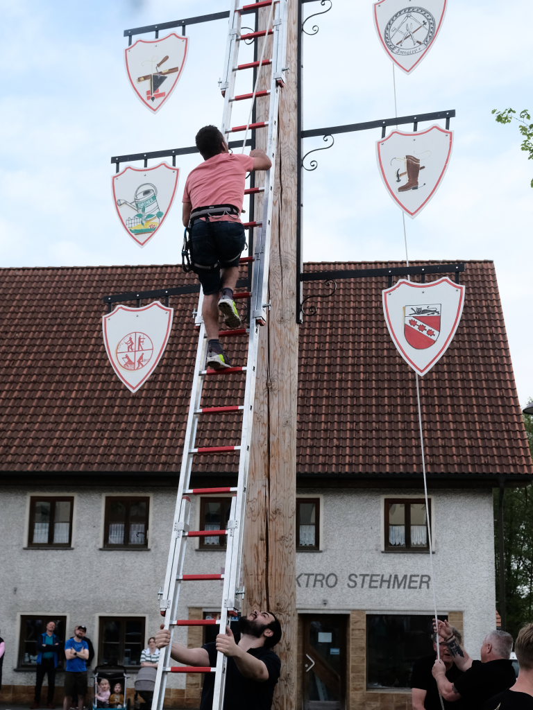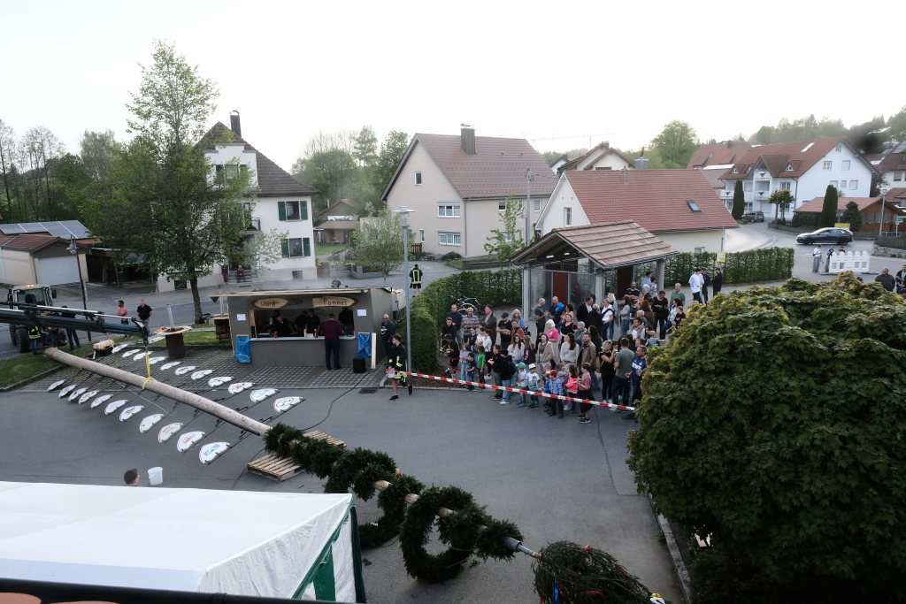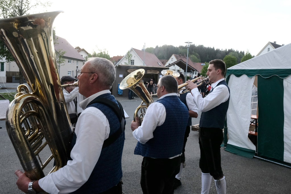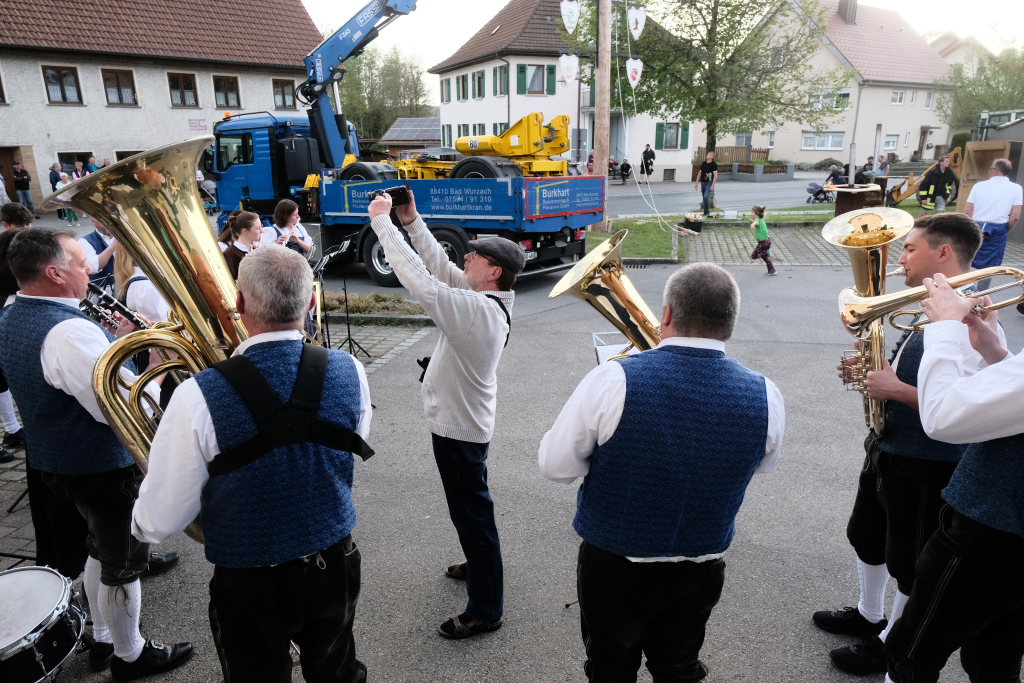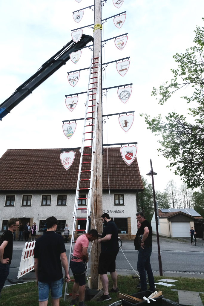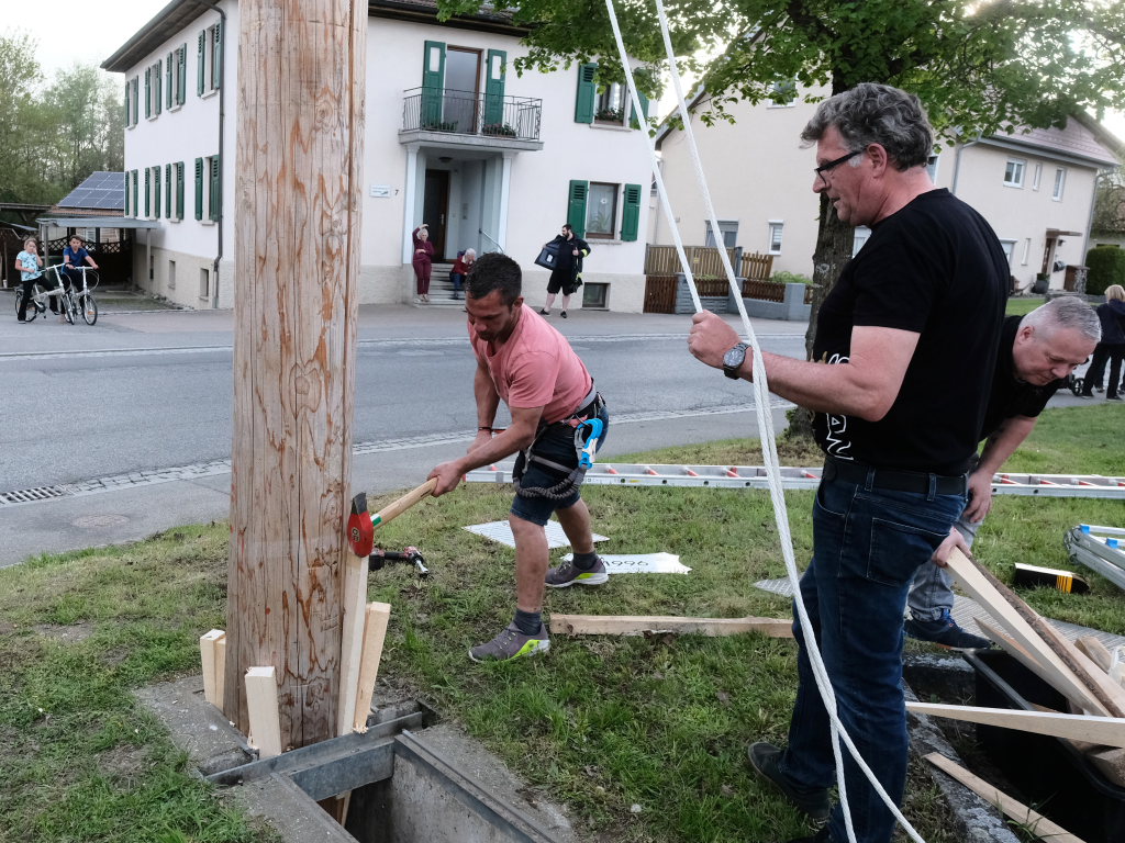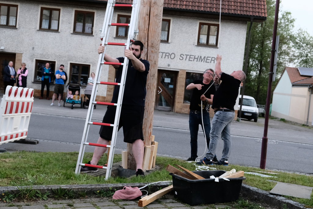 Arnach – Bereits zum 28. Mal wurde der Arnacher Maibaum von vielen fleißigen Helfern der Feuerwehr hergerichtet und Dienstag, 30. April, um 19.00 Uhr auf dem Platz beim Feuerwehrhaus aufgestellt. Musikalisch begleitete das Maibaumstellen traditionell eine kleine Besetzung der Musikkapelle Arnach.