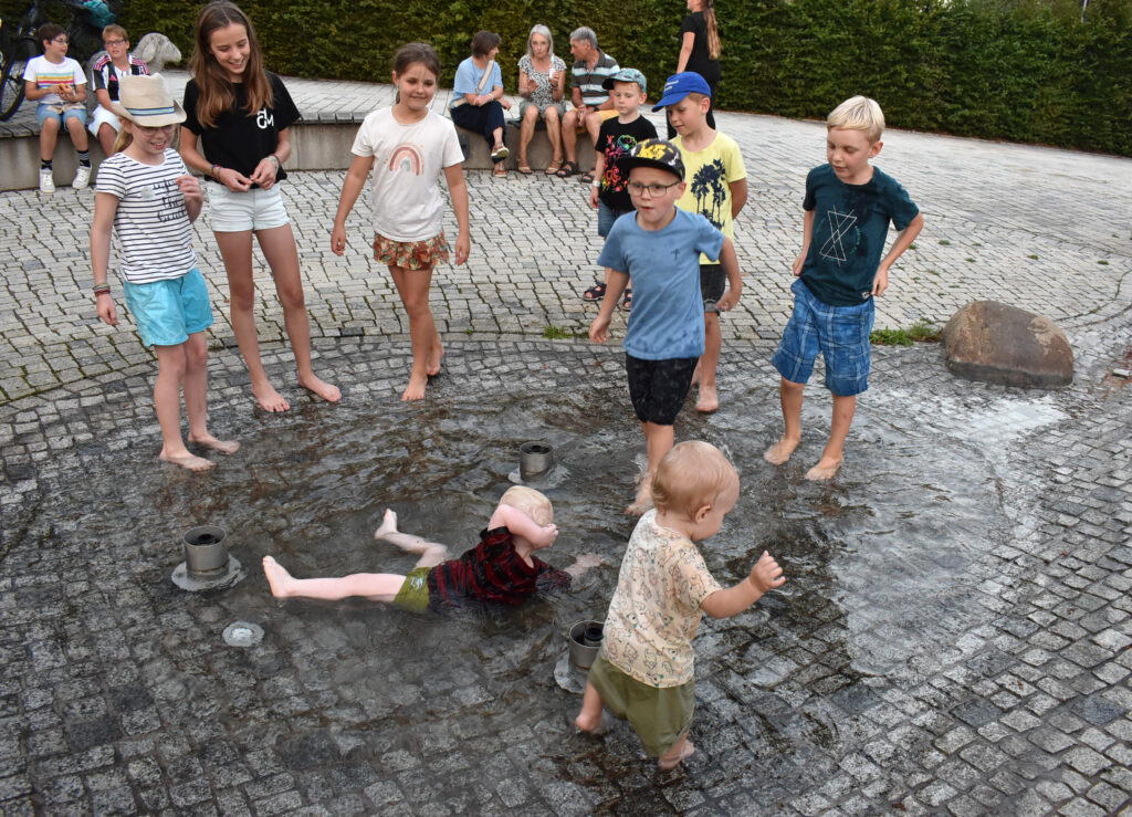 Das Blasmusik-Ensemble „Hie und da“ unterhielt mit feinen Stücken, auch mit Gesang sowie mit Witzen von „Jay-Jay“, Jochen Jöchle. Die Kinder vergnügten sich am Brunnen, scheuten das Nass nicht, doch an diesem lauen Sommerabend war das kein Problem. Bei Einbruch der Dunkelheit ging der Vollmond auf und zauberte zusammen mit den bunten Lichtern eine schöne Atmosphäre. Lange noch saßen die Arnacher zusammen.