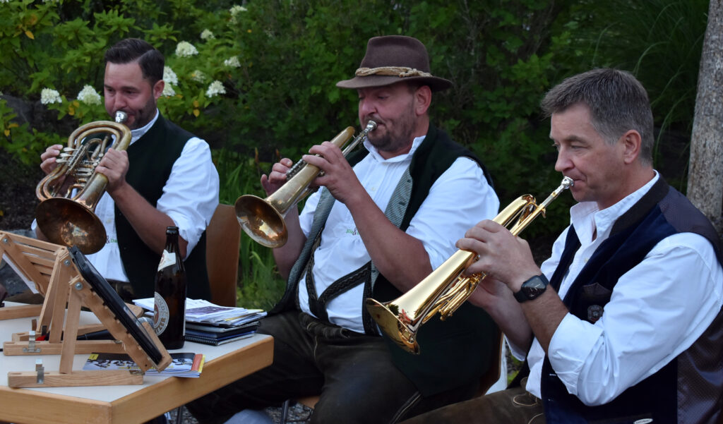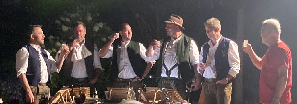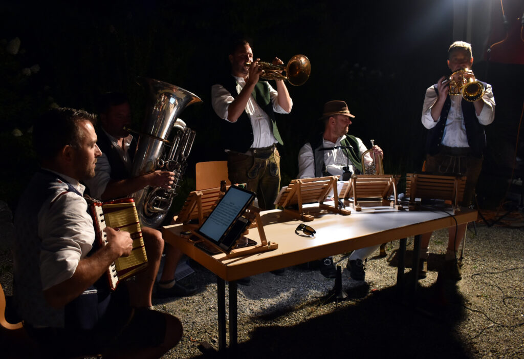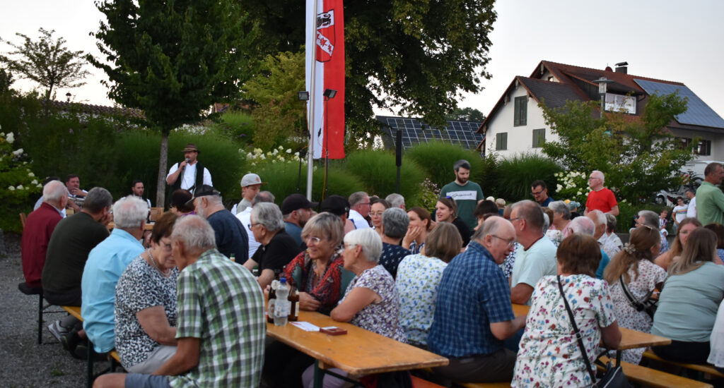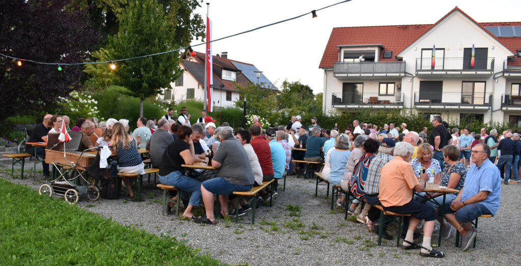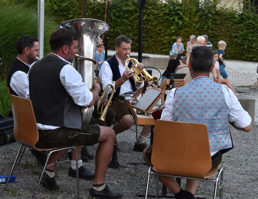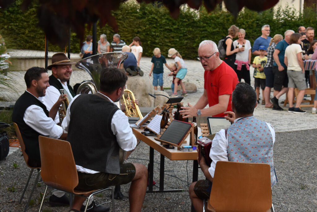 Arnach – Die schönen Abende derzeit laden richtig ein zum Draußensitzen. Und so hatte auch ein Organisationsteam aus Arnach richtig Glück am Samstagabend (9.8.). Sie hatten zu einer Hockete mit „Wirtshausmusik ohne Wirtshaus“ am schönen Dorfplatz neben der Kirche eingeladen. Die Bierbänke füllten sich schnell, rund 200 Menschen aus der 1300-Seelen-Gemeinde fanden sich ein. Bei schöner handgemachter Blasmusik des Ensembles „Hie und Da“ saßen oder standen die Leut zusammen, unterhielten sich angeregt, genossen ganz klassisch Wurst und Wecken, dazu Getränke aller Art, und hatten schöne gemeinsame Stunden.