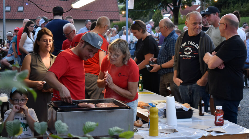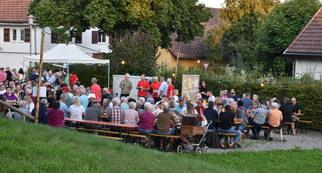 „Geplant hatten wird das schon vor Wochen, haben T-Shirts machen lassen und nun diese Art Dämmerschoppen an unserem schönen Dorfplatz organisiert. Die Schäferei-Genossenschaft Finkhof hat uns mit einer großzügigen Spende zu diesem Event unterstützt“, erzählen Peter Gottschling und Erwin Haller vom Orga-Team. Eine Tafel mit vielen Zetteln zeigte das große Interesse und die Ideen, die von den Dorfbewohnern stammen.