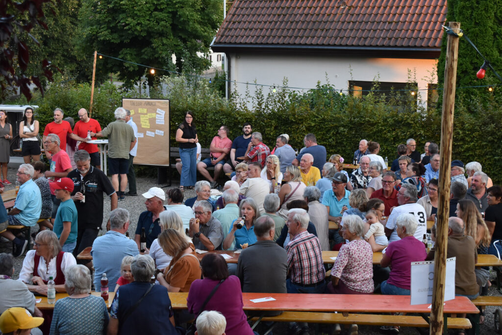 So wie diese gelungene Veranstaltung im Dorf, so wünschen sich viele Arnacher noch mehr davon. Die Initiatoren, mittendrin natürlich Ortsvorsteher (OV) Manfred Braun mit einem Dutzend weiterer Arnacher,  gut erkennbar am roten T-Shirt mit der Aufschrift „Unser Arnach“, warben für die schöne Idee, einen Dorf-Verein; und die Idee nahm an diesem Abend konkrete Formen an.