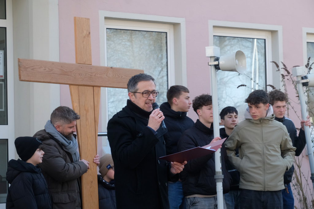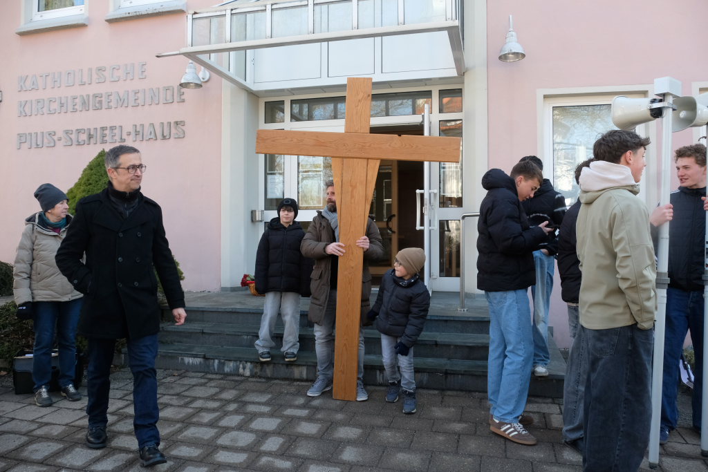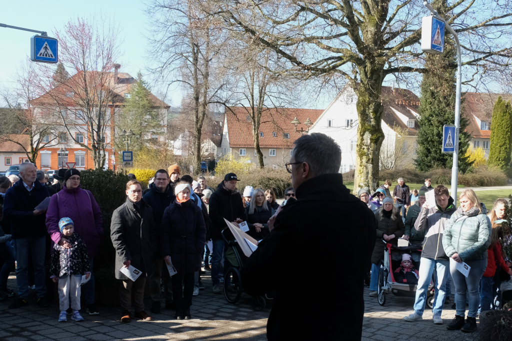 Die zweite Station kommt: „Jesus nimmt das Kreuz auf seine Schultern“. „Die Last des Kreuzes drückt bestimmt. Sie erdrückt Jesus“. „Doch er? Er steht aufrecht da. Erhobenen Hauptes nimmt er sein Kreuz an.“ „Er sagt ja zu dem Weg, der vor ihm liegt.“ An jeder Station wird von Raimund Miller eine Fürbitte vorgetragen und gemeinsam eine Liedstrophe gesungen, bei der Robert Häusle als Vorsänger fungiert.
