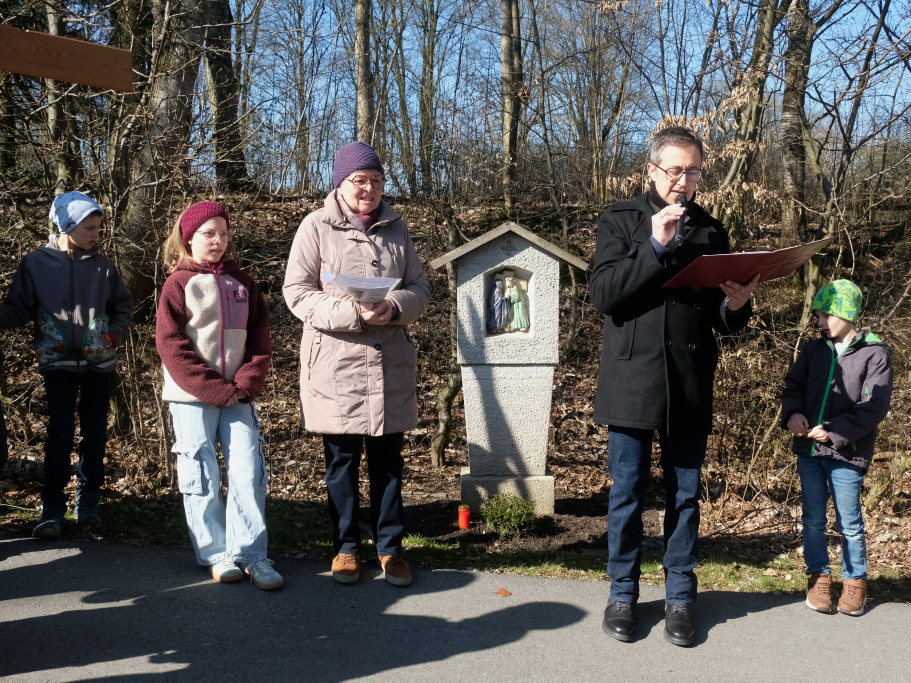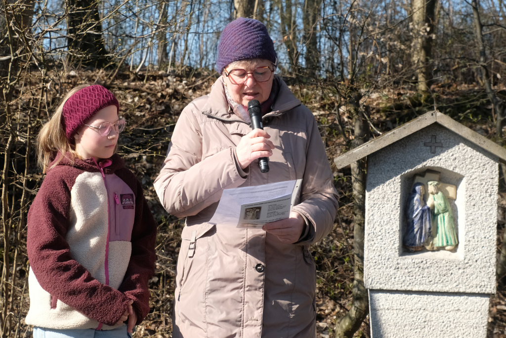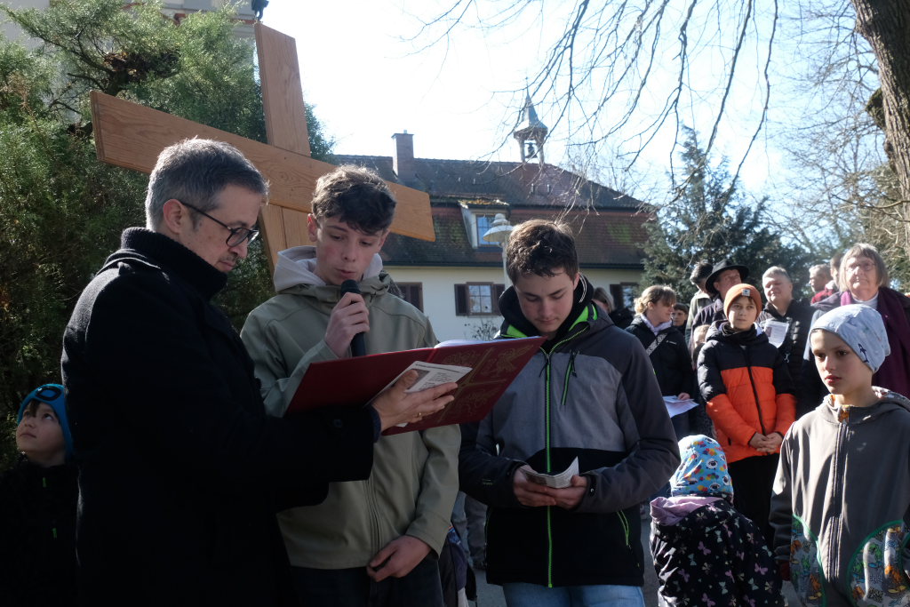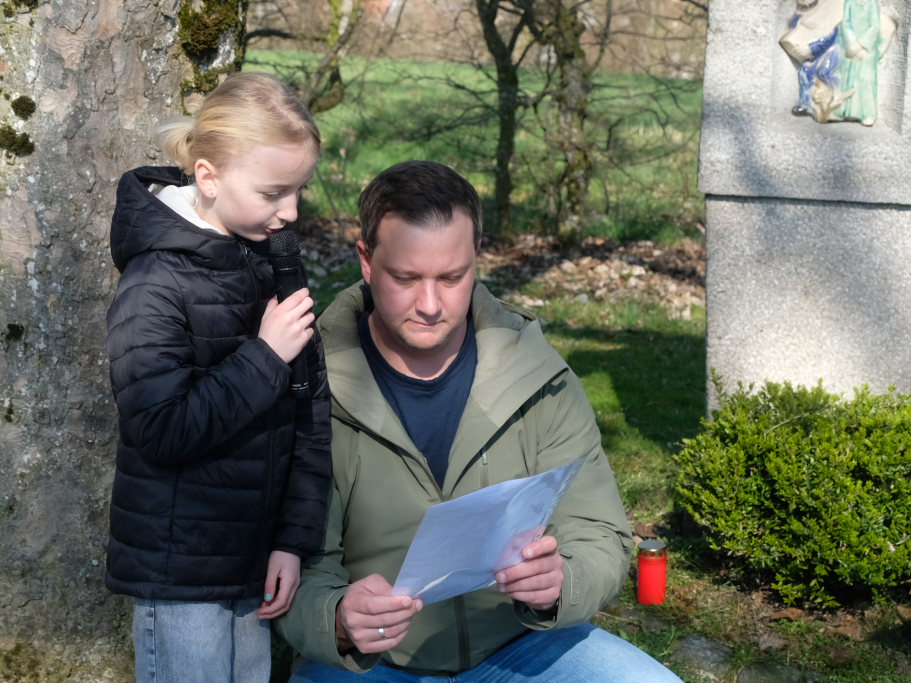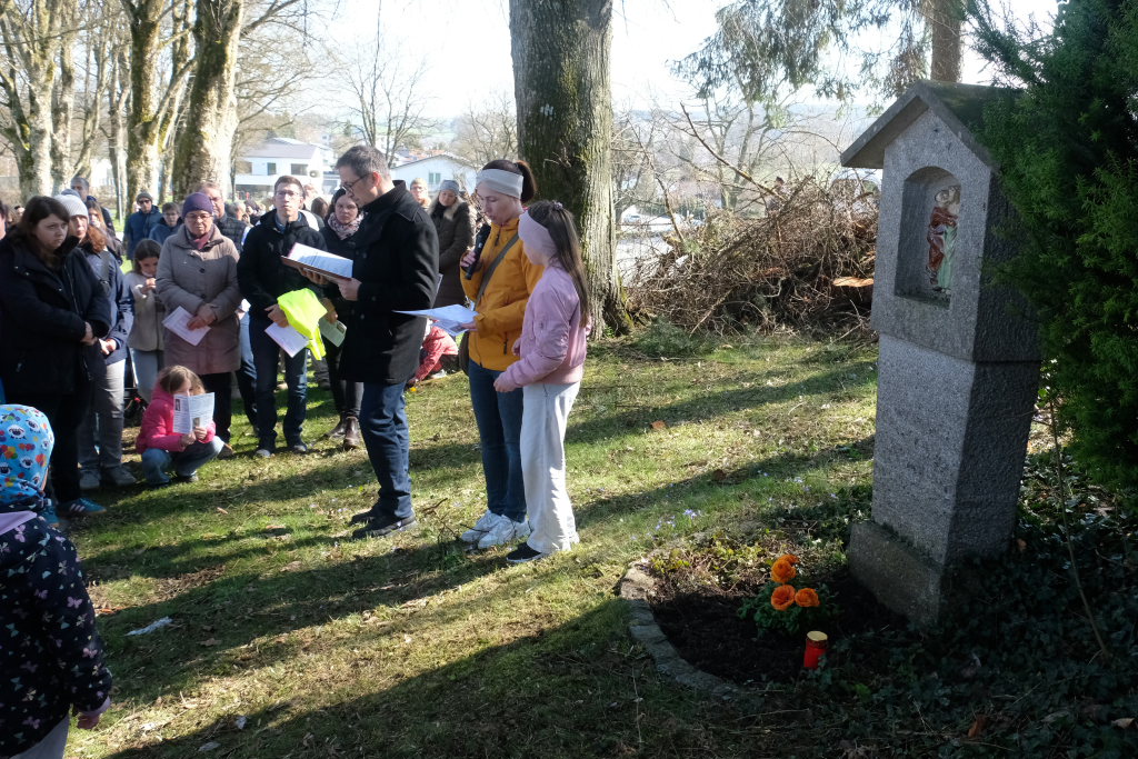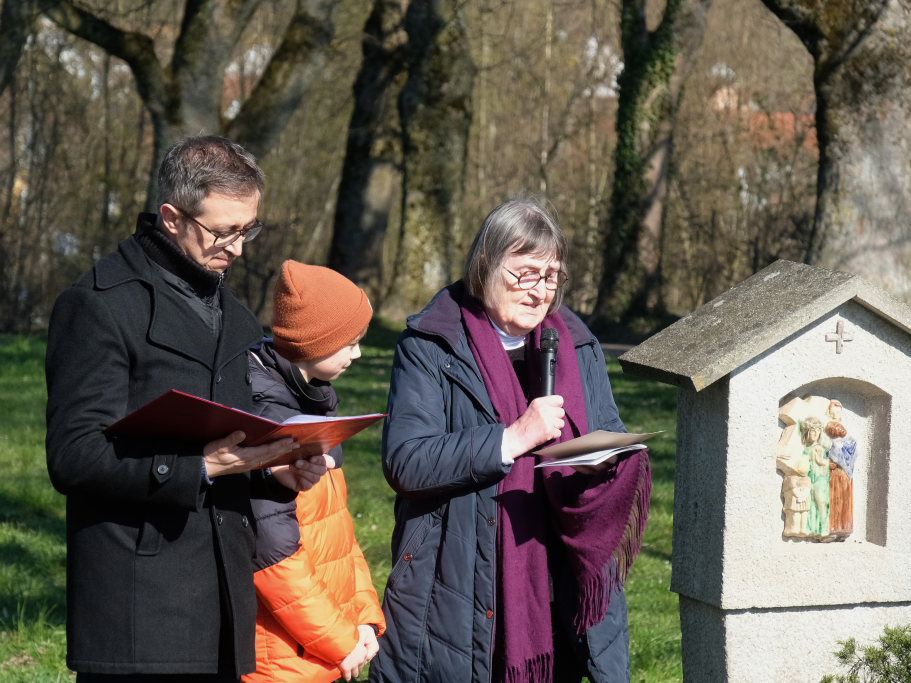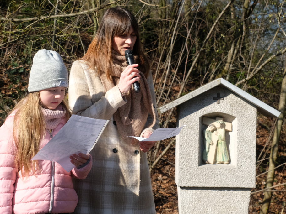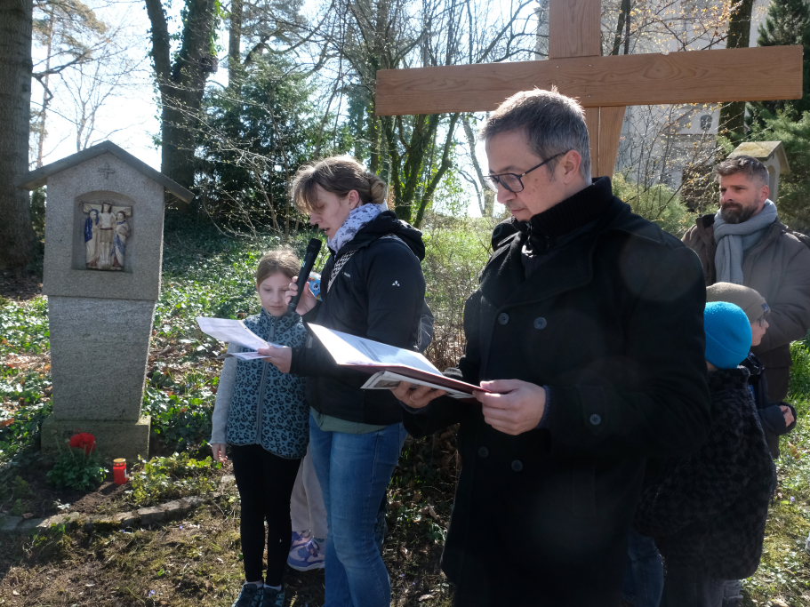 Bernadette Miller, Ehefrau von Organisationsleiter Raimund Miller, hatte mit ihren Drittklässlern an der Grundschule die Texte – wie den der ersten Station – neu erarbeitet. Die Texte wurden dann von Bernadette und Raimund Miller sowie Kindern von Erstkommunion-Familien verlesen.