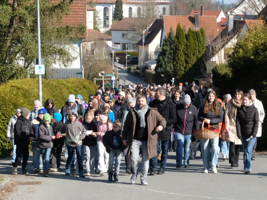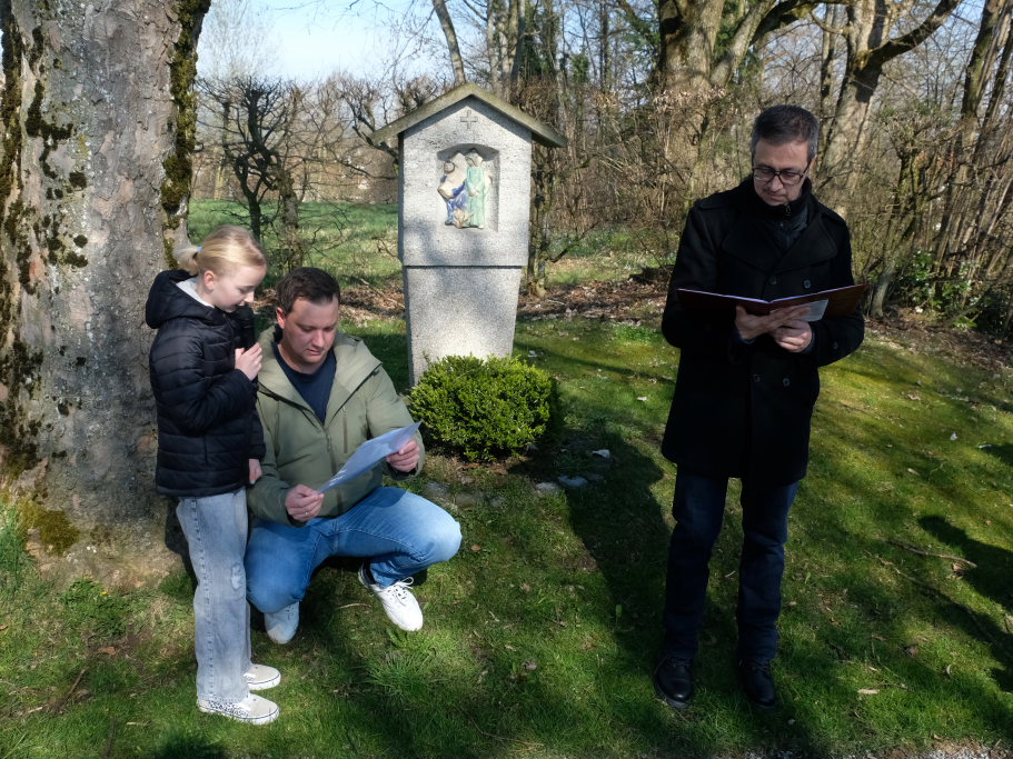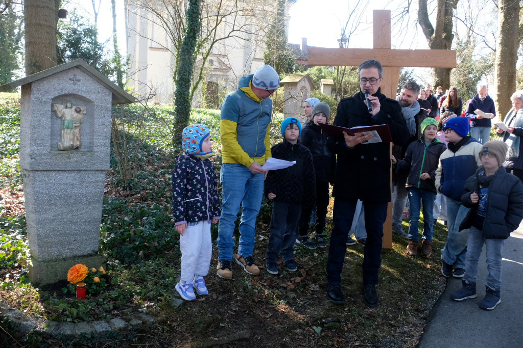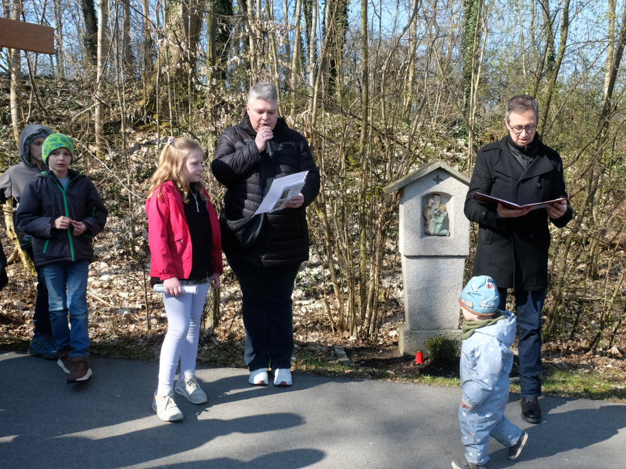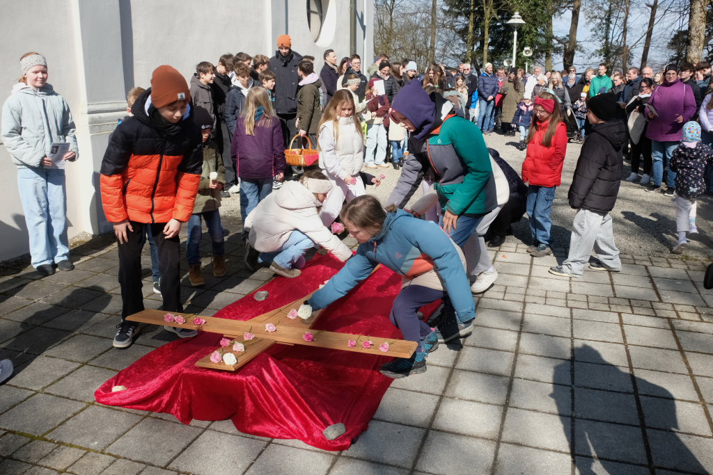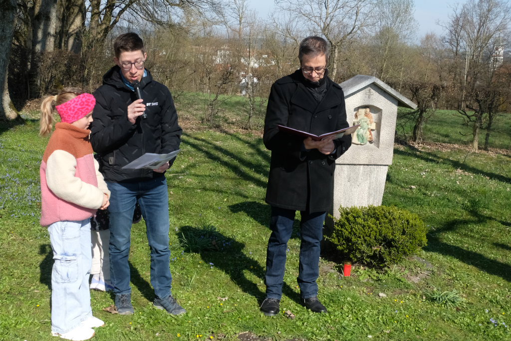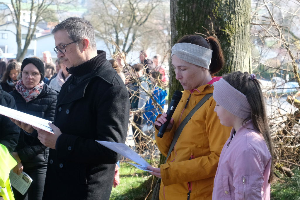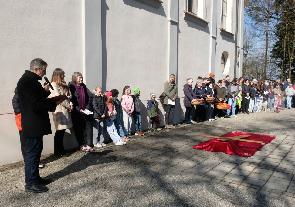 Bernadette Miller, Ehefrau von Organisationsleiter Raimund Miller, hatte mit ihren Drittklässlern an der Grundschule die Texte – wie den der ersten Station – neu erarbeitet. Die Texte wurden dann von Bernadette und Raimund Miller sowie Kindern von Erstkommunion-Familien verlesen.