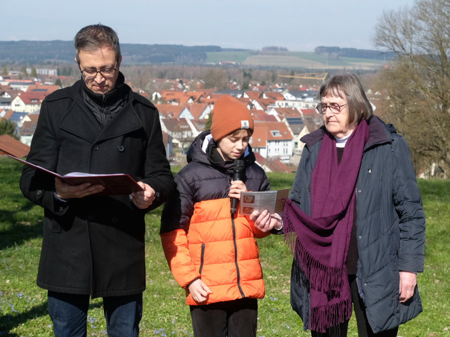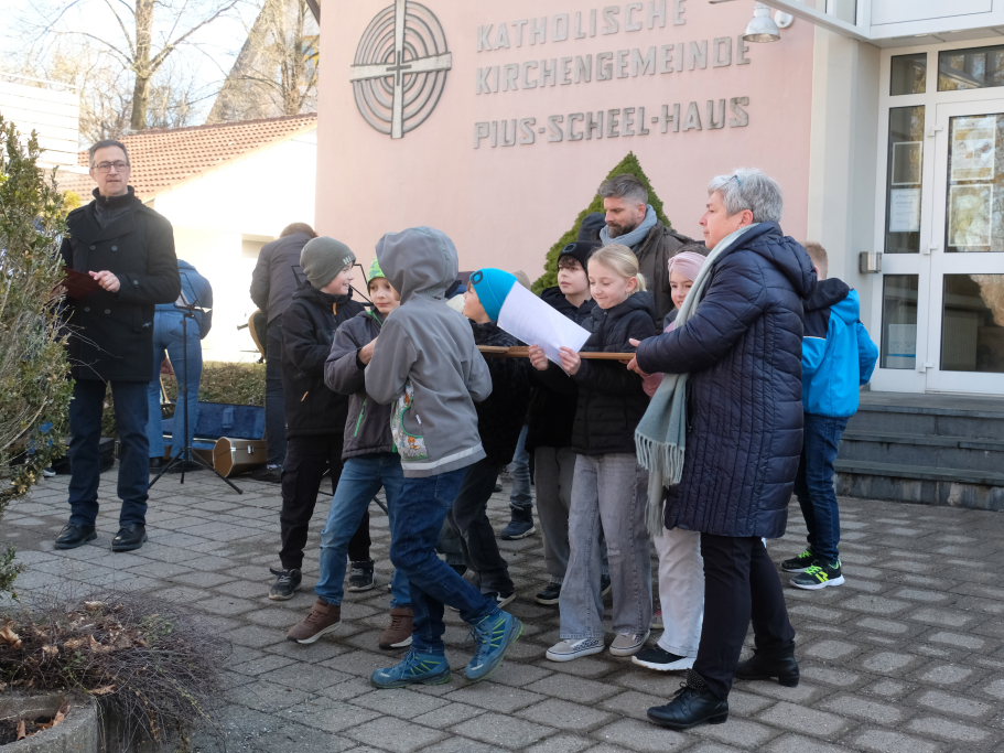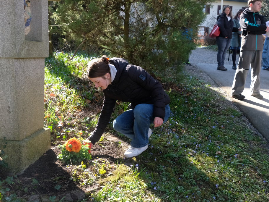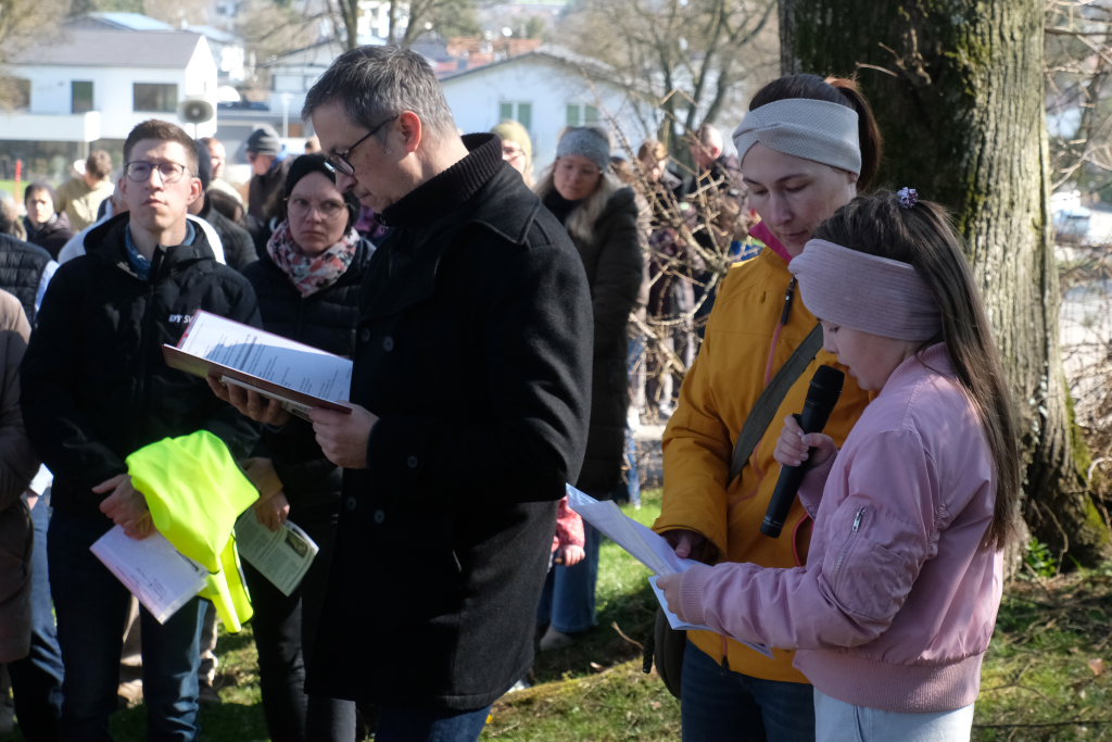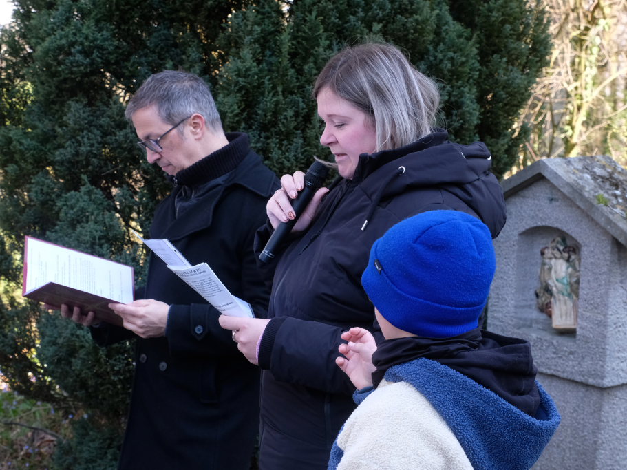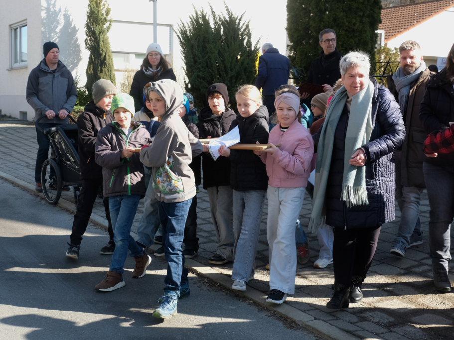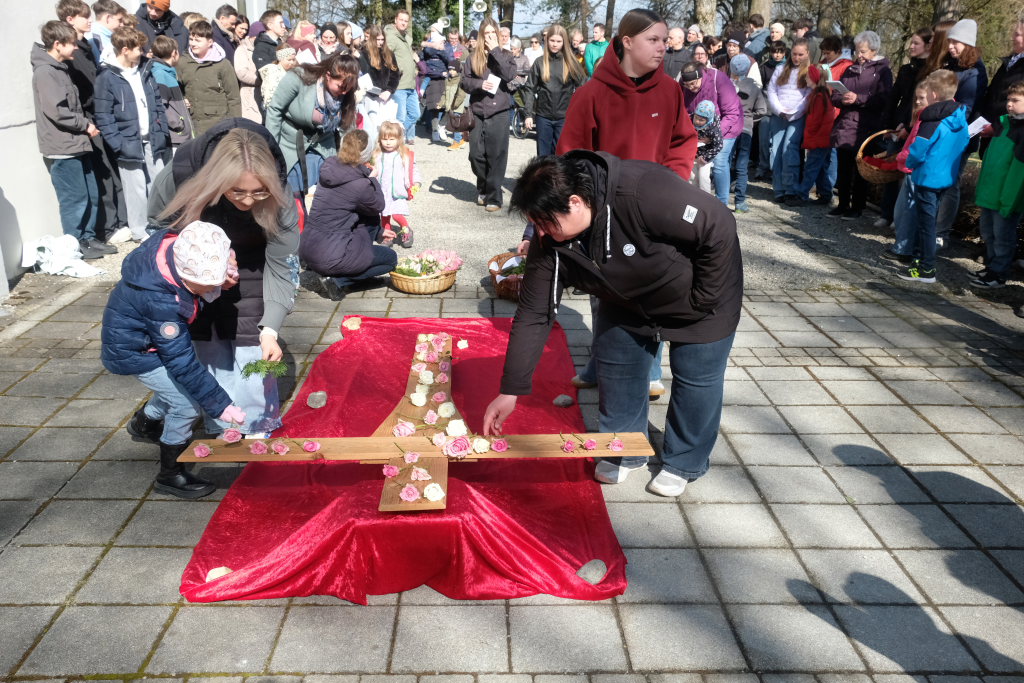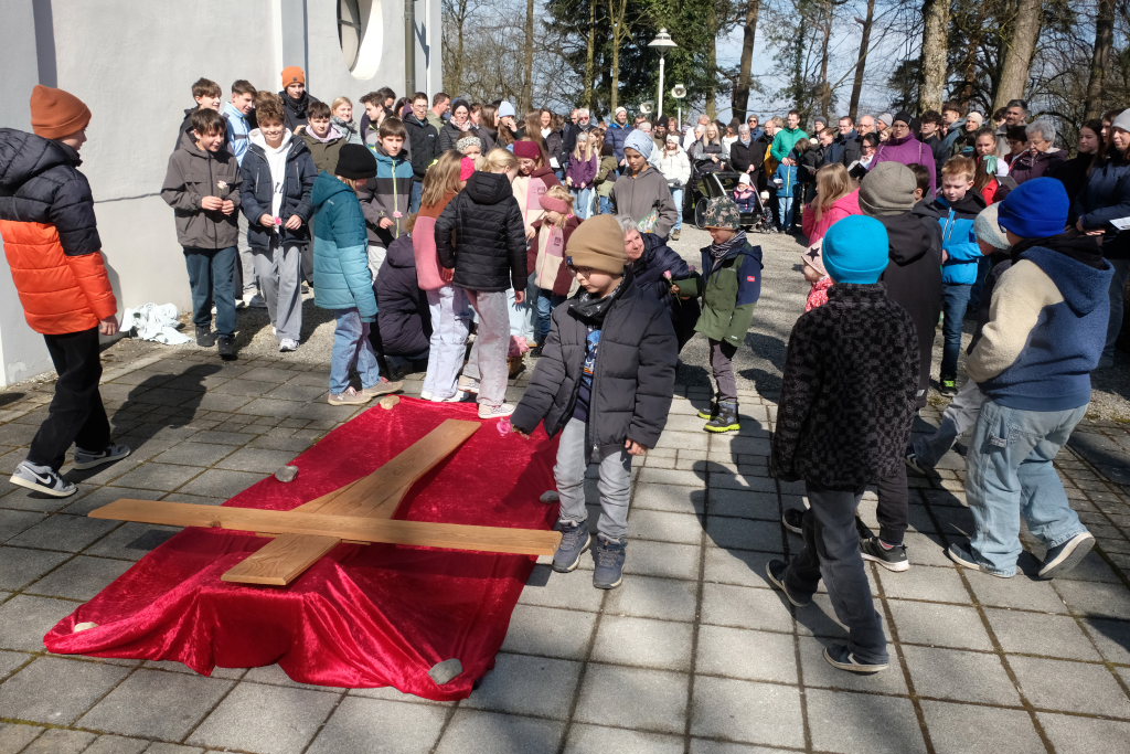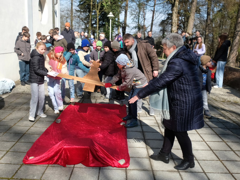 Bernadette Miller, Ehefrau von Organisationsleiter Raimund Miller, hatte mit ihren Drittklässlern an der Grundschule die Texte – wie den der ersten Station – neu erarbeitet. Die Texte wurden dann von Bernadette und Raimund Miller sowie Kindern von Erstkommunion-Familien verlesen.