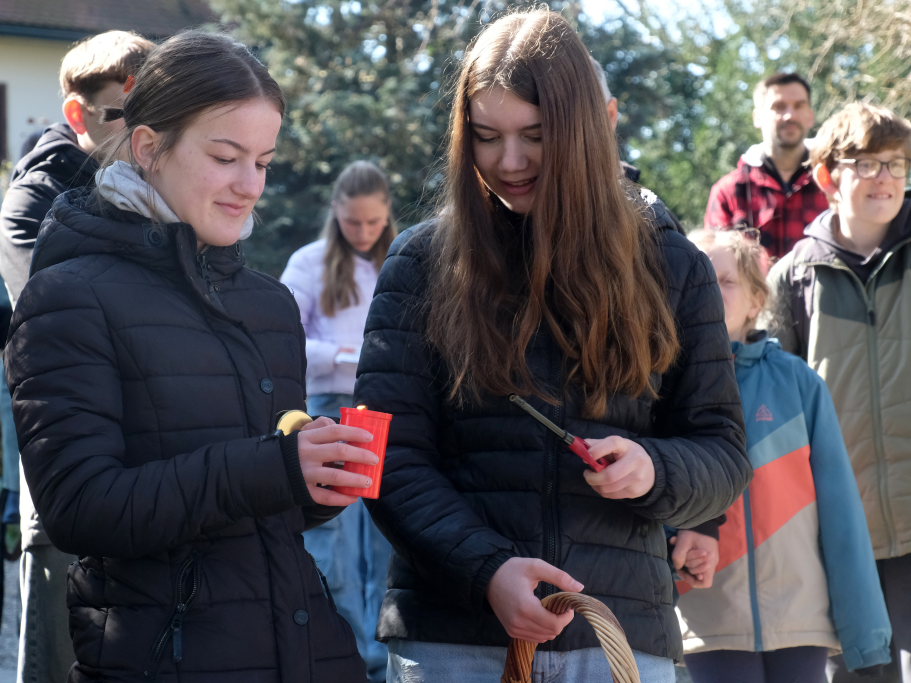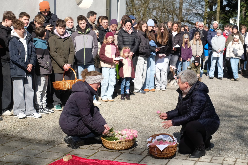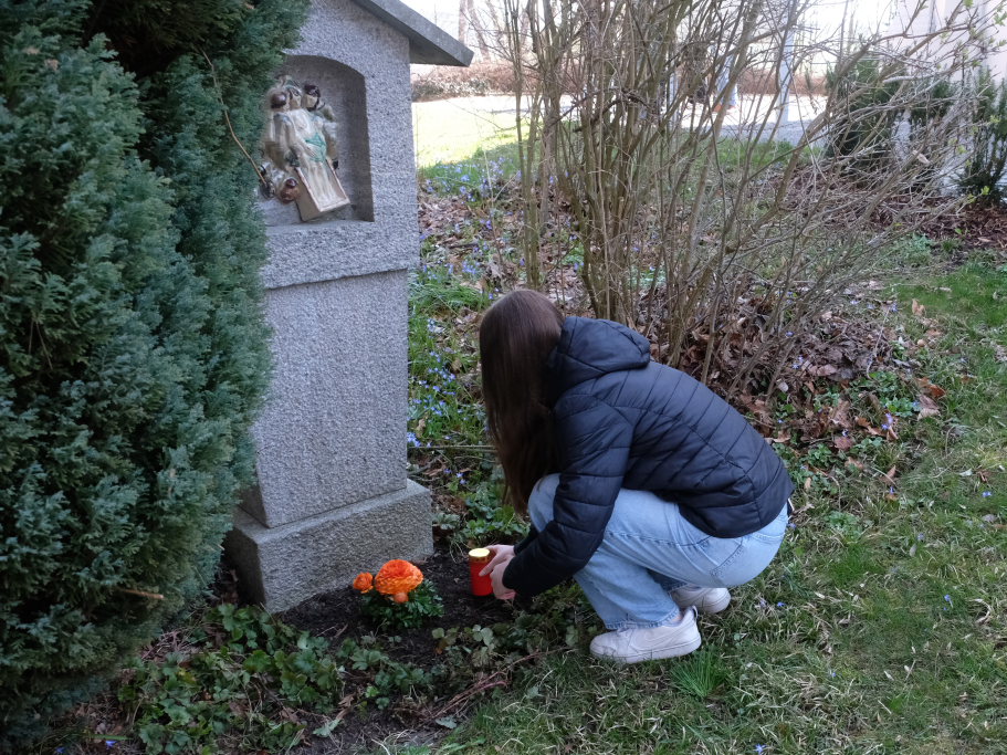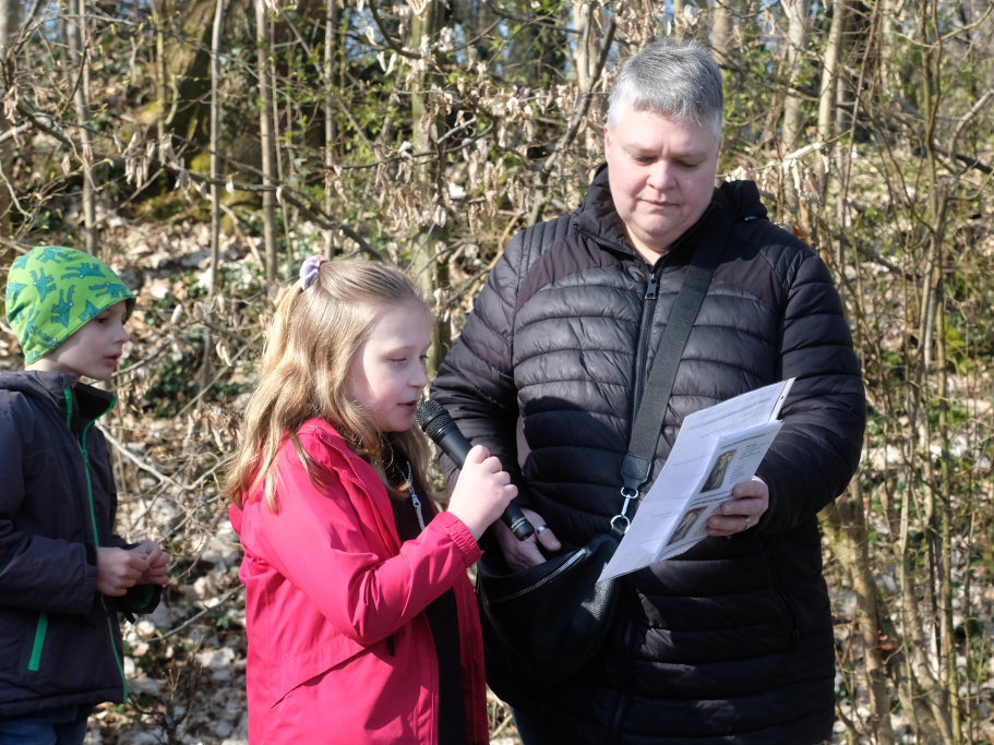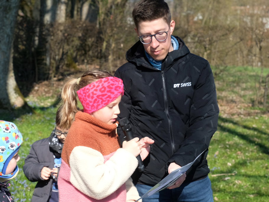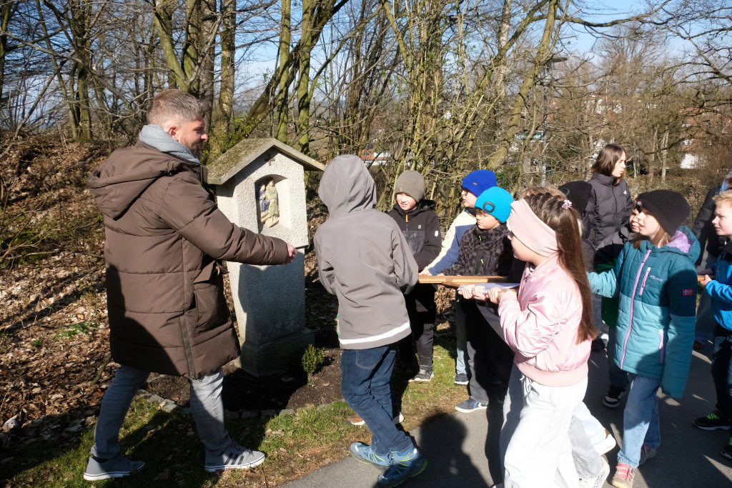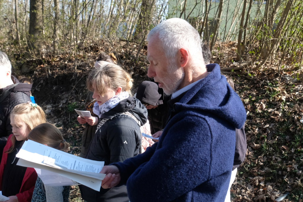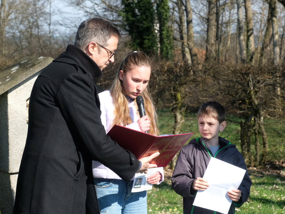 Bernadette Miller, Ehefrau von Organisationsleiter Raimund Miller, hatte mit ihren Drittklässlern an der Grundschule die Texte – wie den der ersten Station – neu erarbeitet. Die Texte wurden dann von Bernadette und Raimund Miller sowie Kindern von Erstkommunion-Familien verlesen.