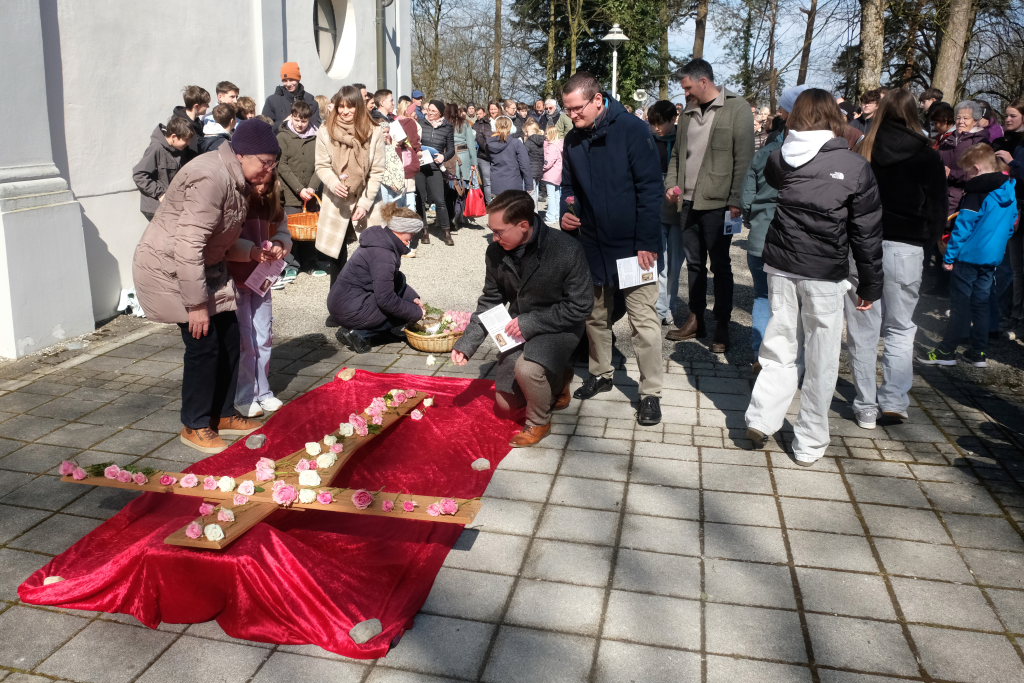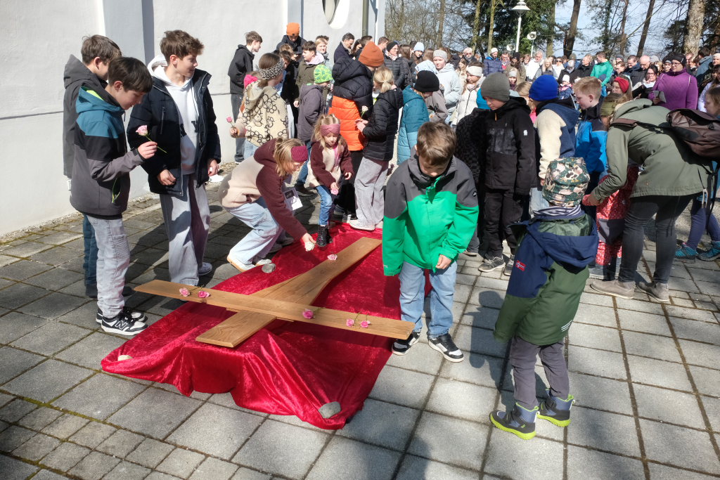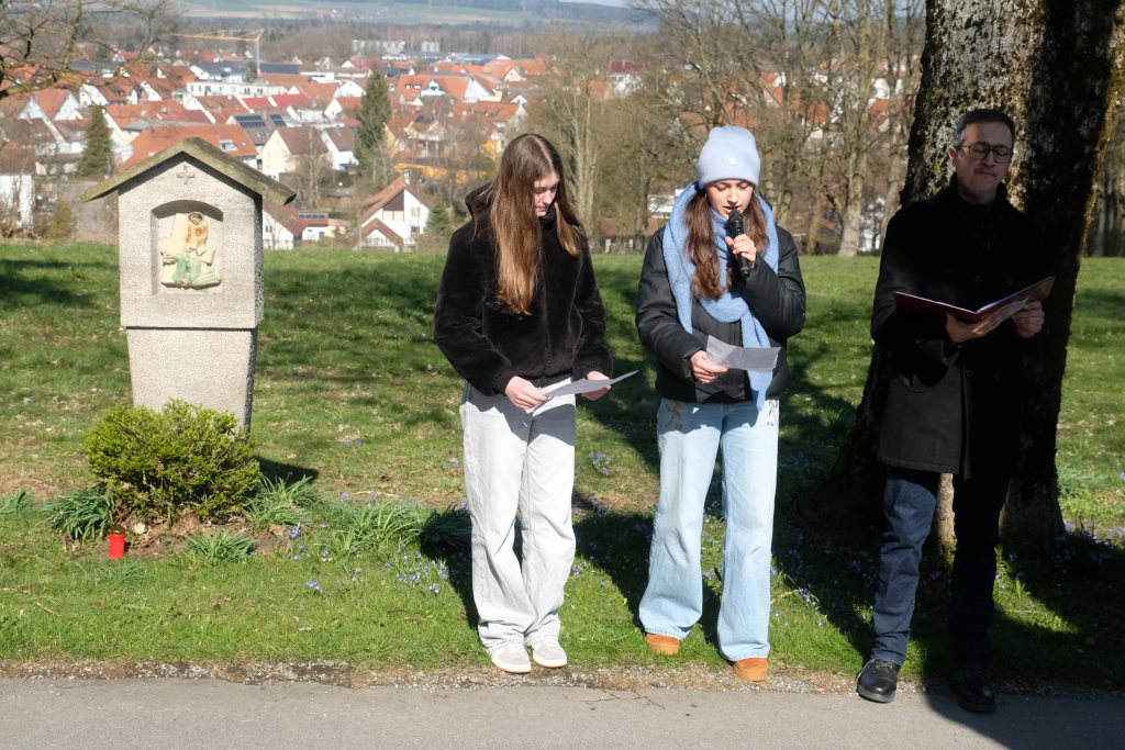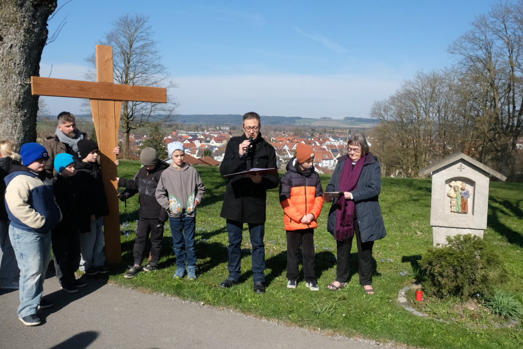 Bad Wurzach – Gemeinsam mit dem Pastoralreferenten Raimund Miller startete an diesem Karfreitagvormittag eine große Zahl von Familien vom Pius-Scheel-Haus hinauf zum Gottesberg, um die Leidensgeschichte Jesu an den 14 Kreuzwegstationen nachzuvollziehen. Seit mehr als 20 Jahren gibt es diese Tradition, die sich alljährlich immer größerer Beliebtheit erfreut. Neu war in diesem Jahr die musikalische Unterstützung durch Kirchenmusiker Robert Häusle und den Posaunenchor der evangelischen Kirchengemeinde. Zum Gedenken an das Sterben Jesu am Kreuz wurde von FirmbewerberInnen an jeder Station ein Grablicht abgestellt sowie eine Rose abgelegt.
