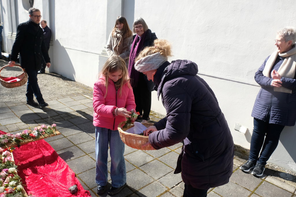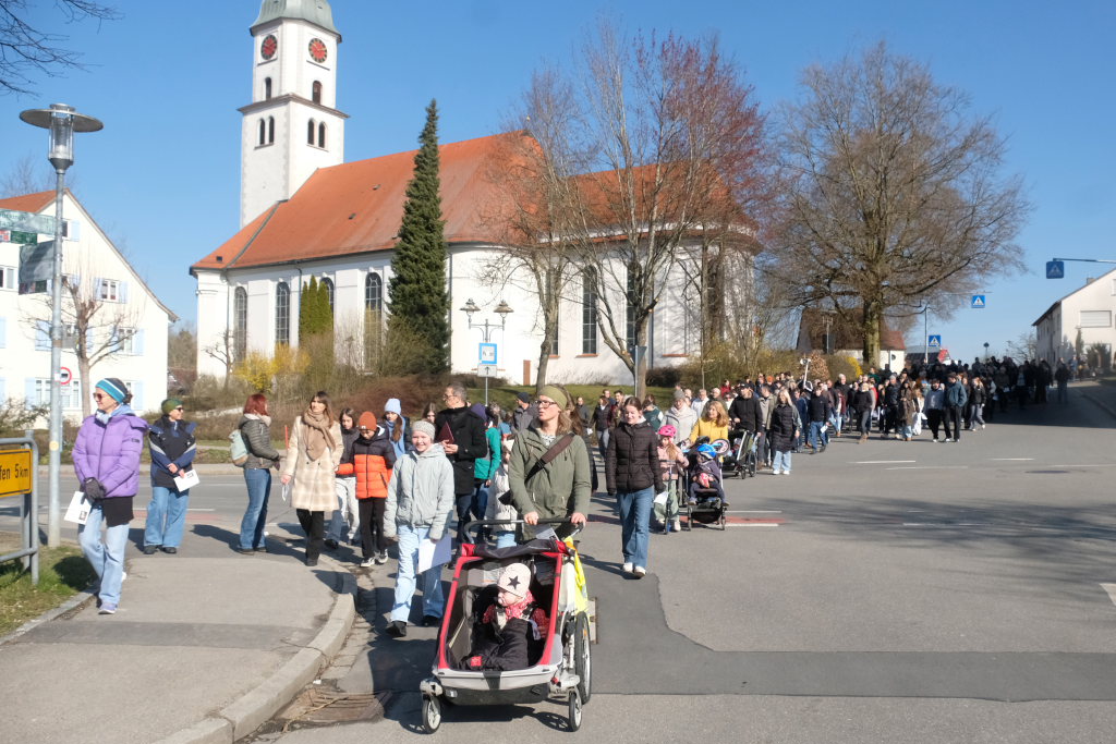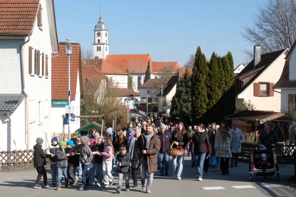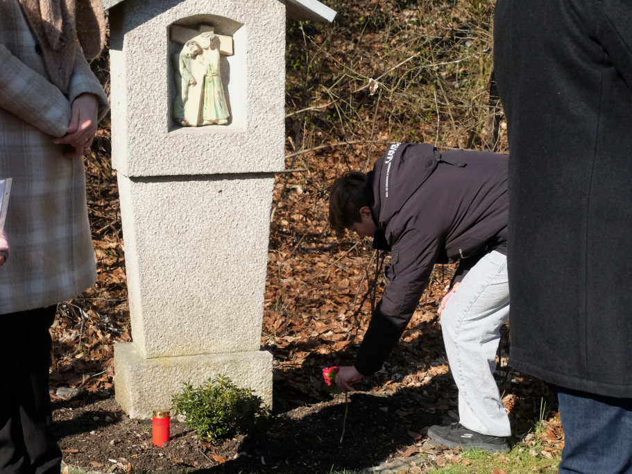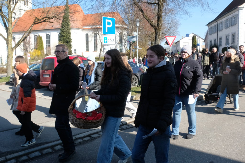 Bad Wurzach – Gemeinsam mit dem Pastoralreferenten Raimund Miller startete an diesem Karfreitagvormittag eine große Zahl von Familien vom Pius-Scheel-Haus hinauf zum Gottesberg, um die Leidensgeschichte Jesu an den 14 Kreuzwegstationen nachzuvollziehen. Seit mehr als 20 Jahren gibt es diese Tradition, die sich alljährlich immer größerer Beliebtheit erfreut. Neu war in diesem Jahr die musikalische Unterstützung durch Kirchenmusiker Robert Häusle und den Posaunenchor der evangelischen Kirchengemeinde. Zum Gedenken an das Sterben Jesu am Kreuz wurde von FirmbewerberInnen an jeder Station ein Grablicht abgestellt sowie eine Rose abgelegt.