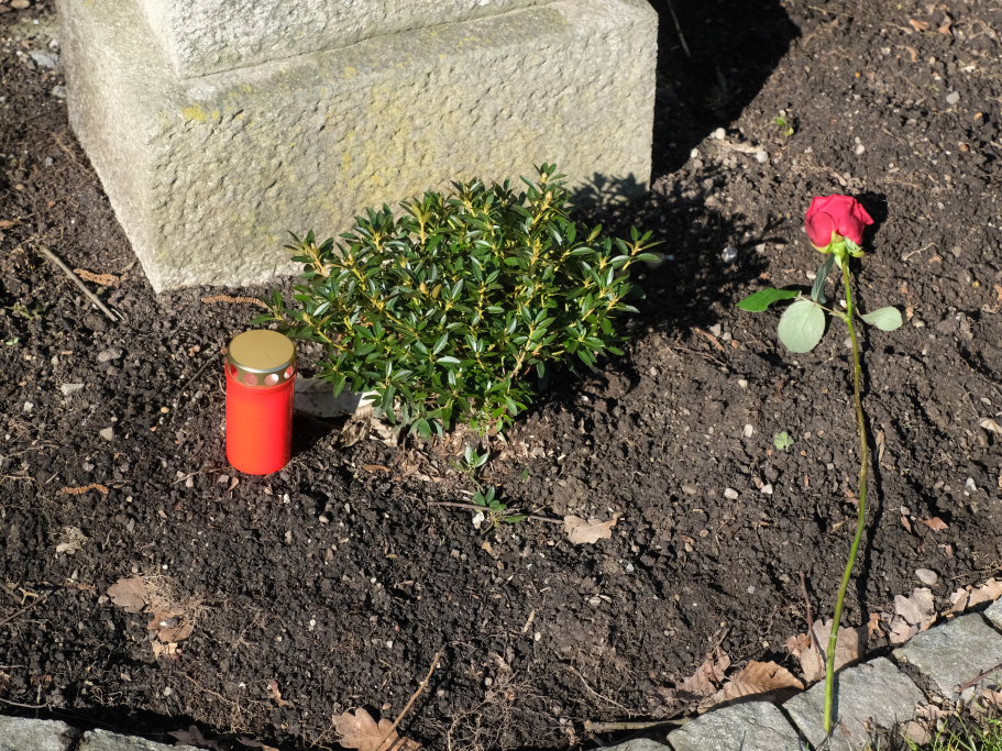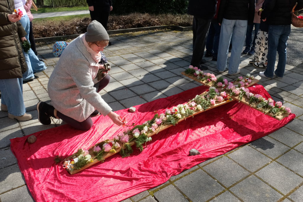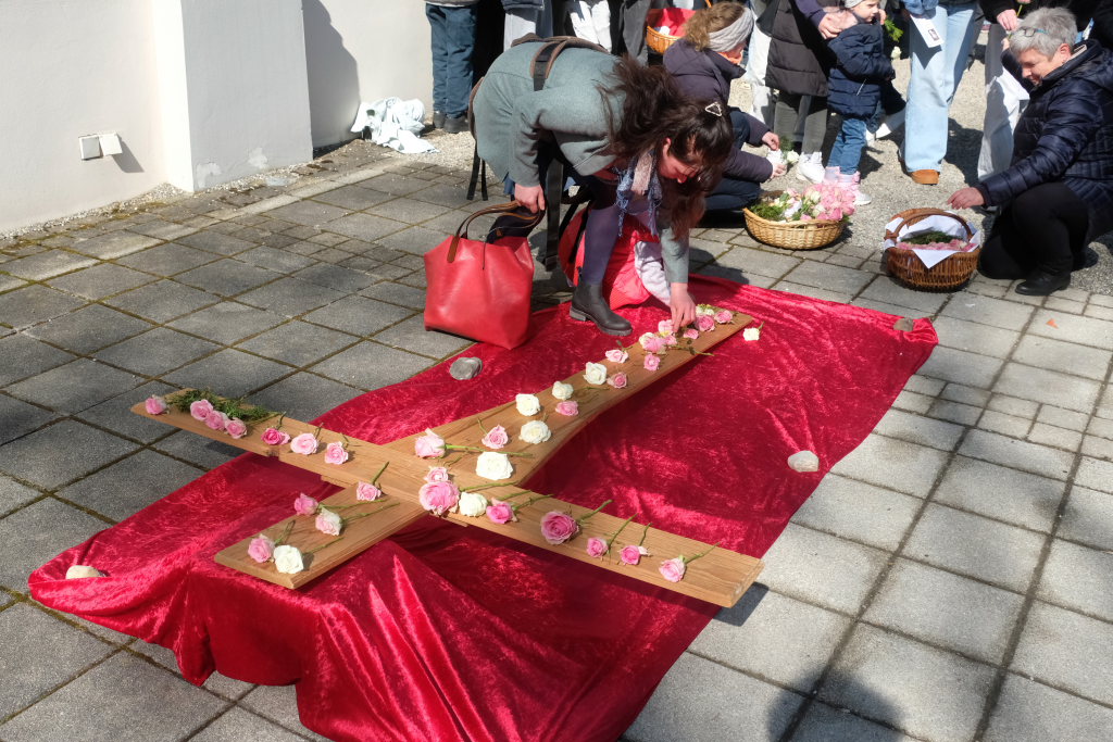 Nur wenige Schritte weiter, dort, wo im Juli alljährlich unter dem Baldachin das Heilig-Blut-Fest gefeiert wird, endet wieder die diesjährige Prozession: Das von den Kommunionkindern mit zum Gottesberg hinaufgetragene Kreuz findet auf roten Samt gebettet seine Ruhestätte. Dank einer großzügigen Blumenspende konnte jeder Teilnehmer an der Kreuzweg-Prozession dieses Kreuz als Symbol von Tod und Auferstehung zu einer wunderbaren, farbenfrohen Glaubensdemonstration mitgestalten.