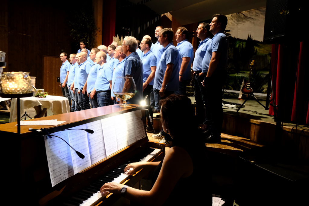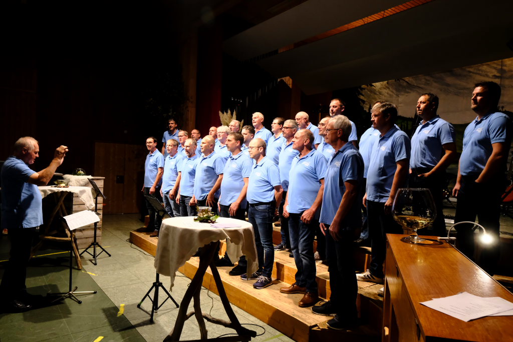 Mit dem schwungvollen „Musik kennt keine Grenzen“ ,das 1987 durch die Fischer-Chöre einem großen Publikum bekannt wurde, starteten Dirigent Erich Minsch und seine gut 30 Sänger des Männerchores gemeinsam mit ihrer Pianistin Christiane Pfänder in ihr diesjähriges Weinfest-Programm, dem sie gleich noch das zum Schunkeln einladende – passend zum Anlass Weinfest – „Weinland“ folgen ließen.