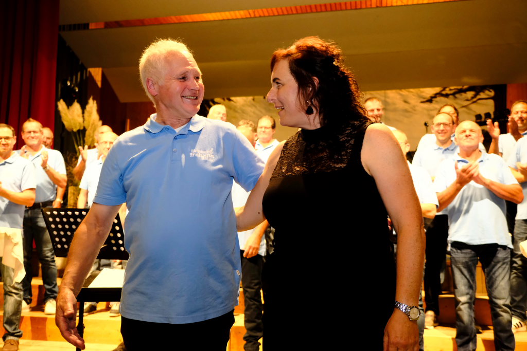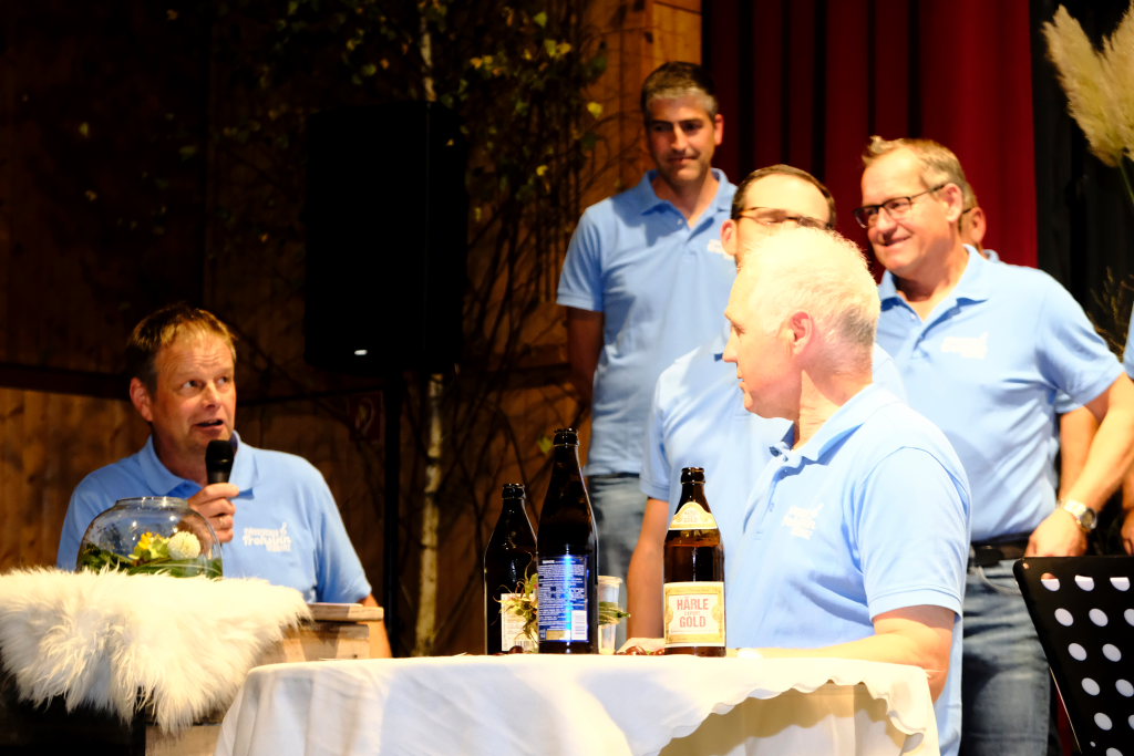 Mit einem weiteren etwas modernen Trinklied „An der Bar“, bei dem die „Vorsänger“ tatsächlich an einer vor der Bühne aufgebauten Bar lehnten, war jedoch noch nicht Schluss. Vorstand Stefan Veser bedankte sich zuerst bei den Sängerfrauen, die an Theke und als Bedienung großen Anteil am Gelingen des Abends hatten. Präsente gab für die Pianistin Christiane Pfänder und für Dirigent Erich Minsch, „ohne den gar nichts geht“ (O-Ton Veser).
