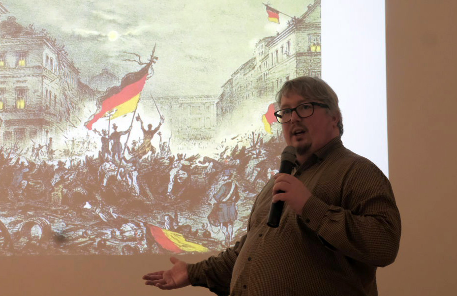 Stadtarchivar Wild vor einer Darstellung der Revolution von 1848 (vermutlich eine Szene in Berlin). Die letztlich in der Machtfrage als gescheitert geltende Revolution hatte doch Einiges bewirkt: So endete das Lehenswesen in der Landwirtschaft, die Höfe gingen in das Eigentum der Bauern über.
