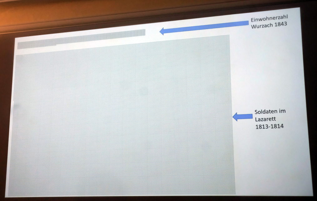 Zwischen 1813 und 1814 wurden während der Befreiungskriege in Wurzach insgesamt 35.301 österreichische Soldaten und 9724 Pferde verpflegt. Das Leprosenhaus wurde für insgesamt 4003 der verwundeten Soldaten der durchziehenden Armee zum Lazarett umfunktioniert, heißt es in der Internet-Enzyklopädie „wikipedia“. Leopold Fürst von Waldburg-Wurzach ließ 1861 ein Denkmal für jene 16 Soldaten errichten, die während des Aufenthalts am Leprosenhaus starben. Stadtarchivar Wild machte mit obiger Grafik das Missverhältnis zwischen der Wurzacher Einwohnerzahl und der durchziehenden Armee deutlich.